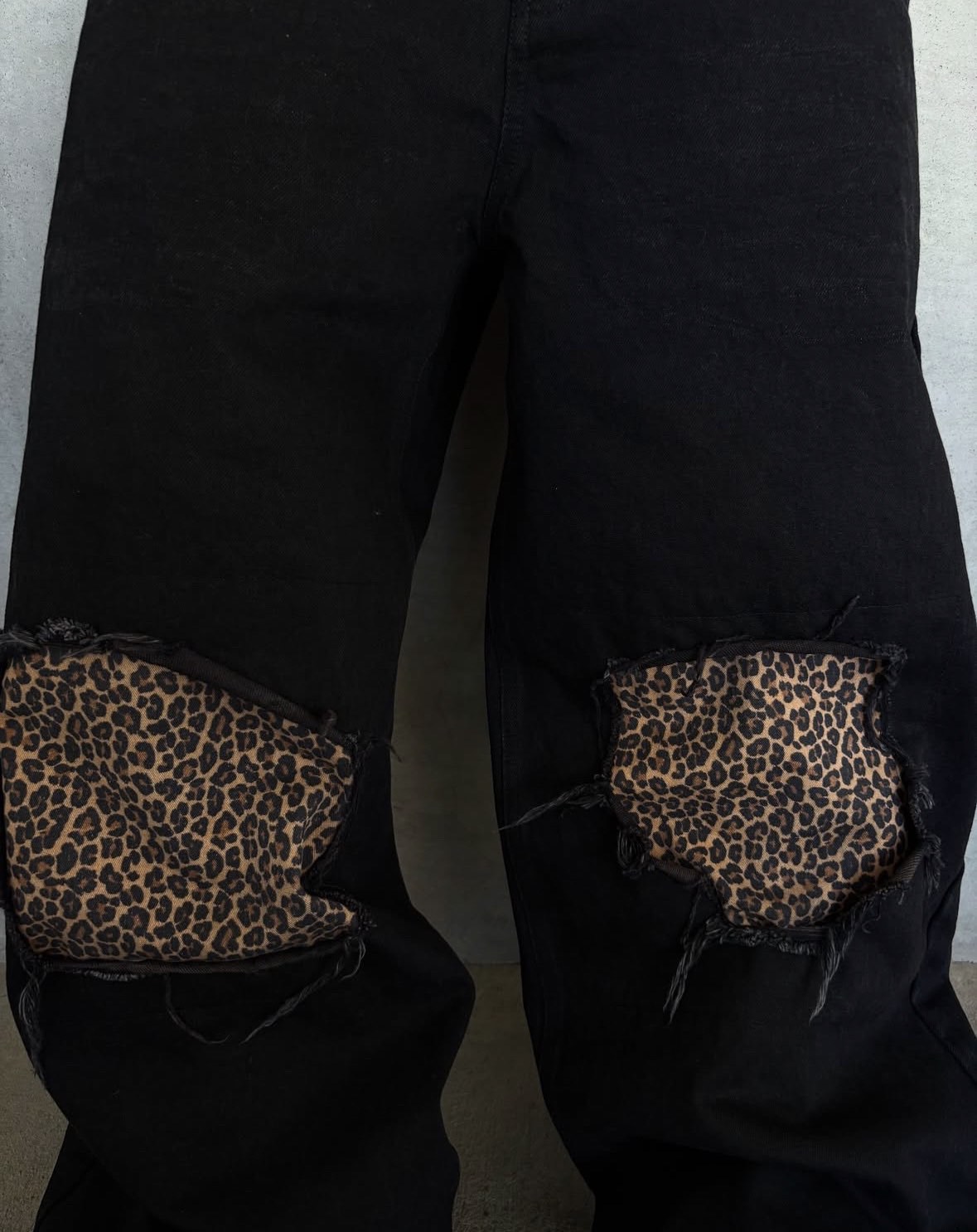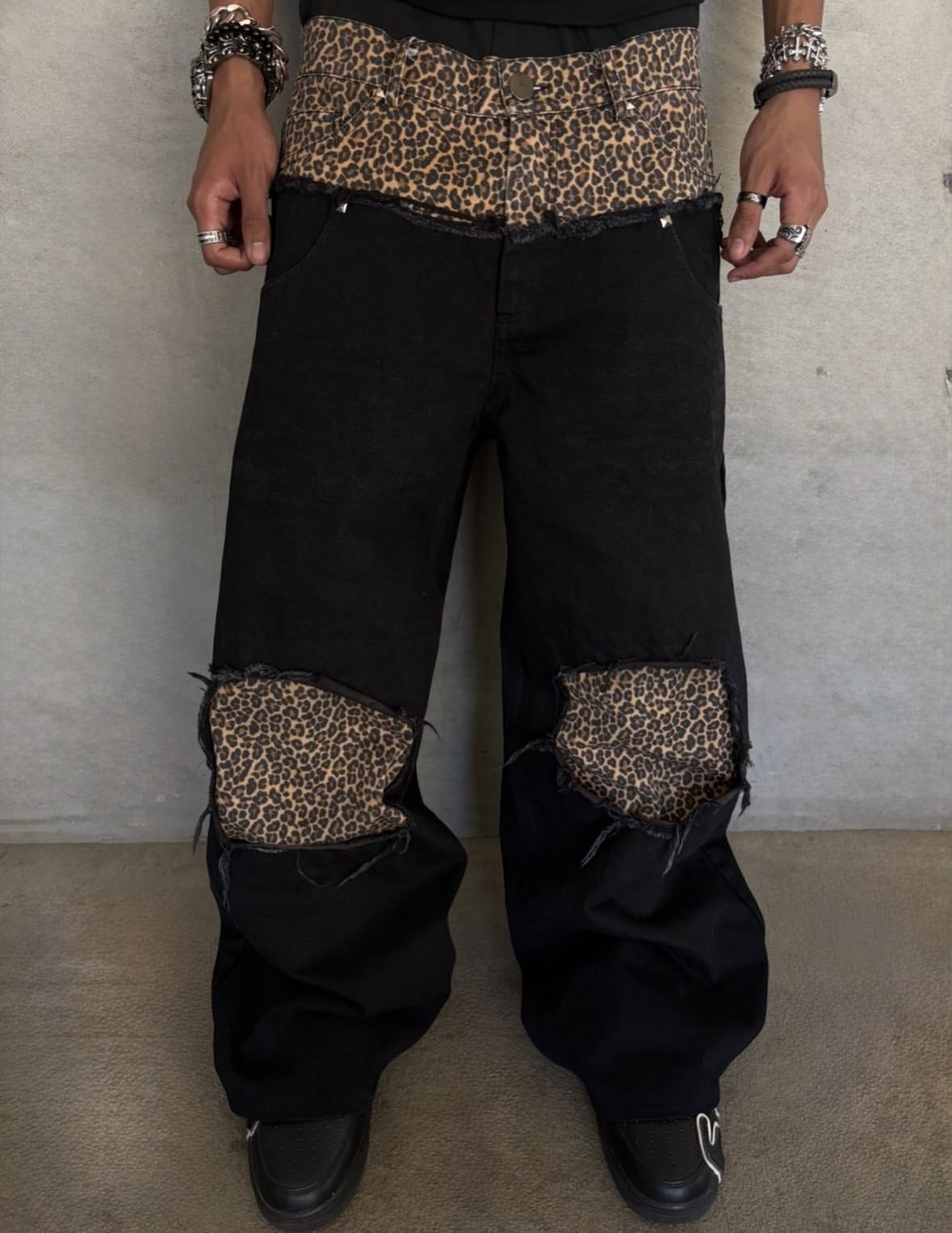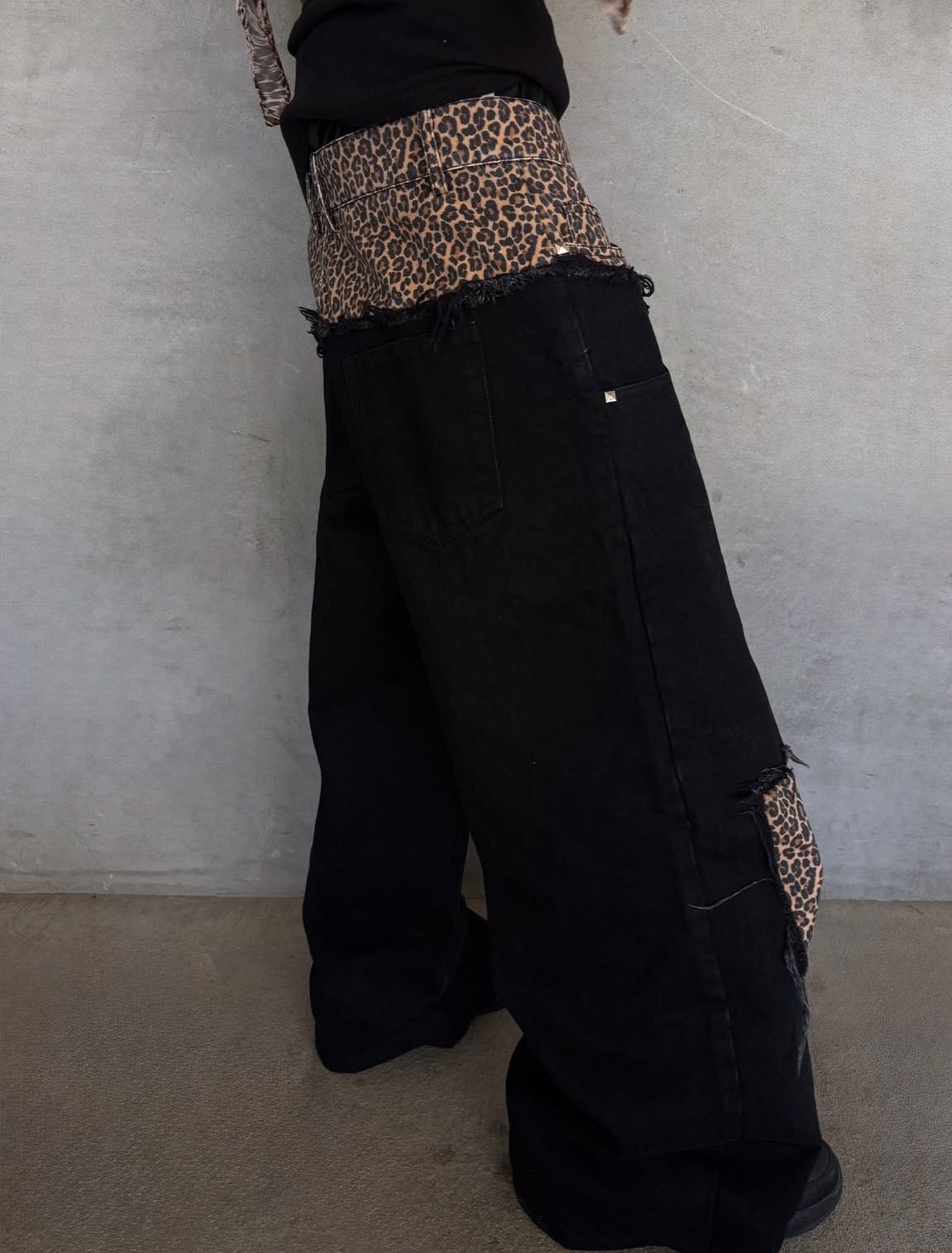 유럽과 미국의 복고풍 레오파드 프린트 스플 라이스 가짜 투피스 청바지 남성 하이 스트리트 힙합 루즈 하이 웨이스트 와이드 레그 캐주얼 바지스토어 가기