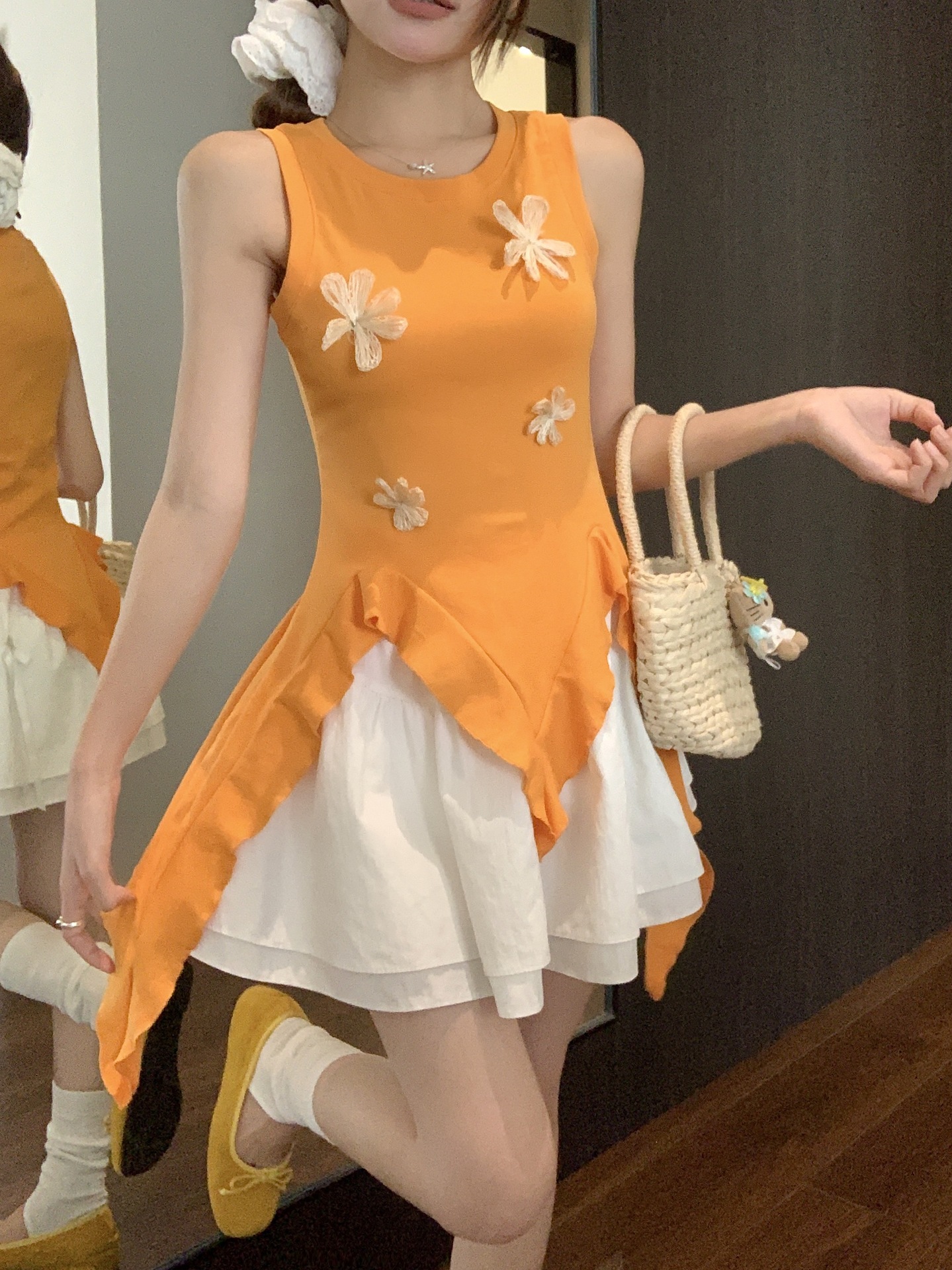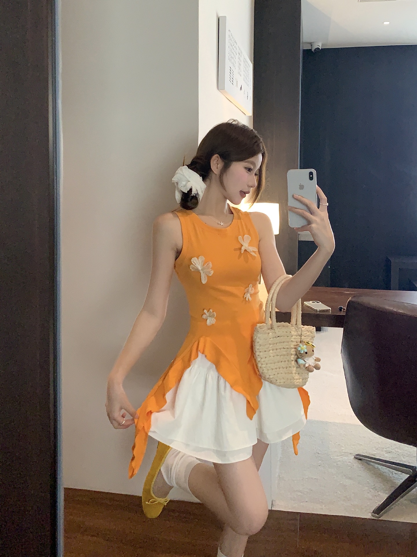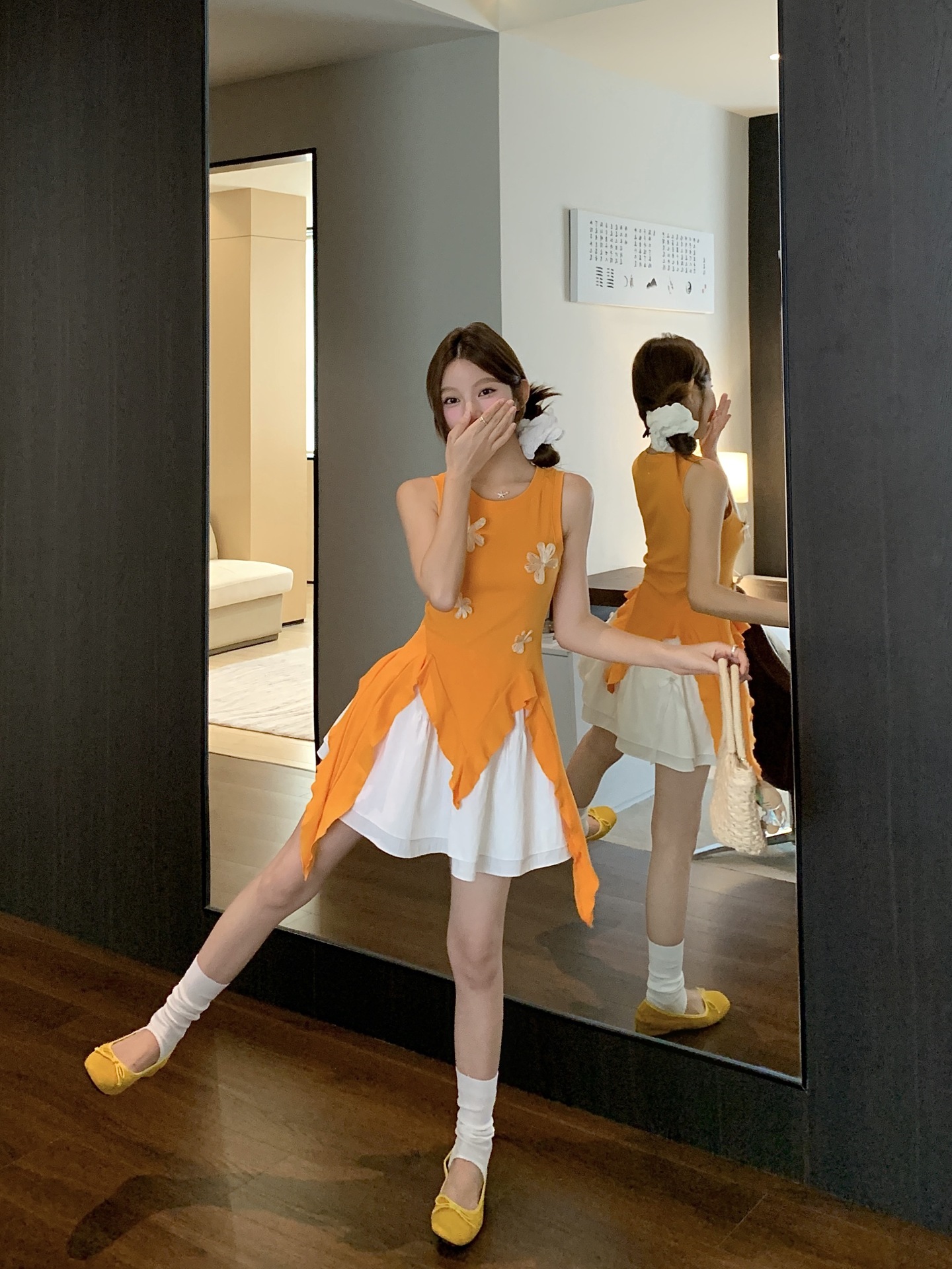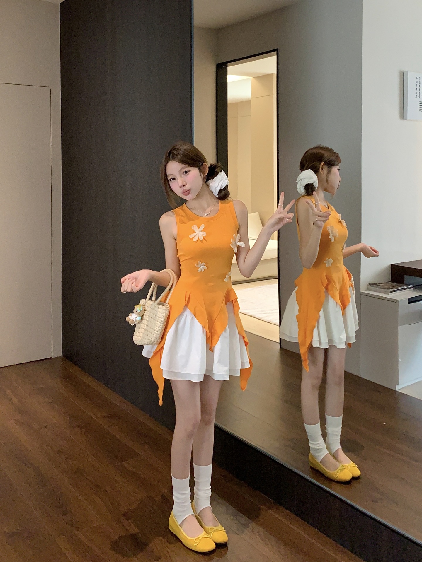 불규칙한 오렌지 꽃 캐미솔 여성 여름 달콤한 슬림 민소매 아우터 중간 길이 슬림 탑스토어 가기