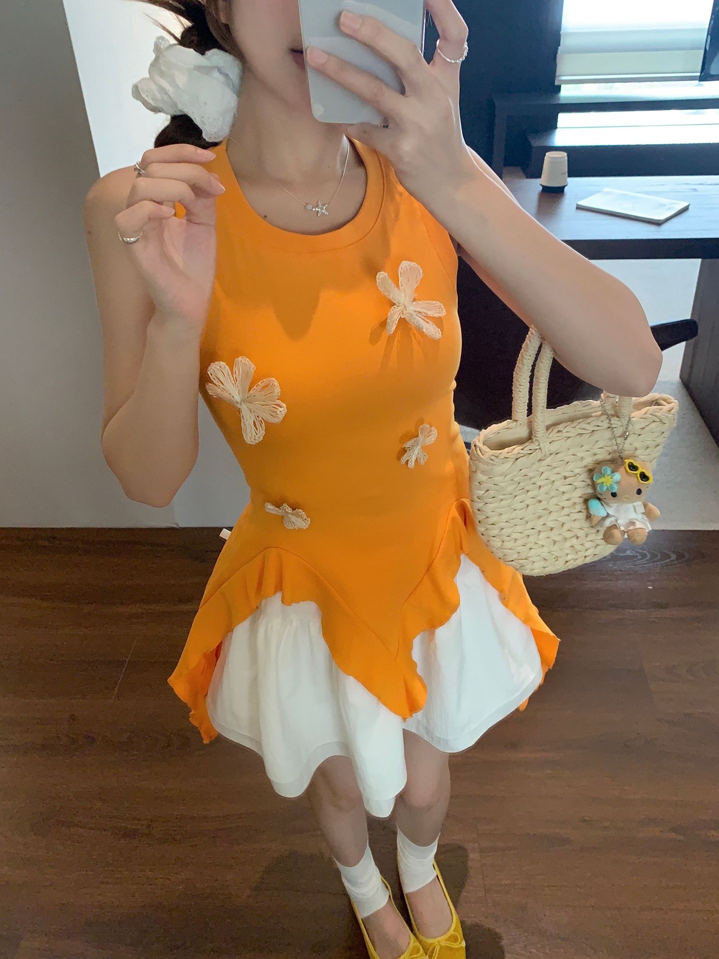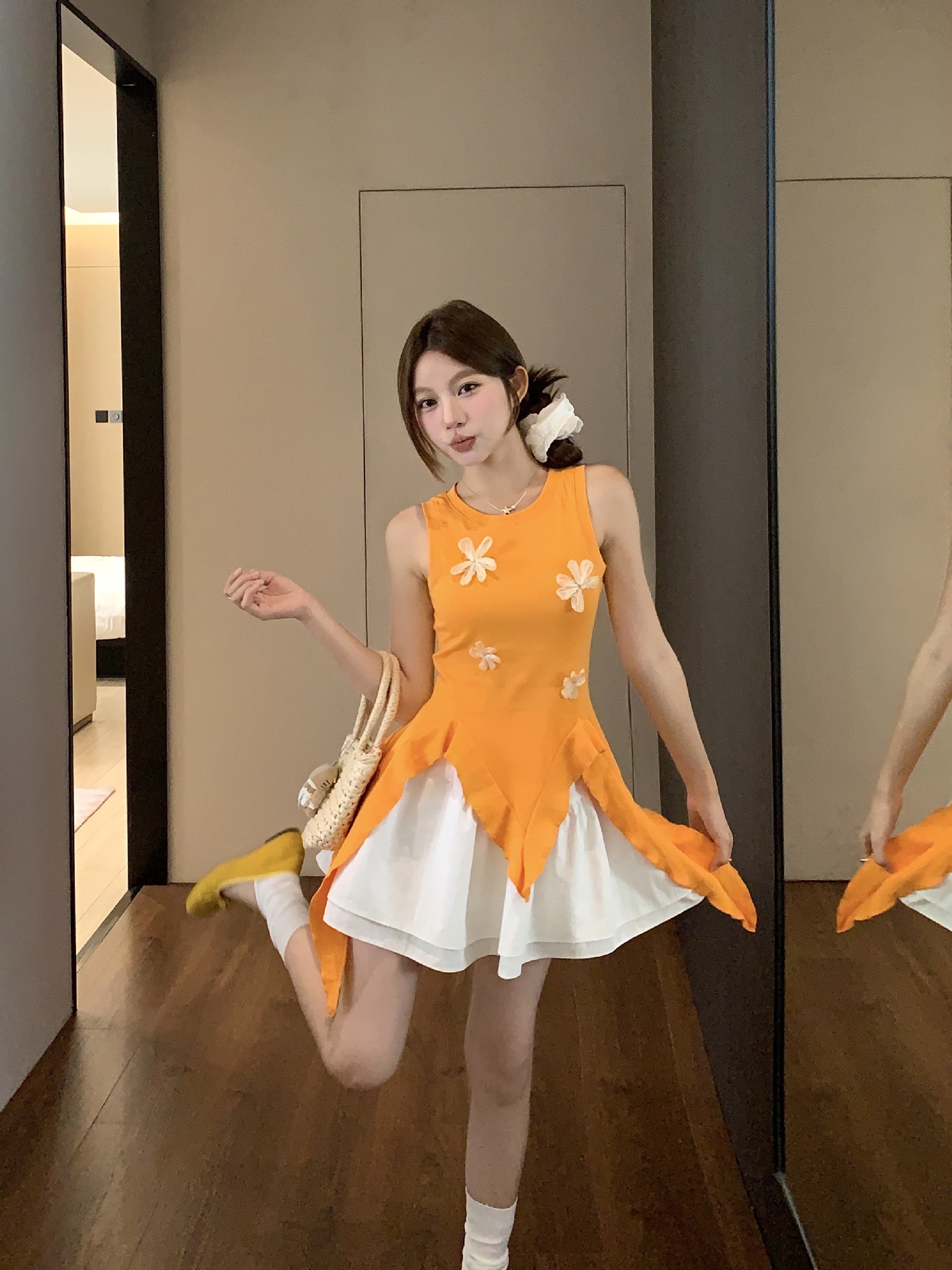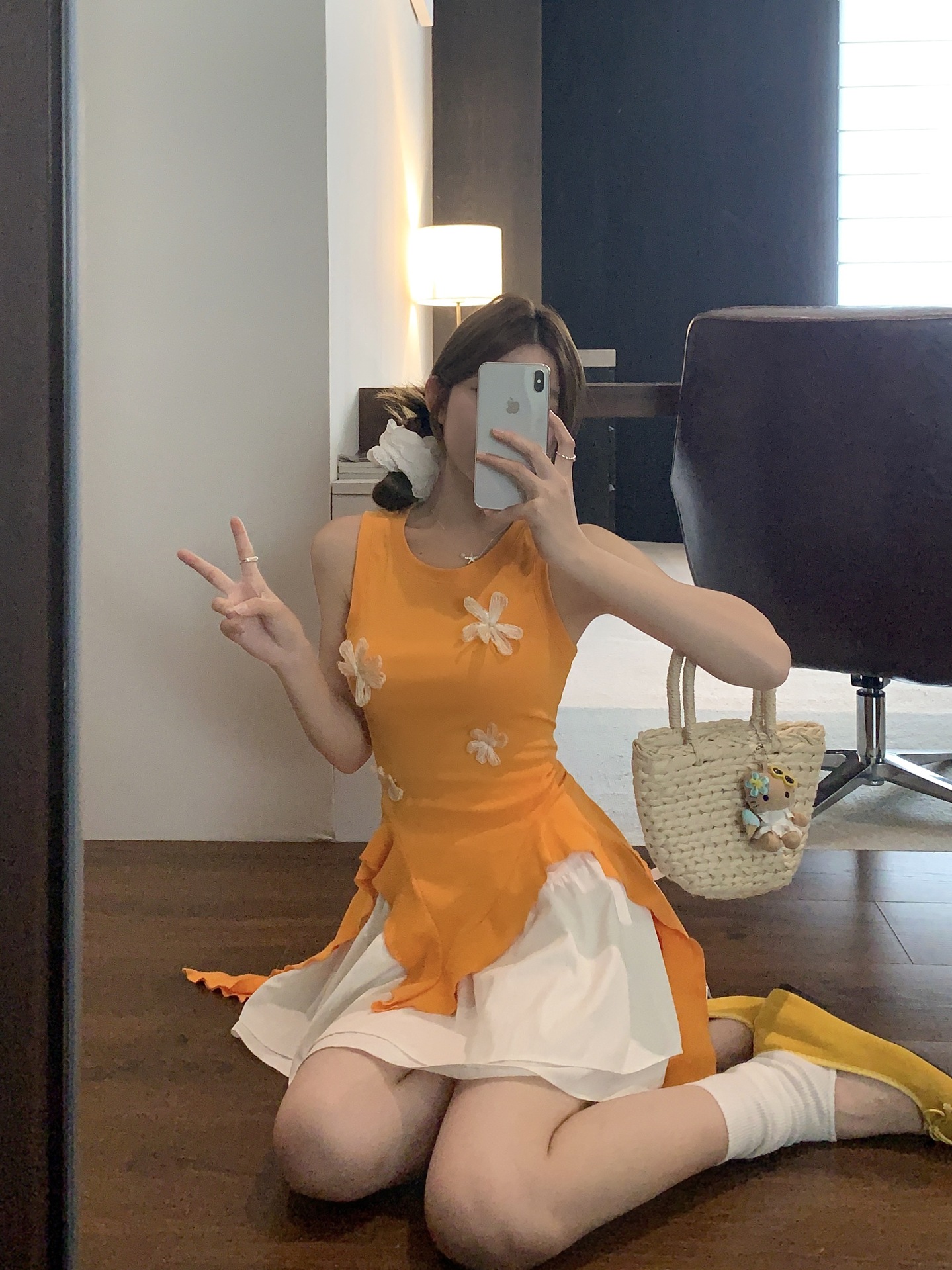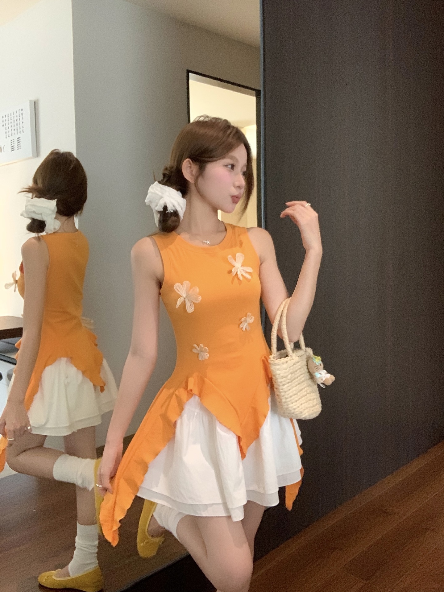 불규칙한 오렌지 꽃 캐미솔 여성 여름 달콤한 슬림 민소매 아우터 중간 길이 슬림 탑스토어 가기