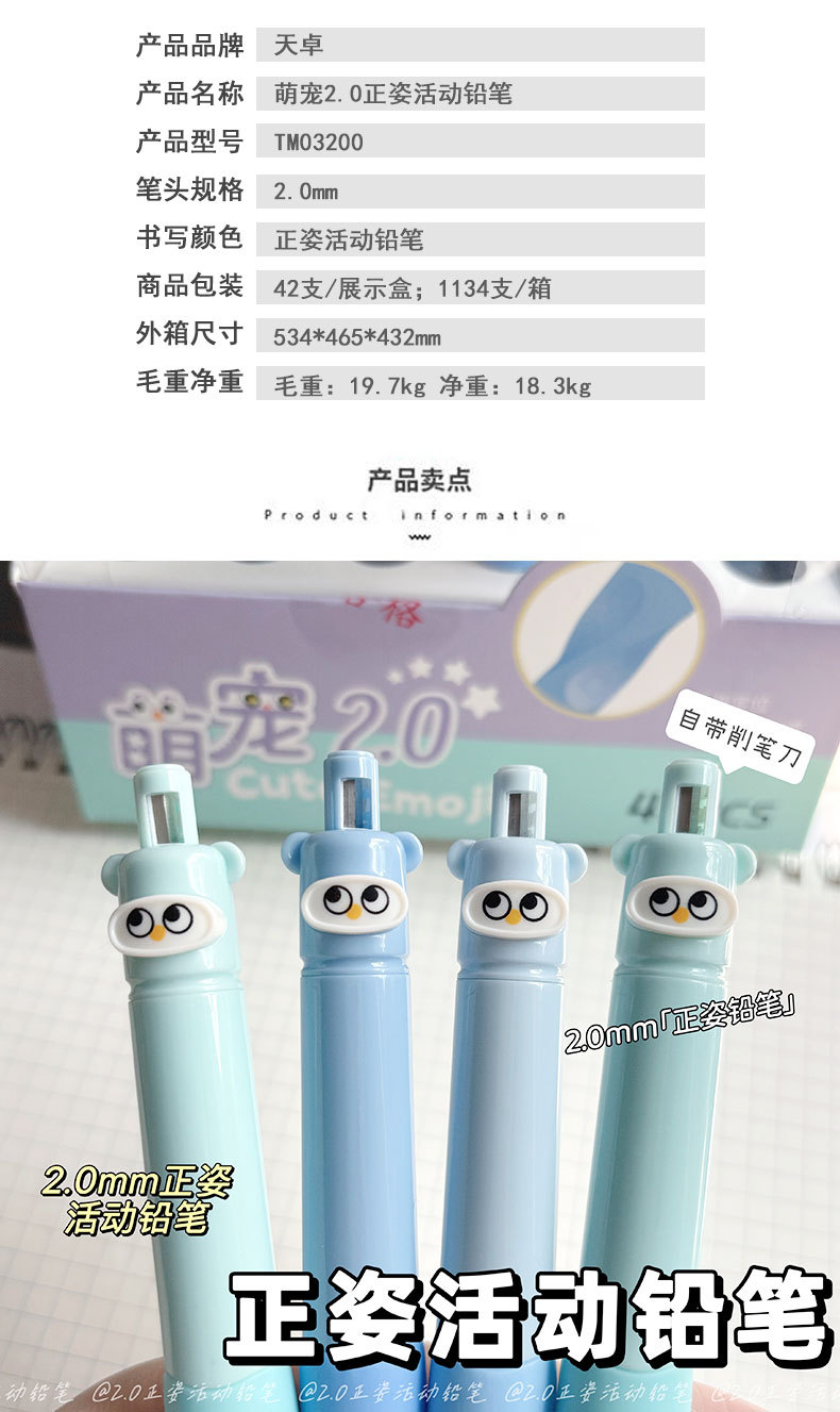 Tianzhuo 03200 뚱뚱하고 귀여운 애완 동물 초보자를위한 자동 연필 그립 자세 교정을위한 어린이 2.0 두꺼운 코어 샤프 펜슬스토어 가기