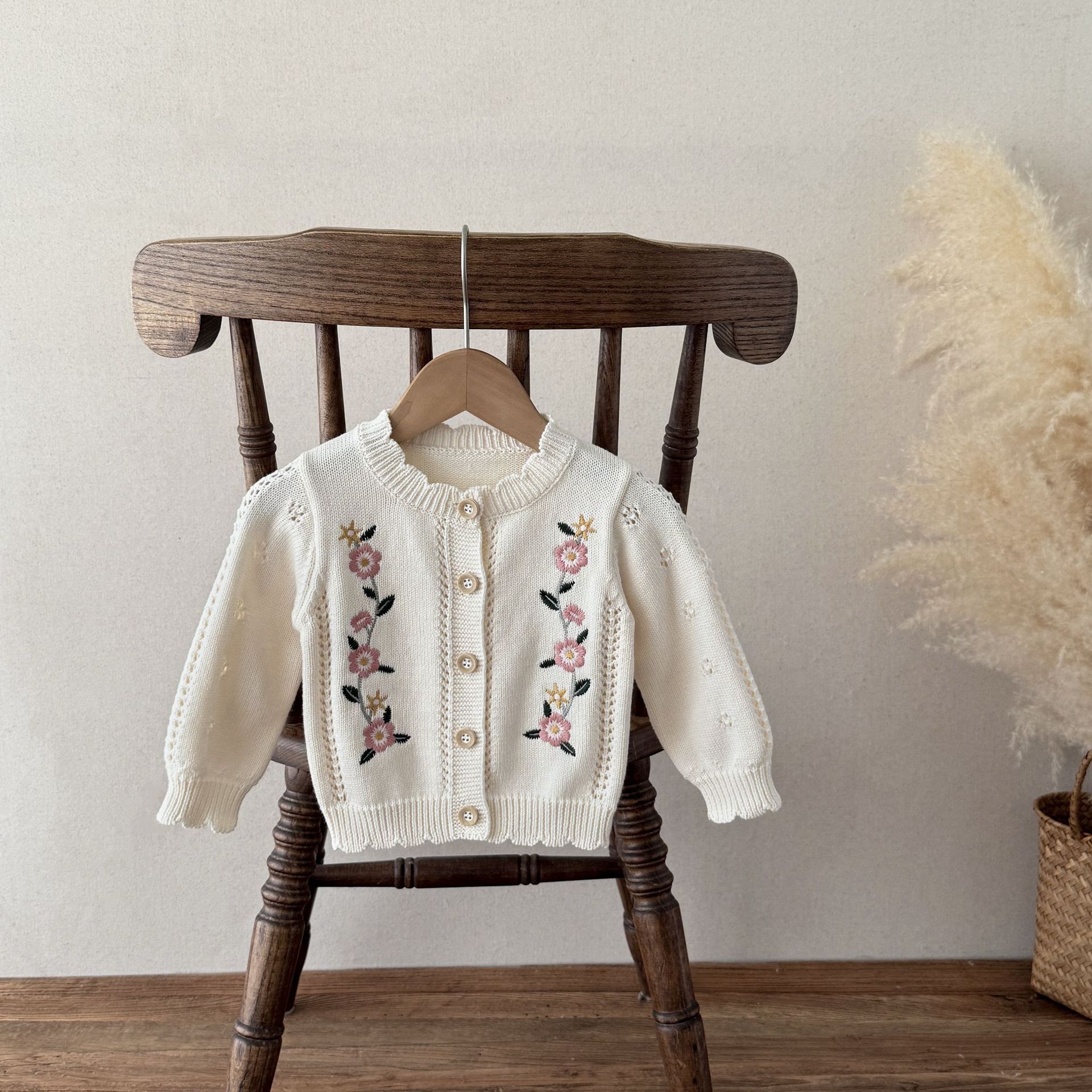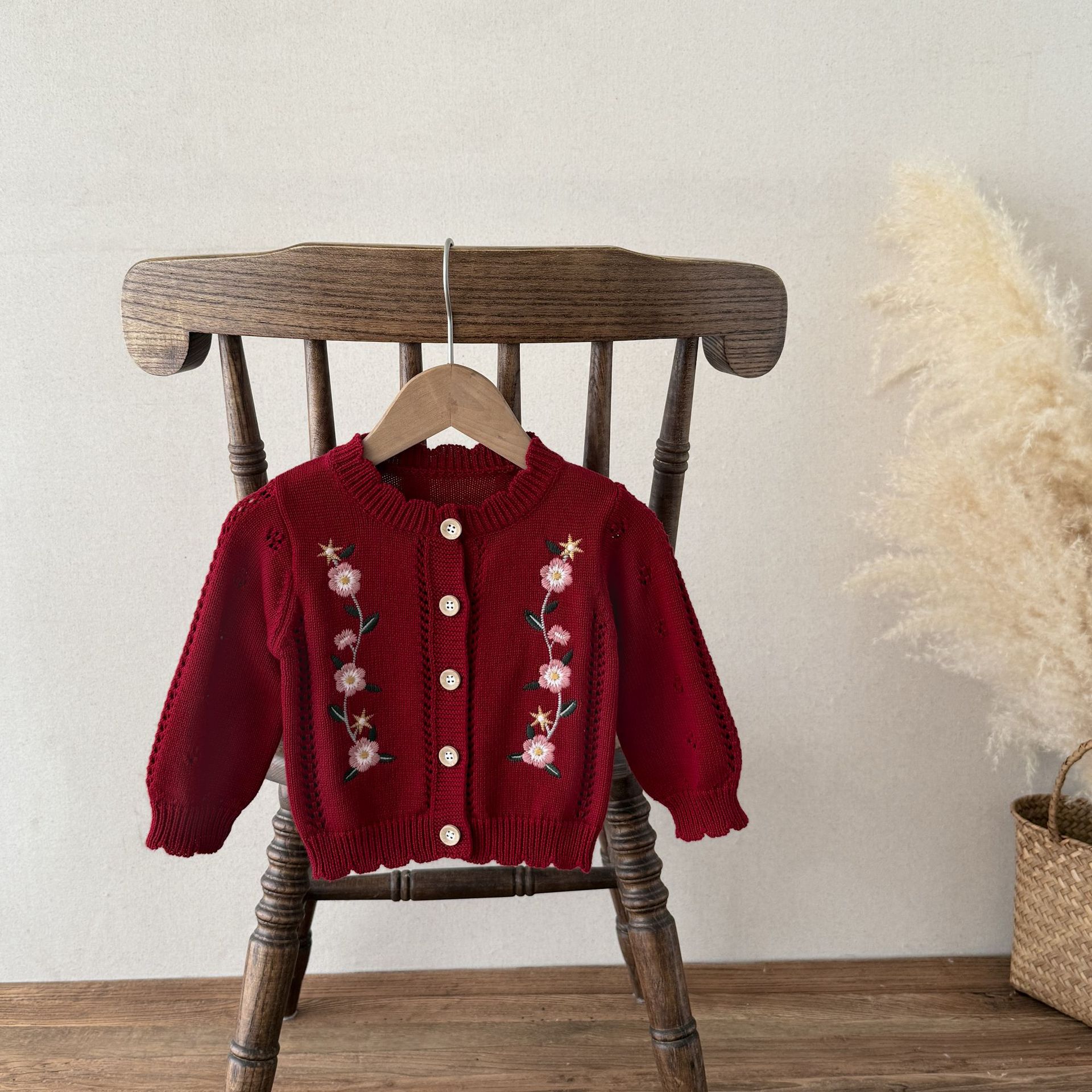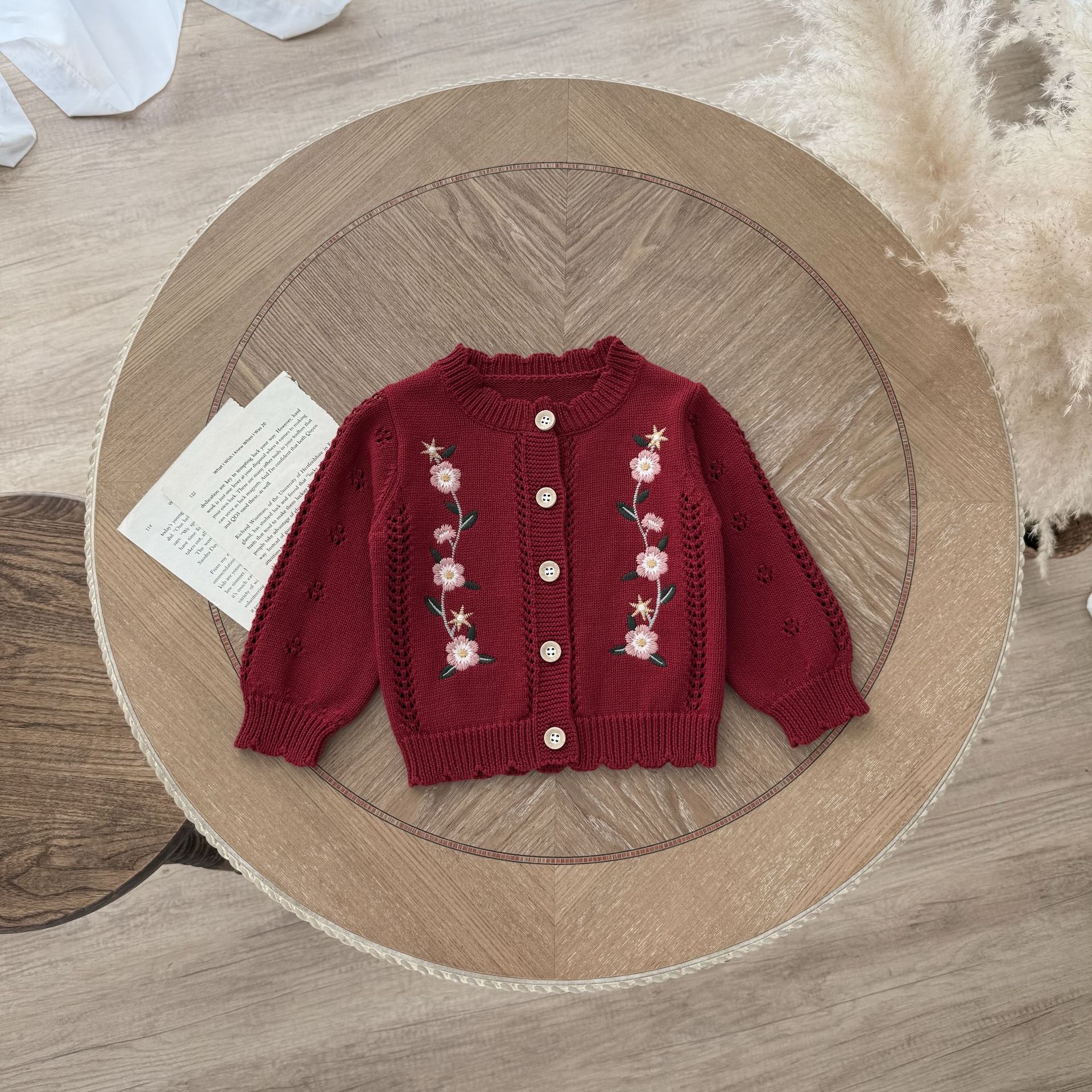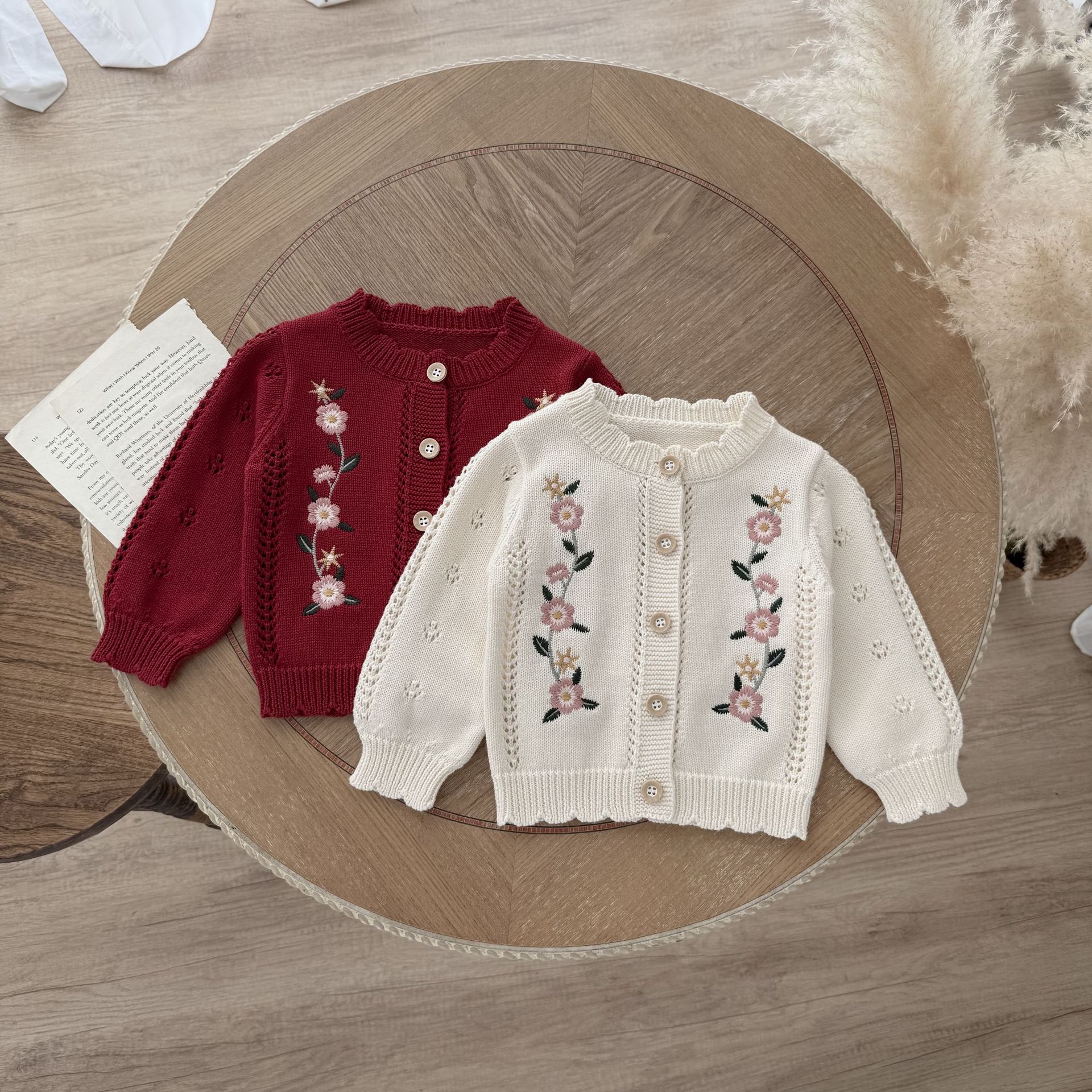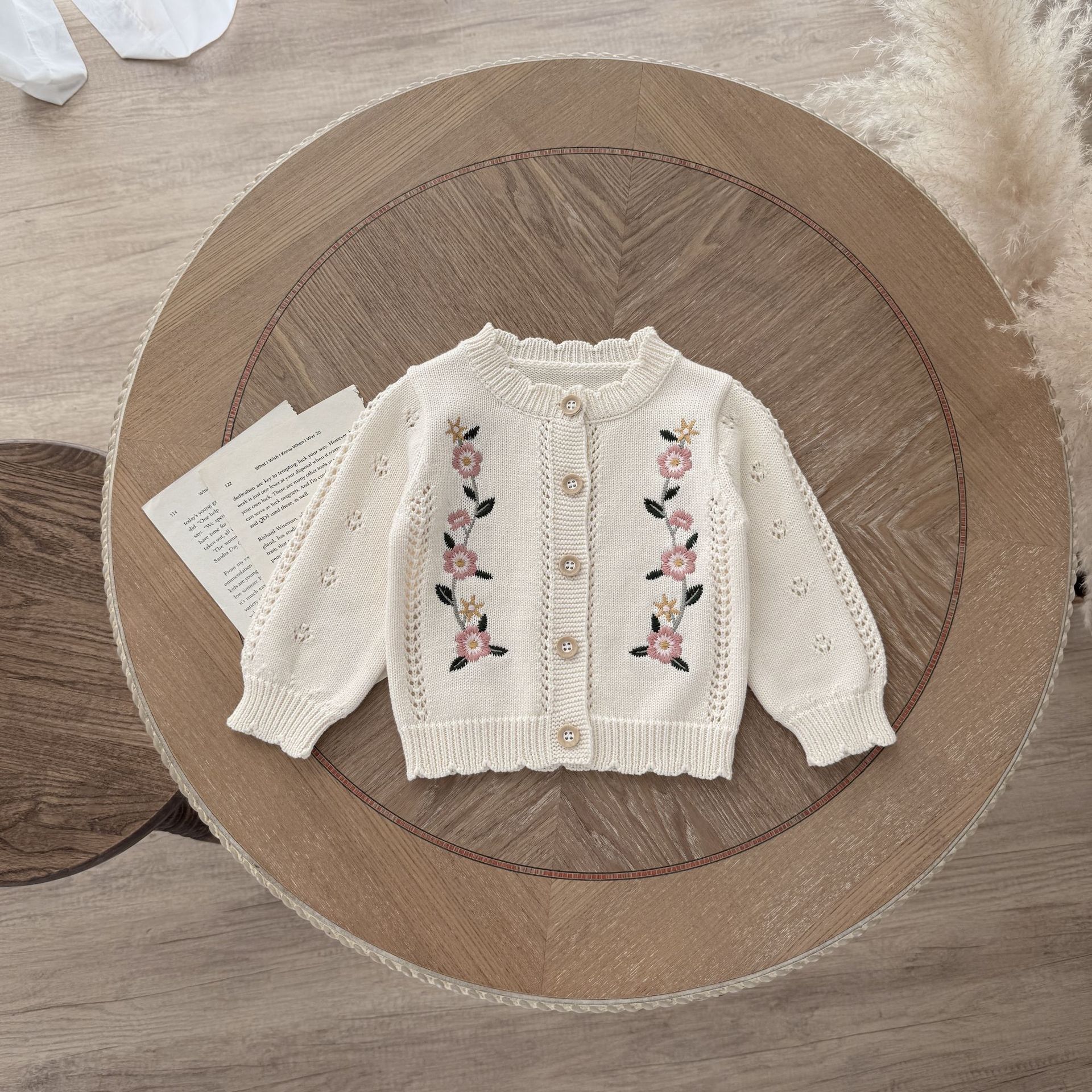 Ins 봄, 여름, 가을 아기 순수 코튼 중공 니트 카디건 아기 소녀 한국 스타일 라운드 넥 자수 꽃 니트 자켓
