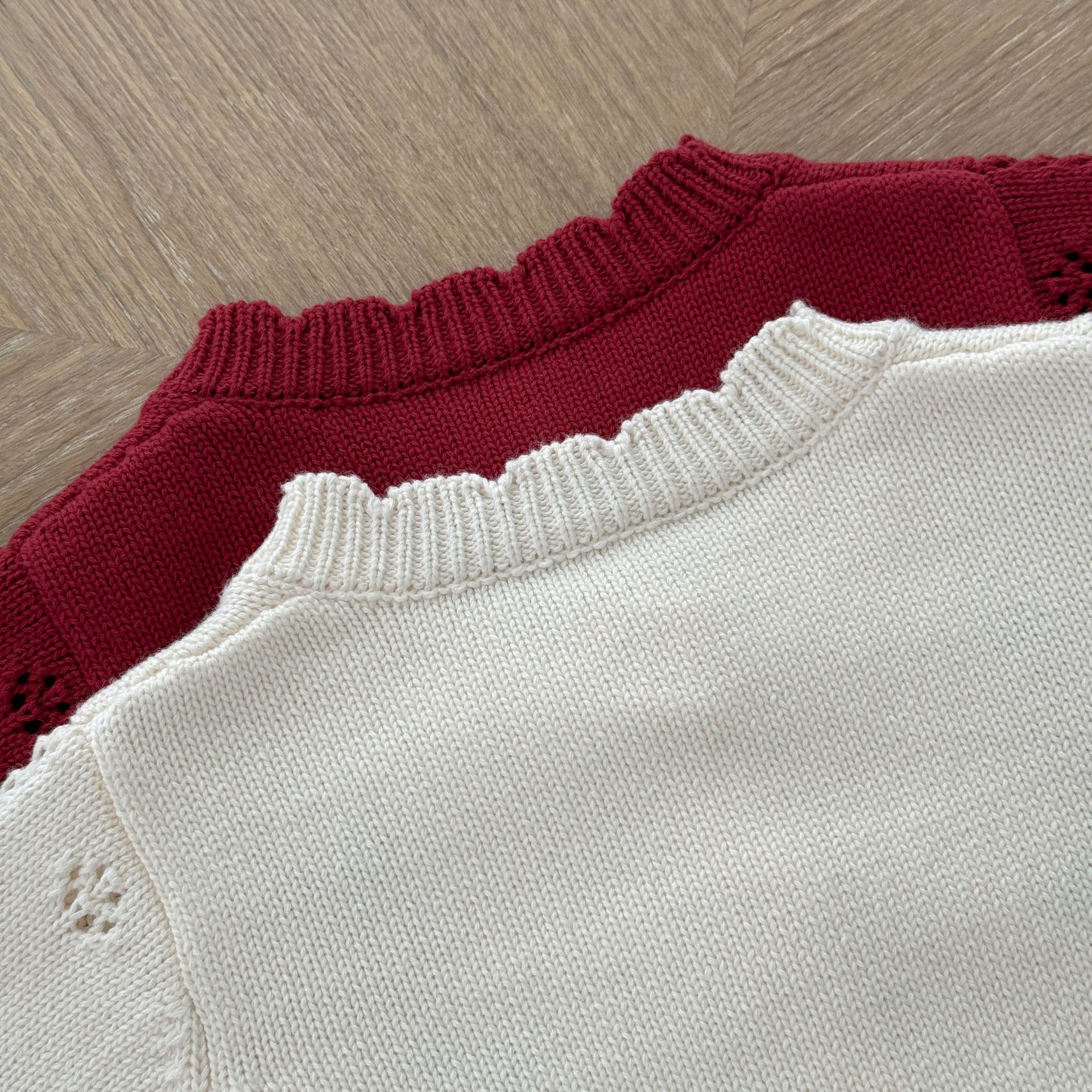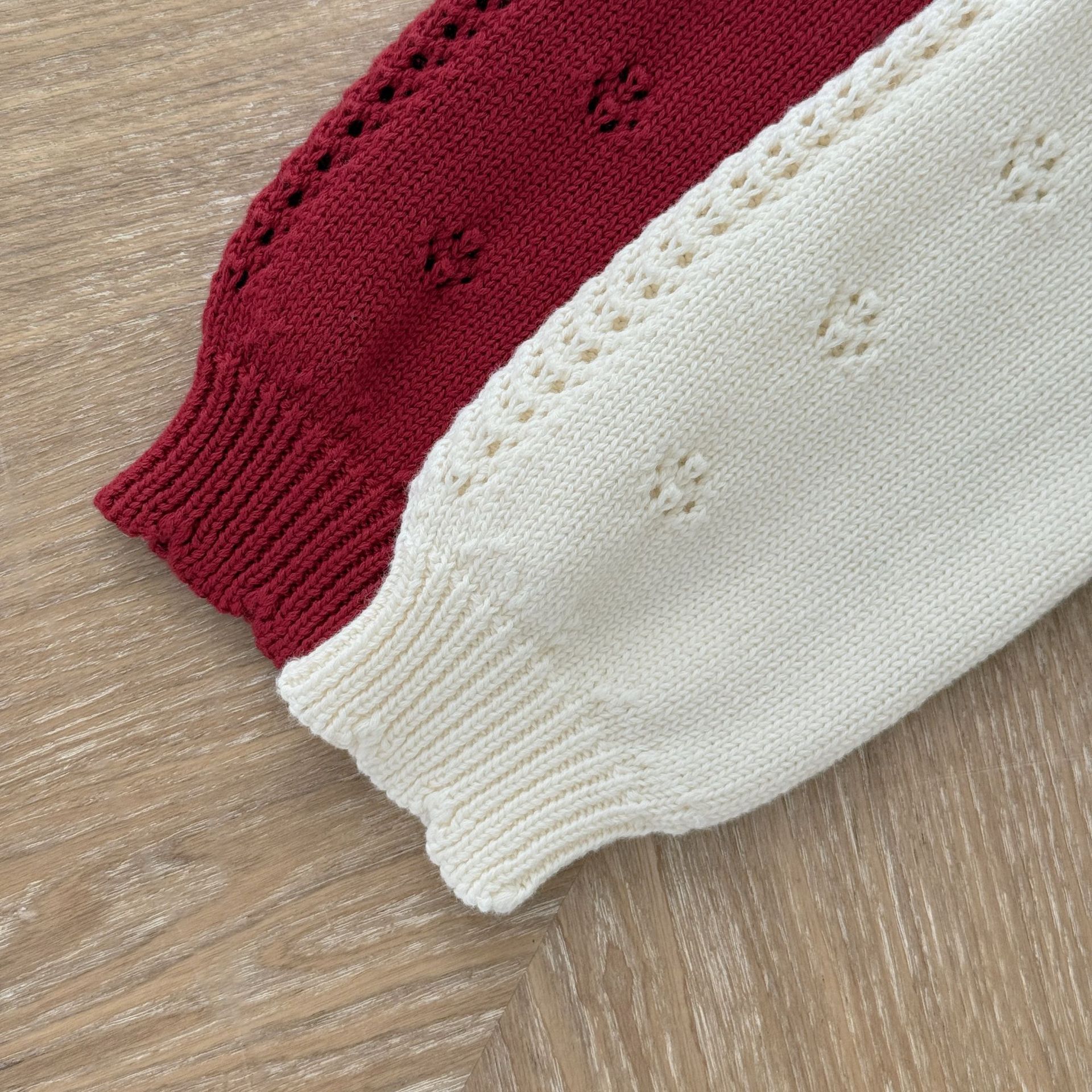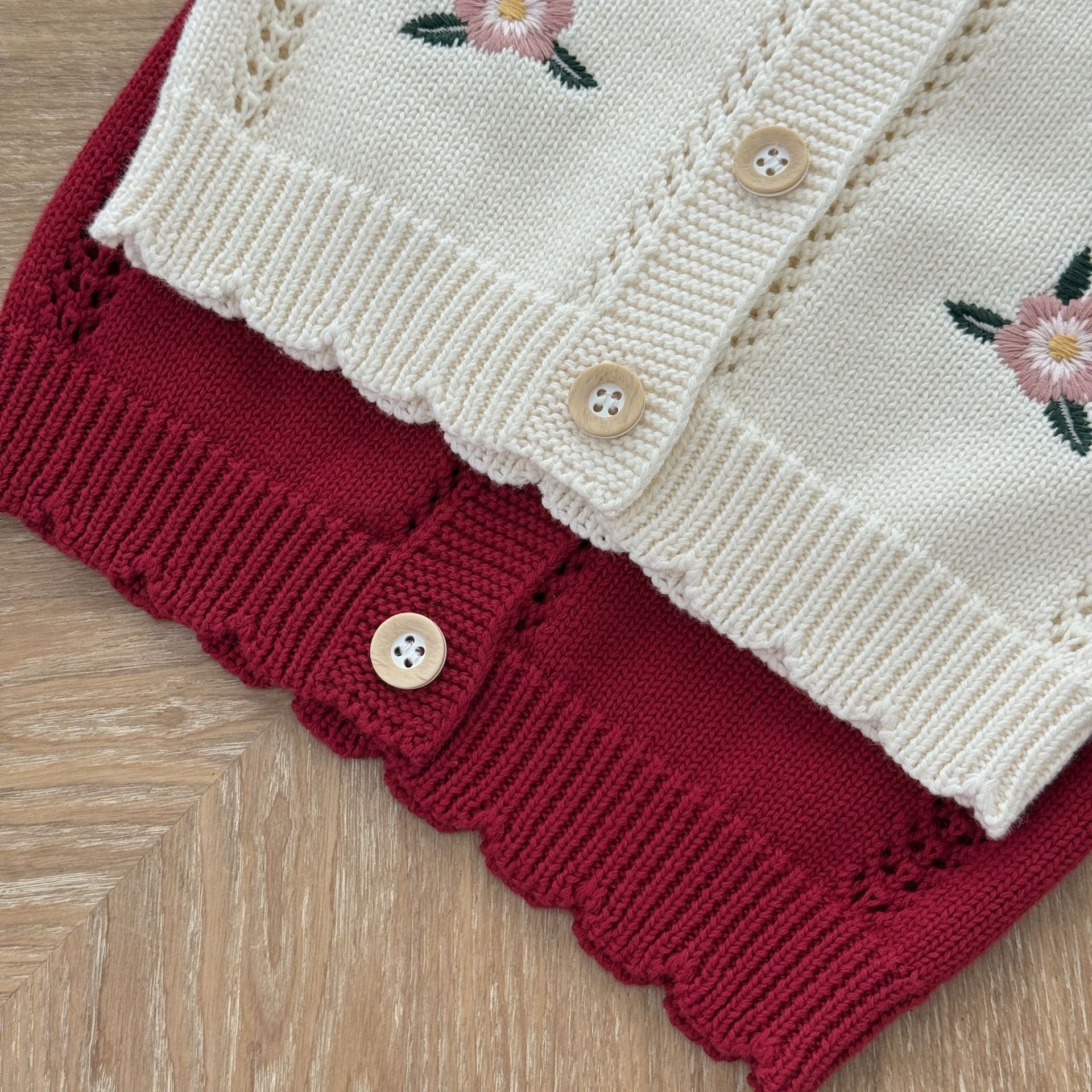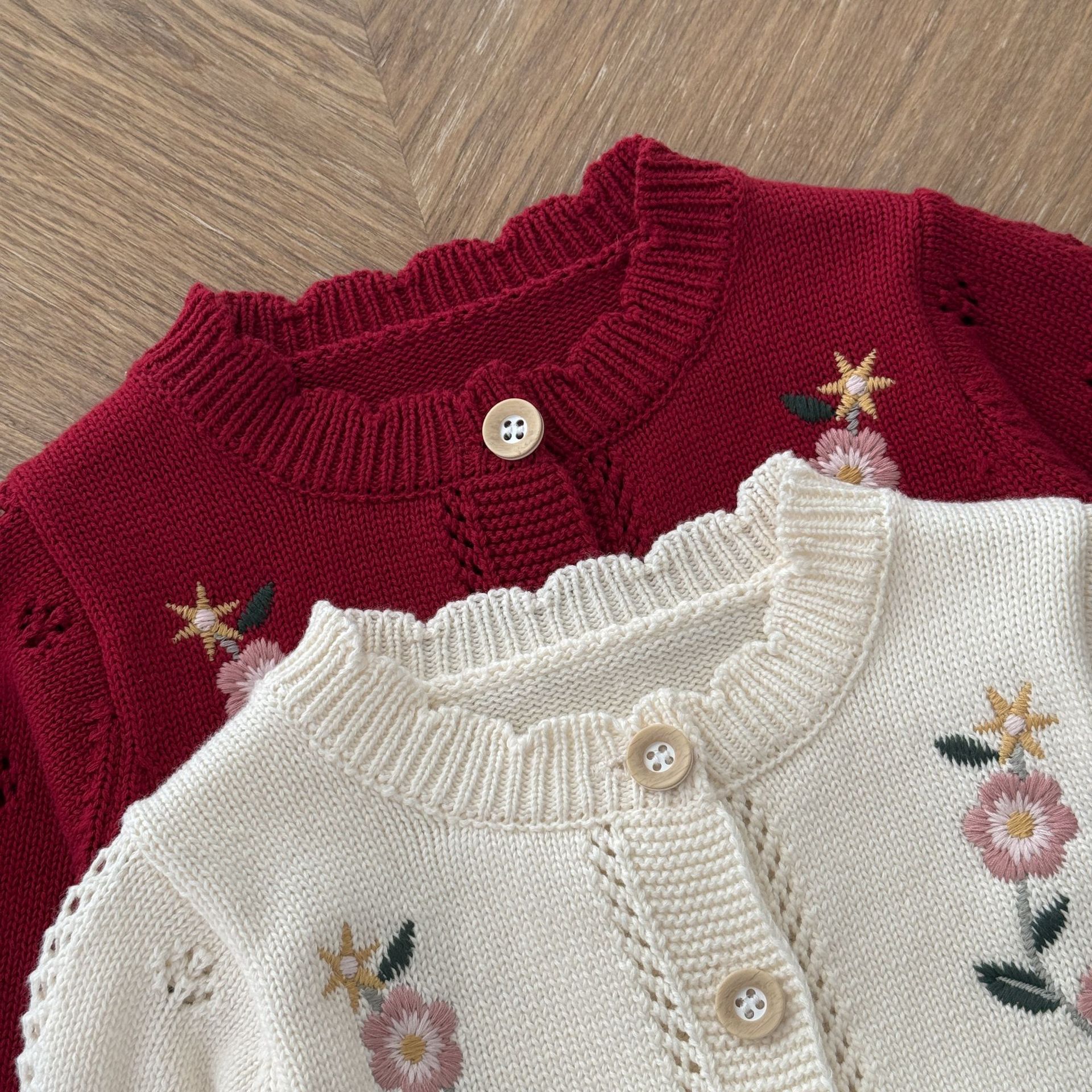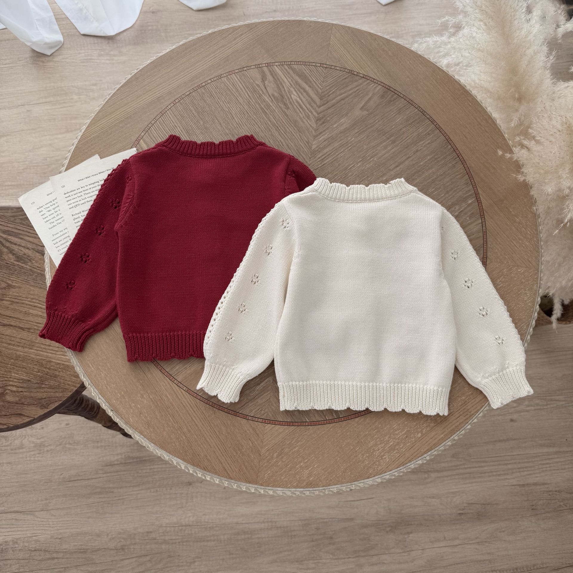 Ins 봄, 여름, 가을 아기 순수 코튼 중공 니트 카디건 아기 소녀 한국 스타일 라운드 넥 자수 꽃 니트 자켓