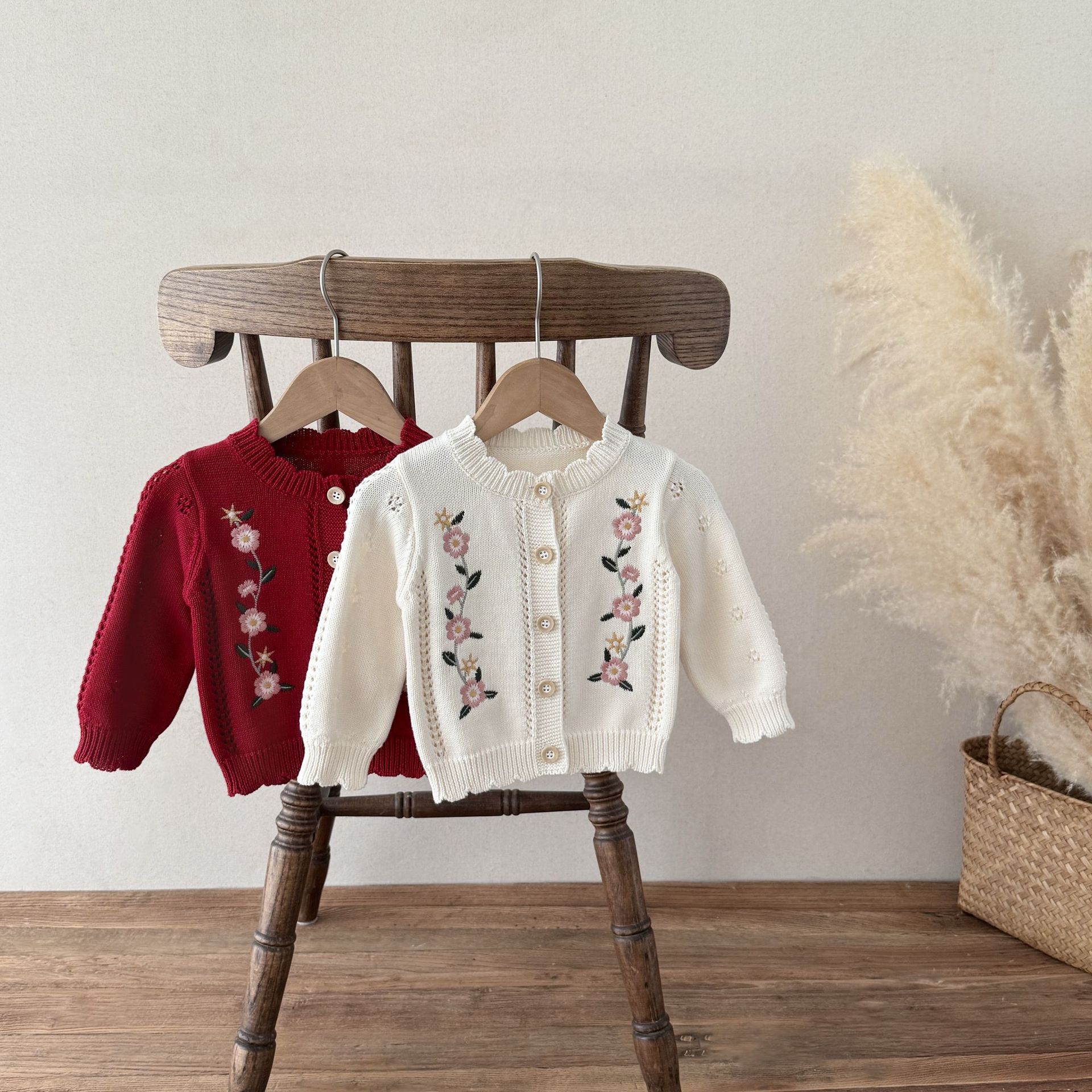 Ins 봄, 여름, 가을 아기 순수 코튼 중공 니트 카디건 아기 소녀 한국 스타일 라운드 넥 자수 꽃 니트 자켓스토어 가기