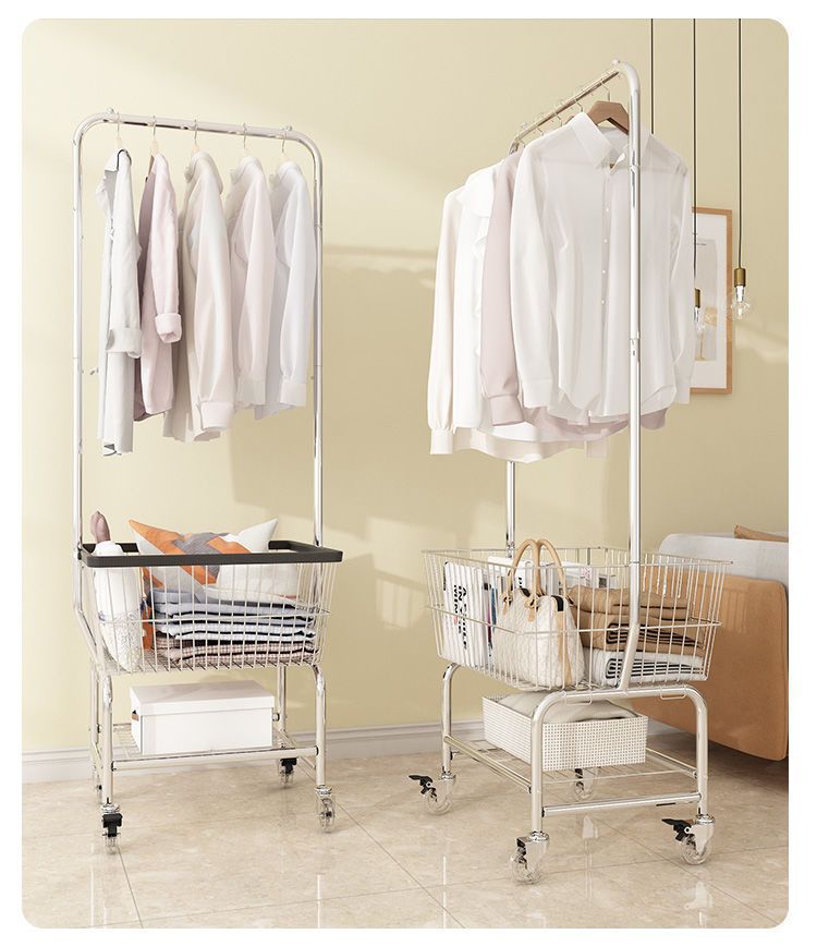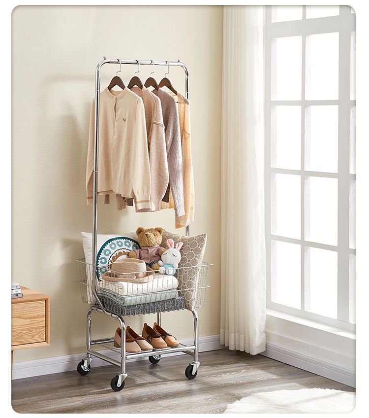 간단한 코트 랙, 바닥 스탠딩 침실 보관 랙, 가정용 보관 바구니, 의류 매장 이동식 옷 랙 트롤리