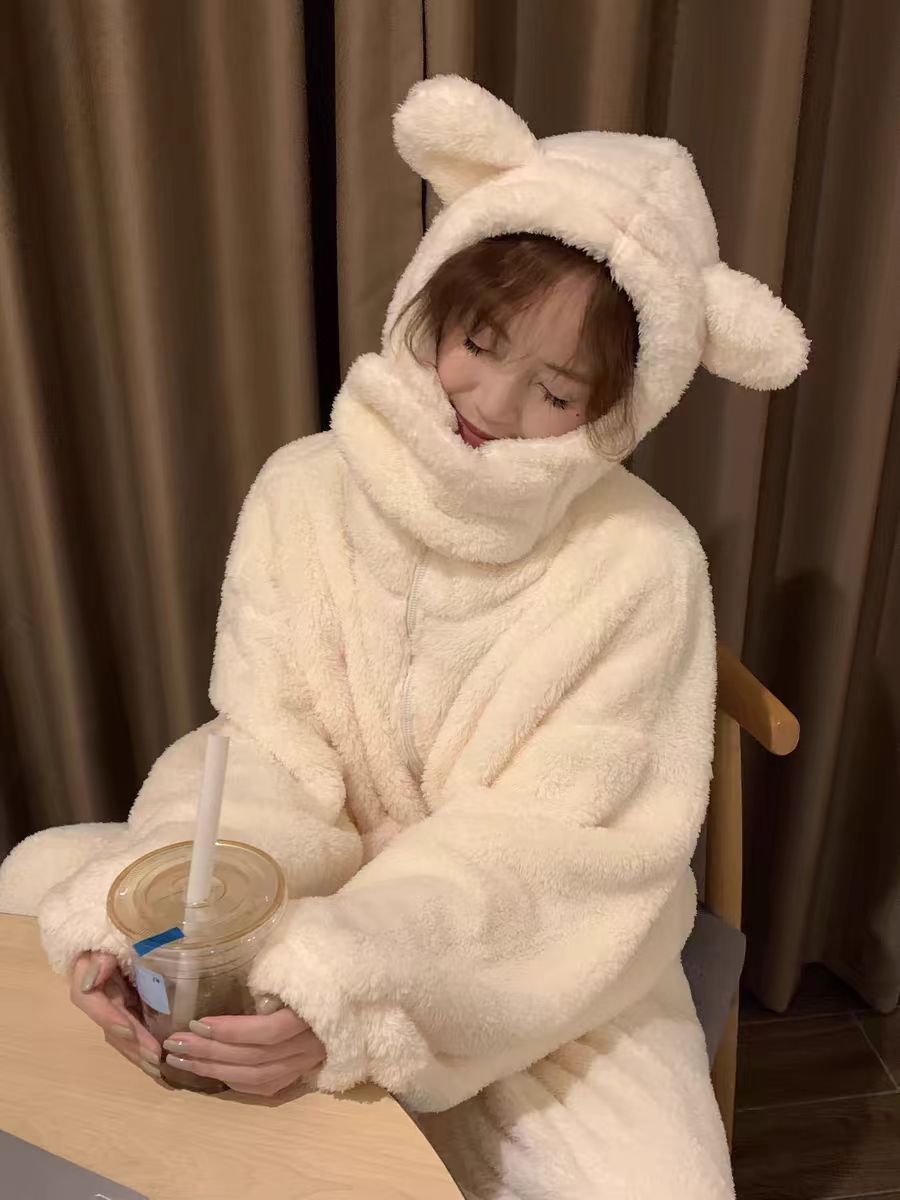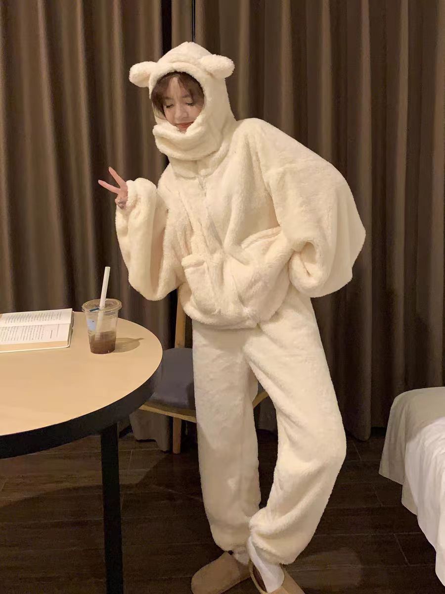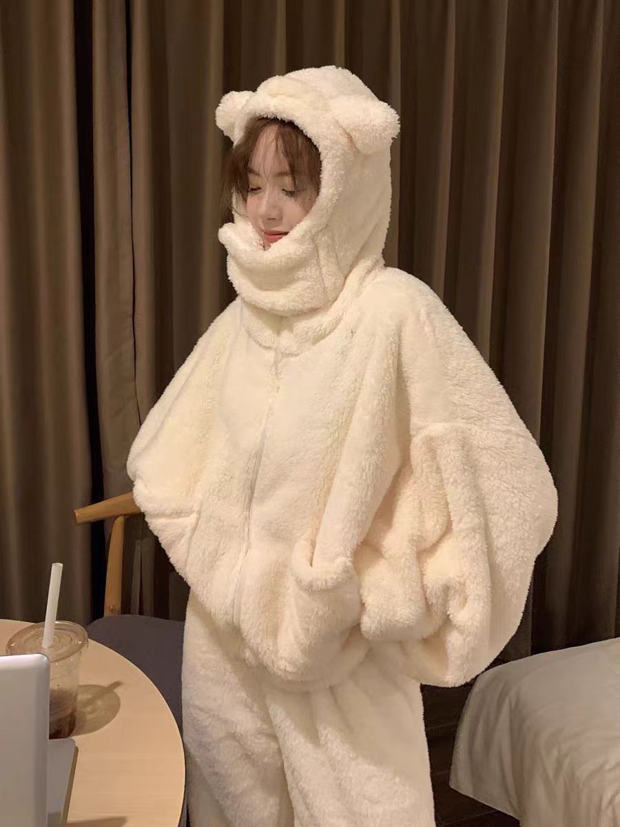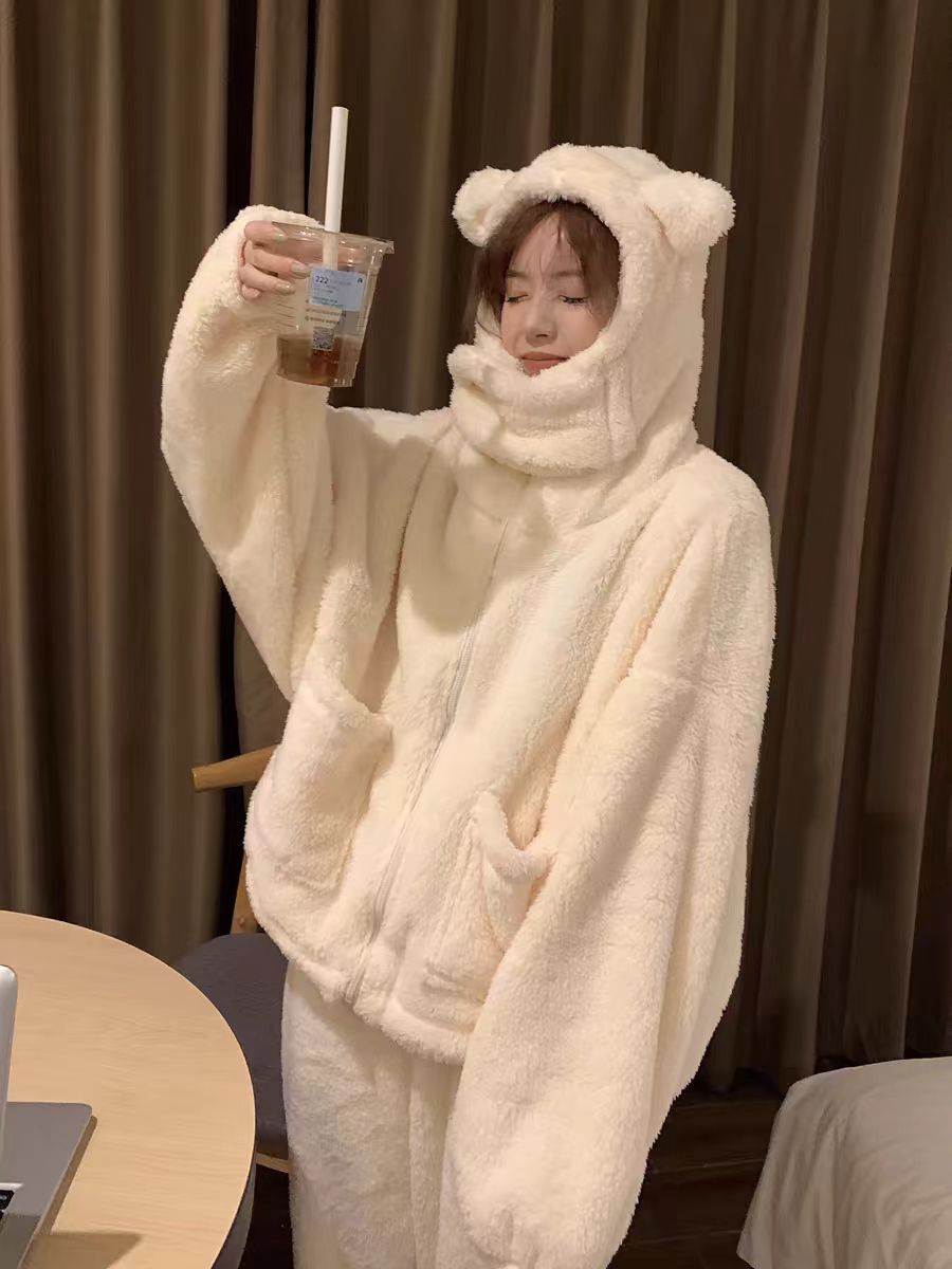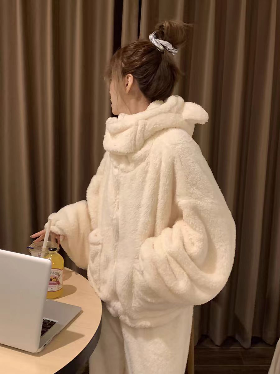 가을과 겨울에 착용할 수 있는 여성용 귀여운 곰 두꺼운 벨벳 산호 벨벳 잠옷 겨울에 착용할 수 있는 후드 홈웨어 세트