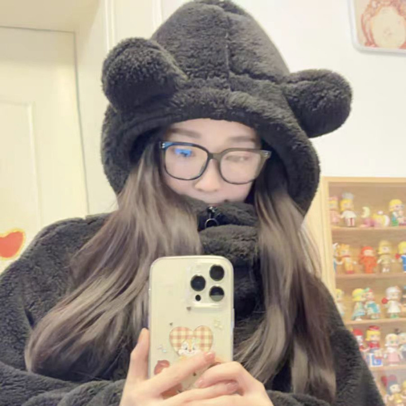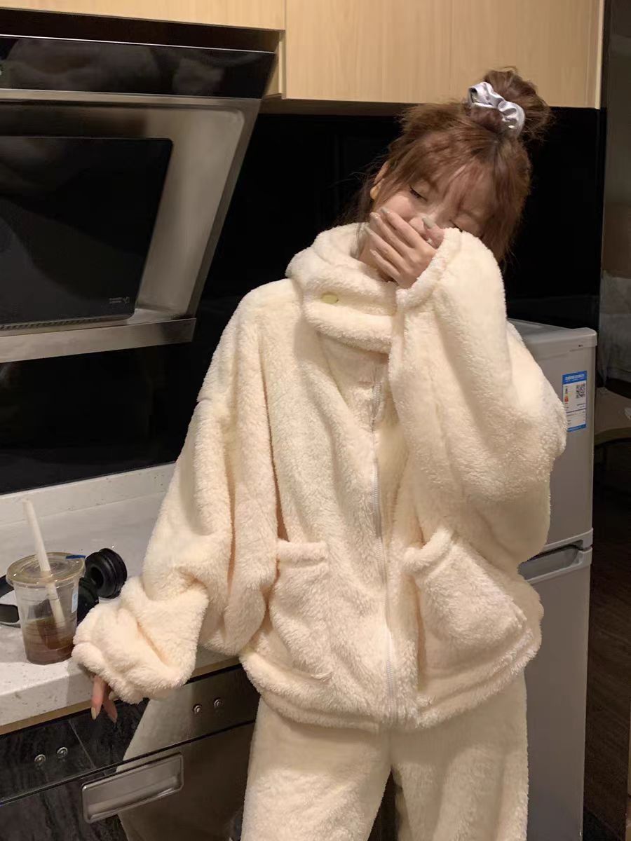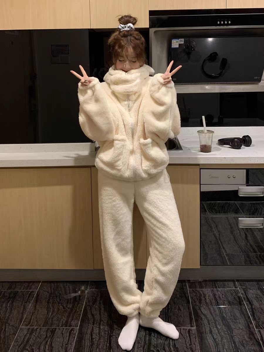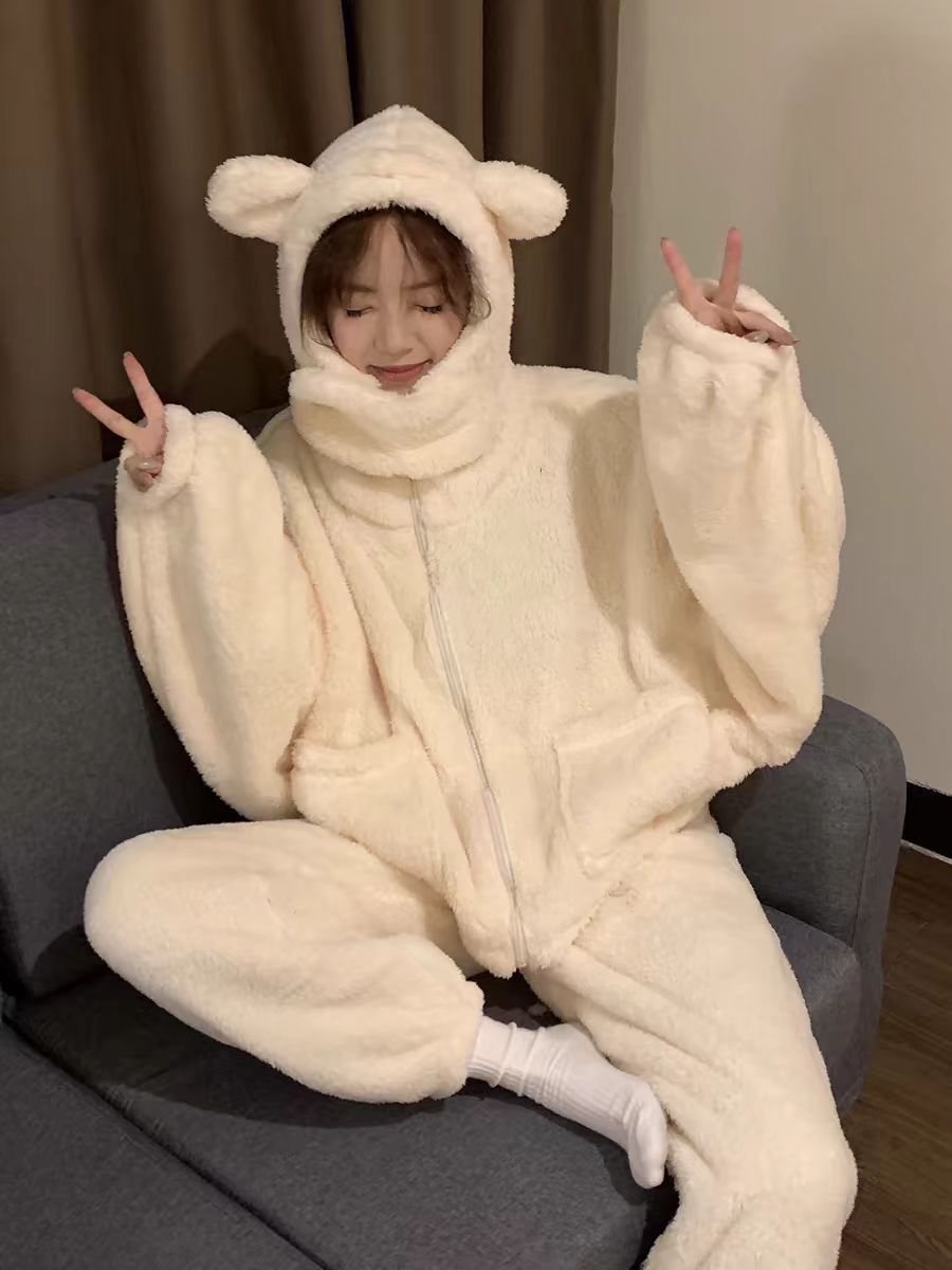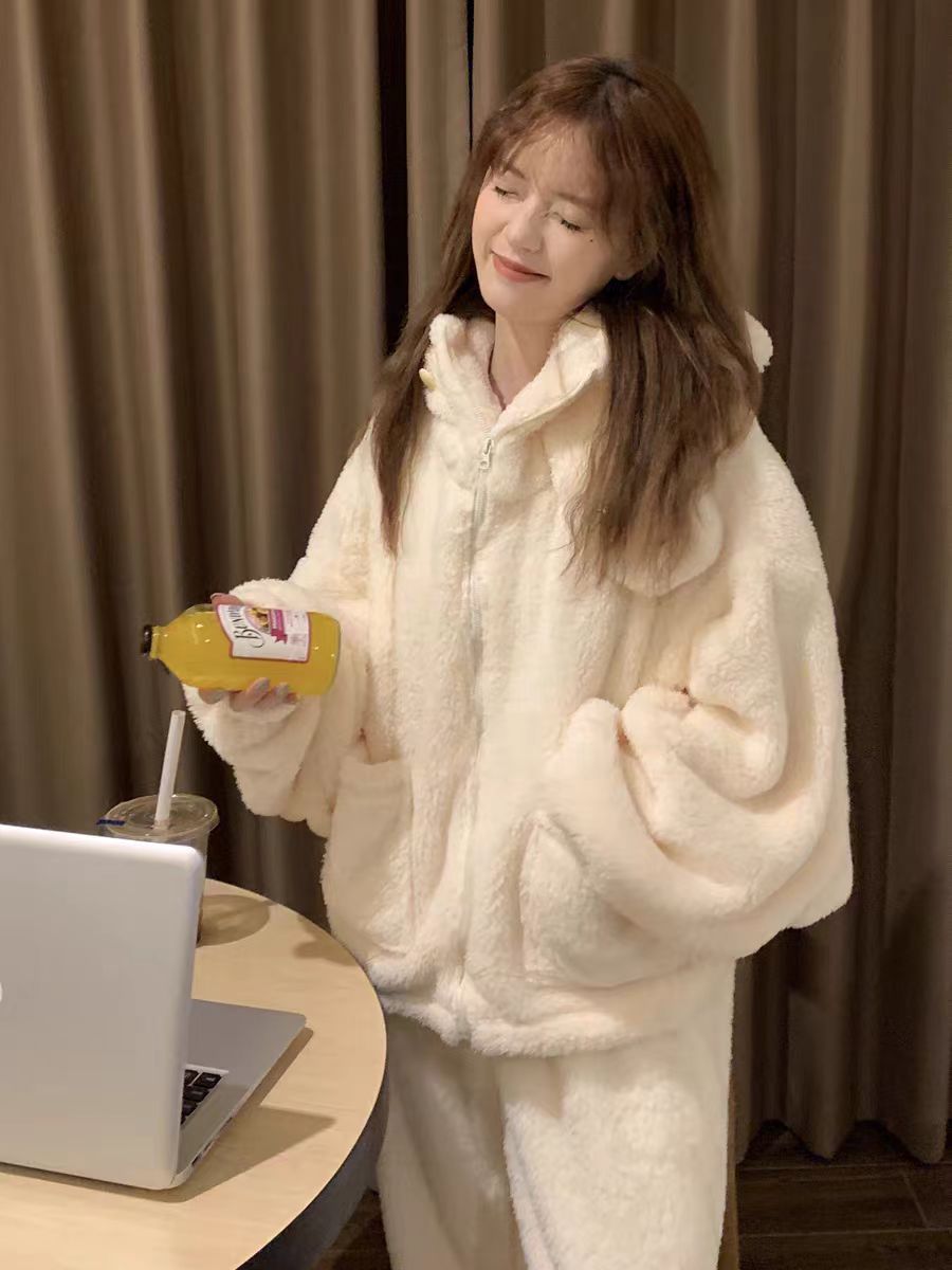 가을과 겨울에 착용할 수 있는 여성용 귀여운 곰 두꺼운 벨벳 산호 벨벳 잠옷 겨울에 착용할 수 있는 후드 홈웨어 세트