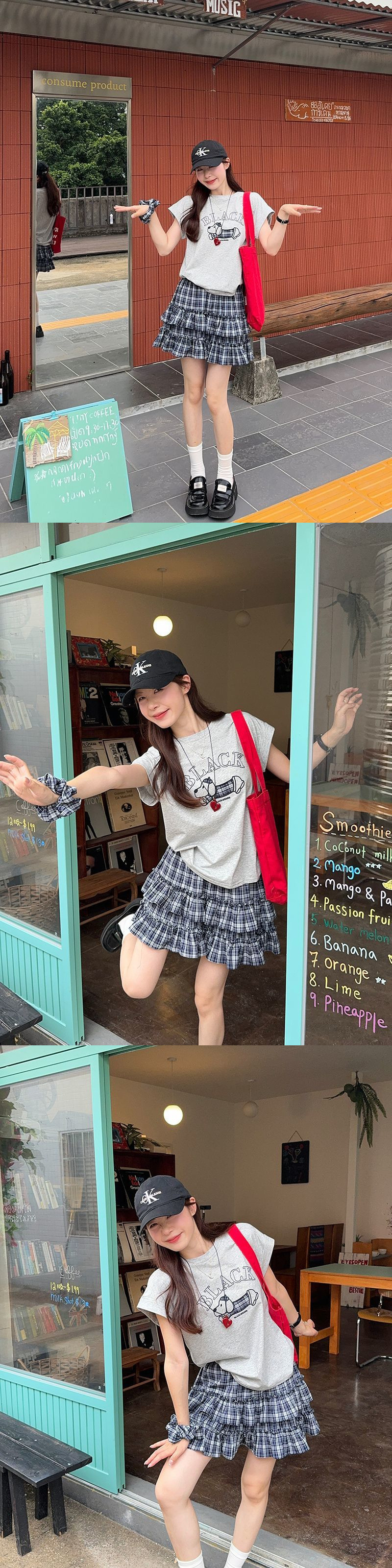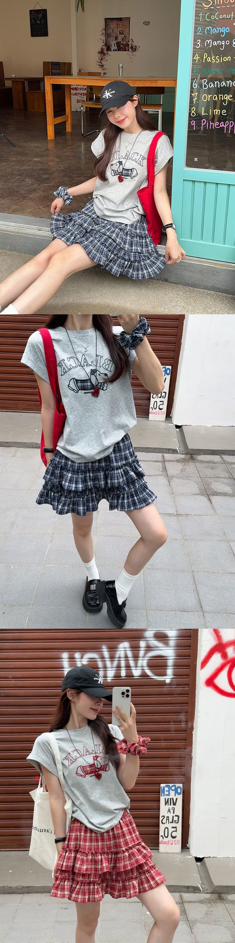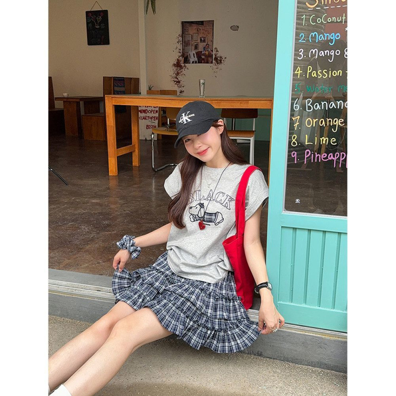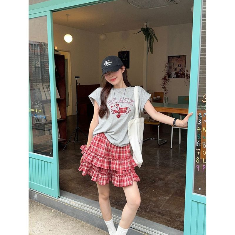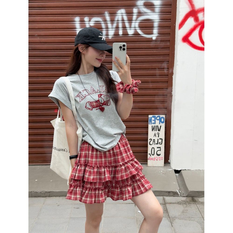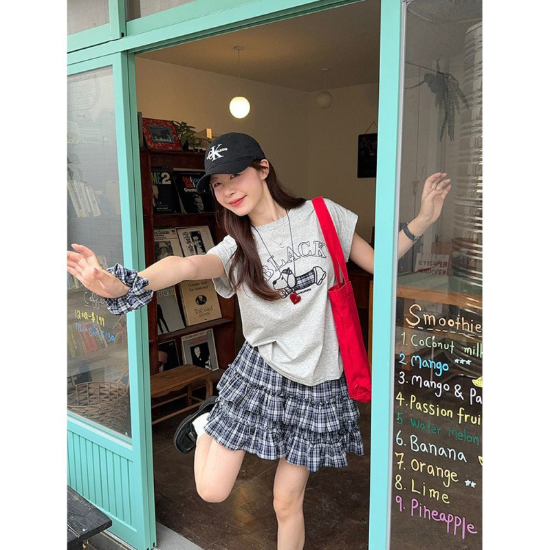 한국 자수 만화 반팔 티셔츠 탄성 허리 케이크 격자 무늬 스커트 2025 여성을위한 여름 새로운 패션 정장