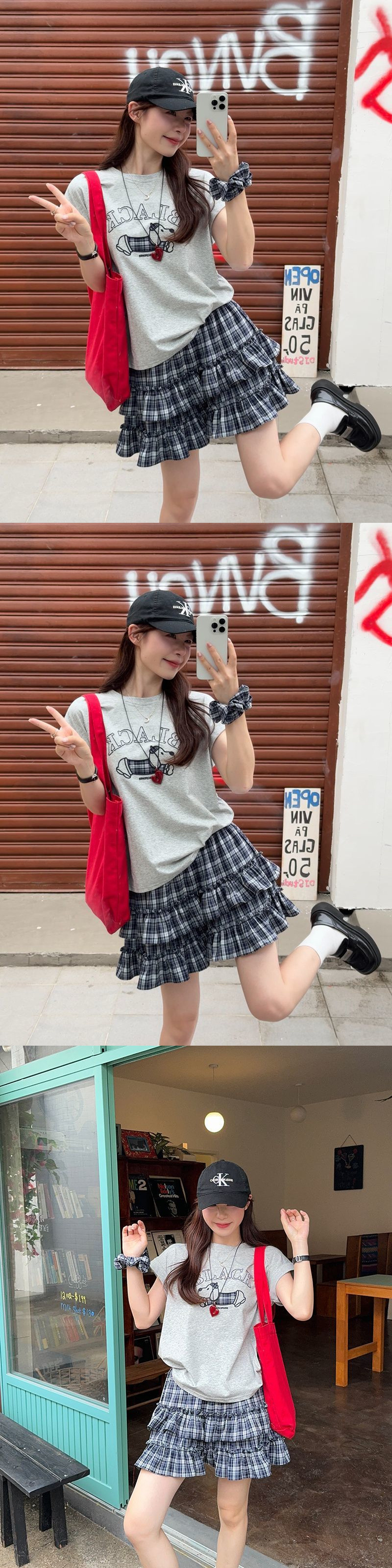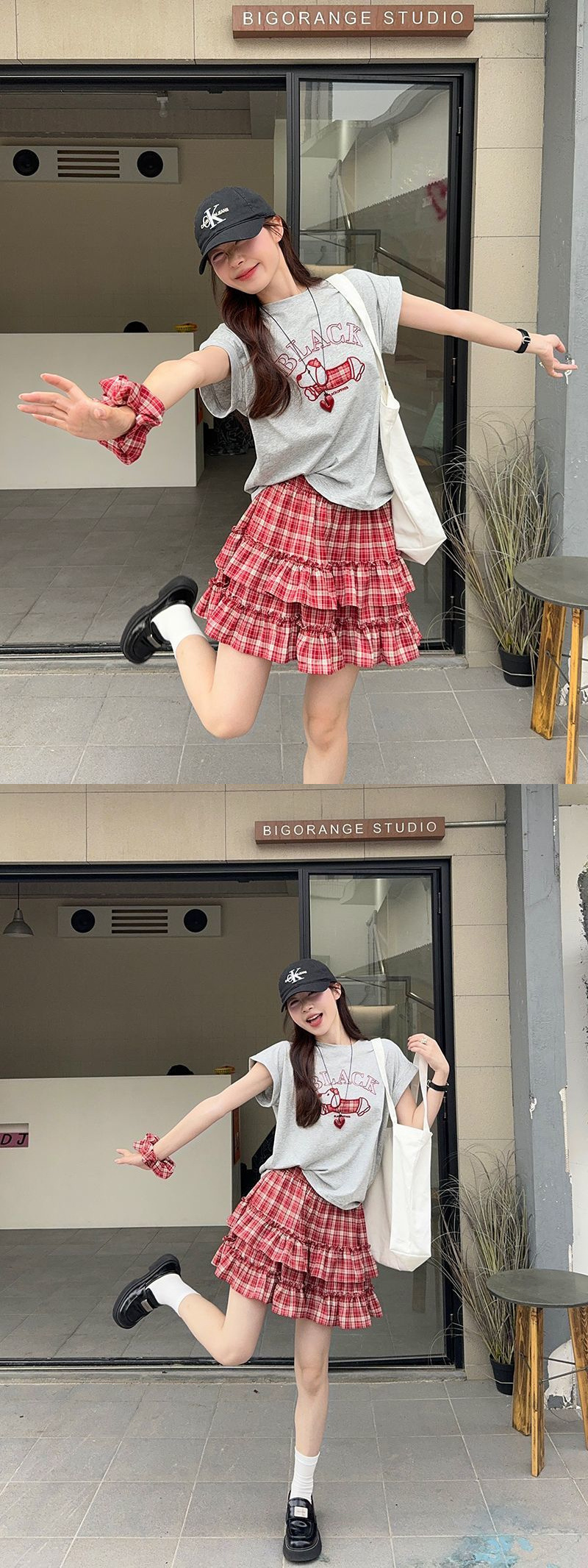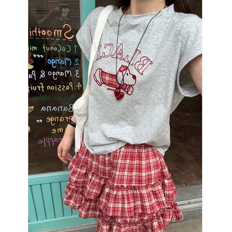 한국 자수 만화 반팔 티셔츠 탄성 허리 케이크 격자 무늬 스커트 2025 여성을위한 여름 새로운 패션 정장스토어 가기