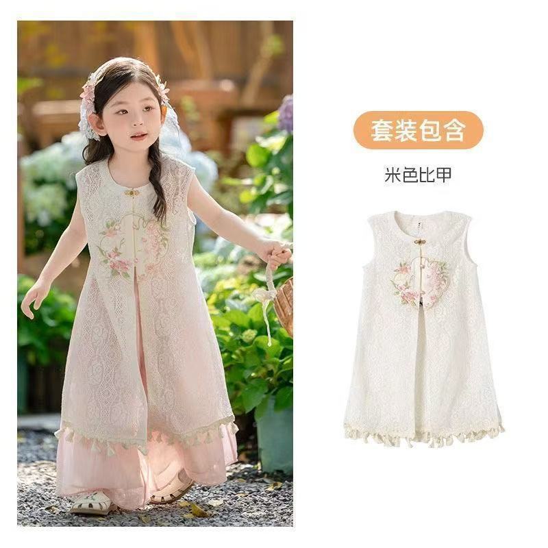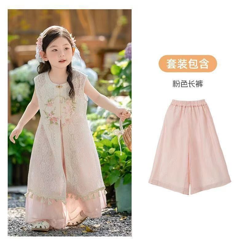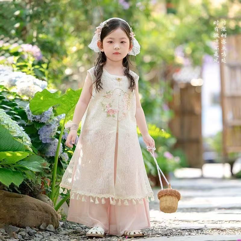 여아 서스펜더 와이드 팬츠 블라우스 3피스 세트 새로운 중국 스타일 비아지 슈트 Hanfu 2025 여름 어린이 슈퍼 트렌디스토어 가기