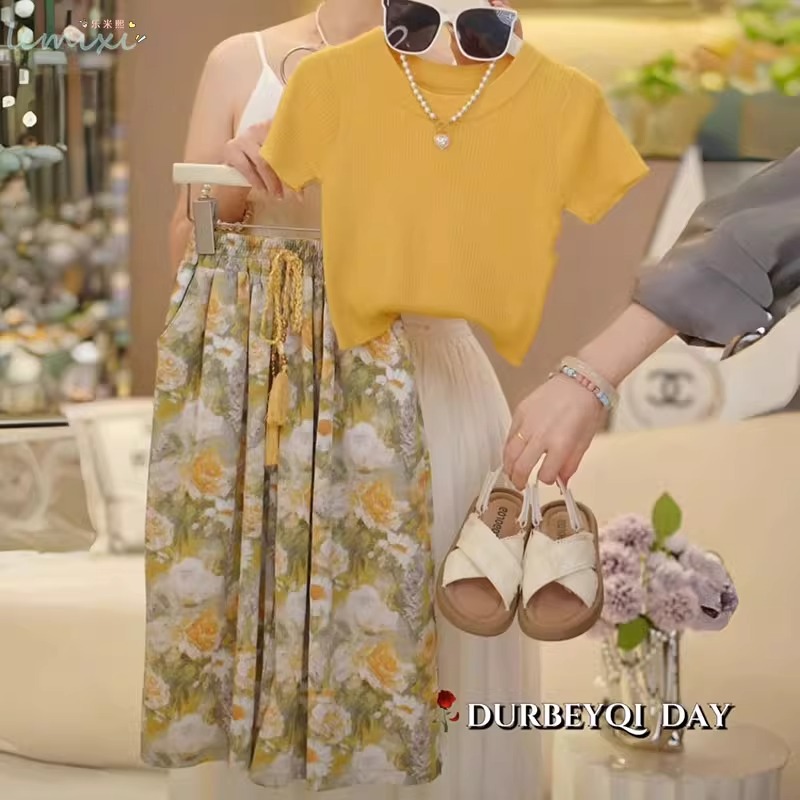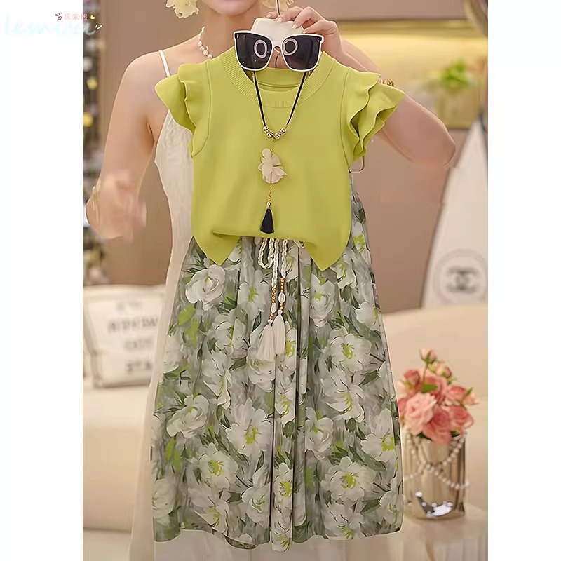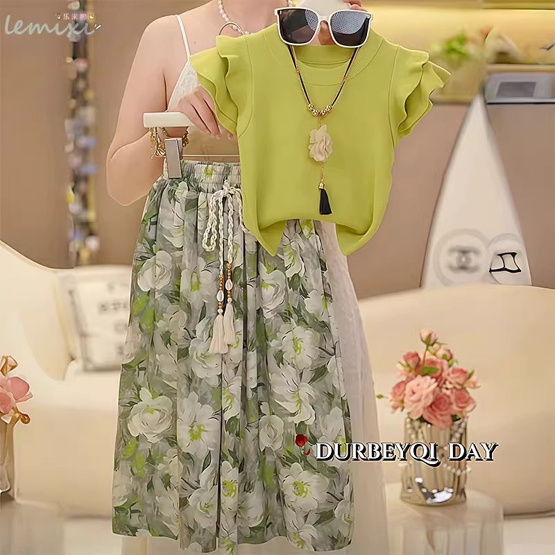 여자 꽃 치마 정장 2025 여름 와이드 레그 팬츠 정장 투피스 양복 플라잉 슬리브 Huzhou Zhili 아동복