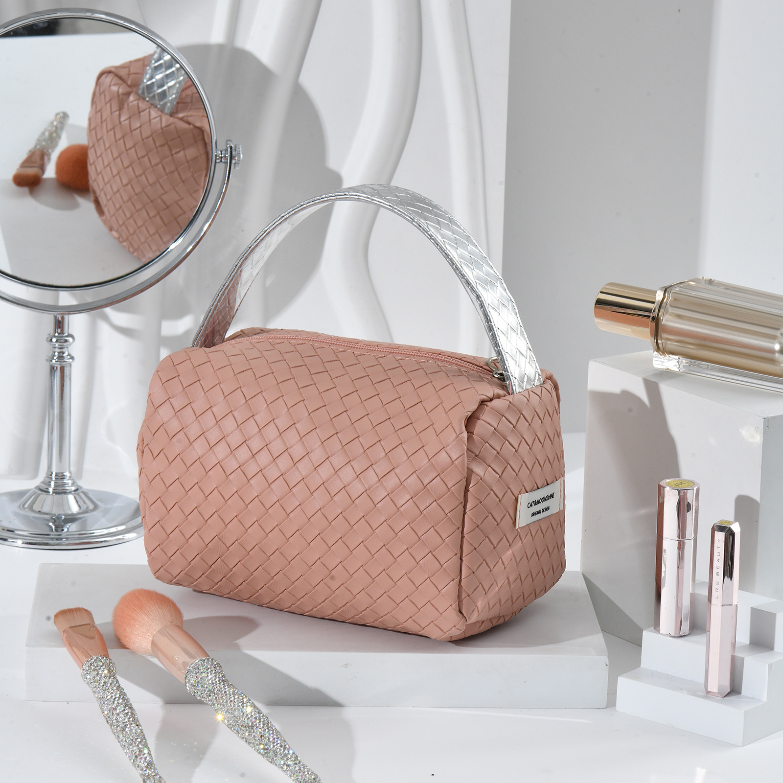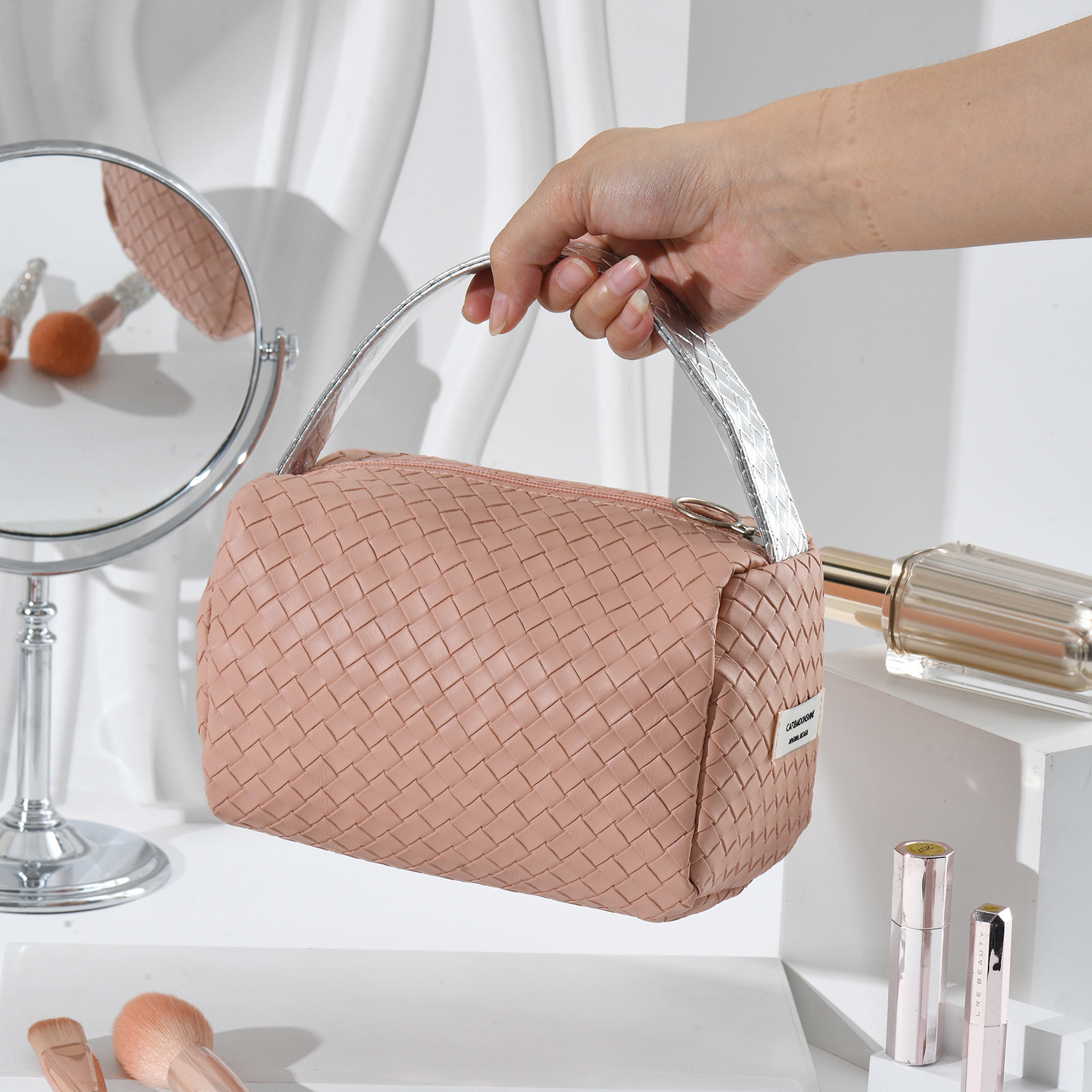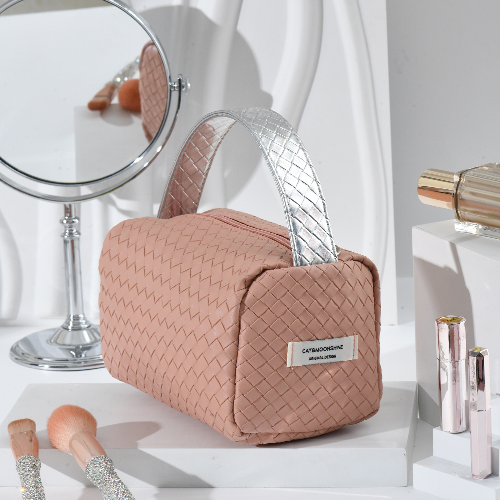 출장을위한 크리 에이 티브 핑크 짠 패턴 화장품 가방 여성을위한 대용량 pu 가죽 보관 가방을위한 여행 휴대용 세면 용품 가방