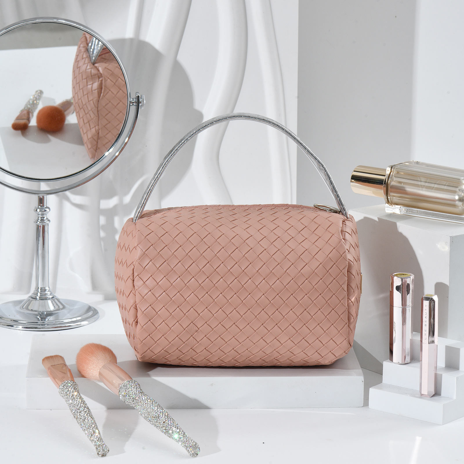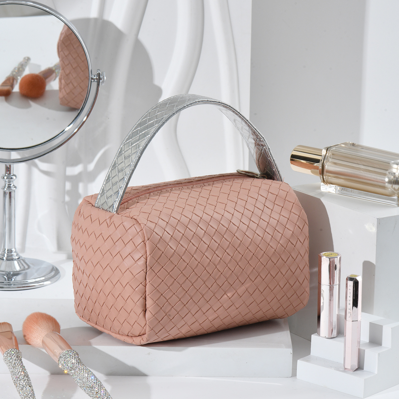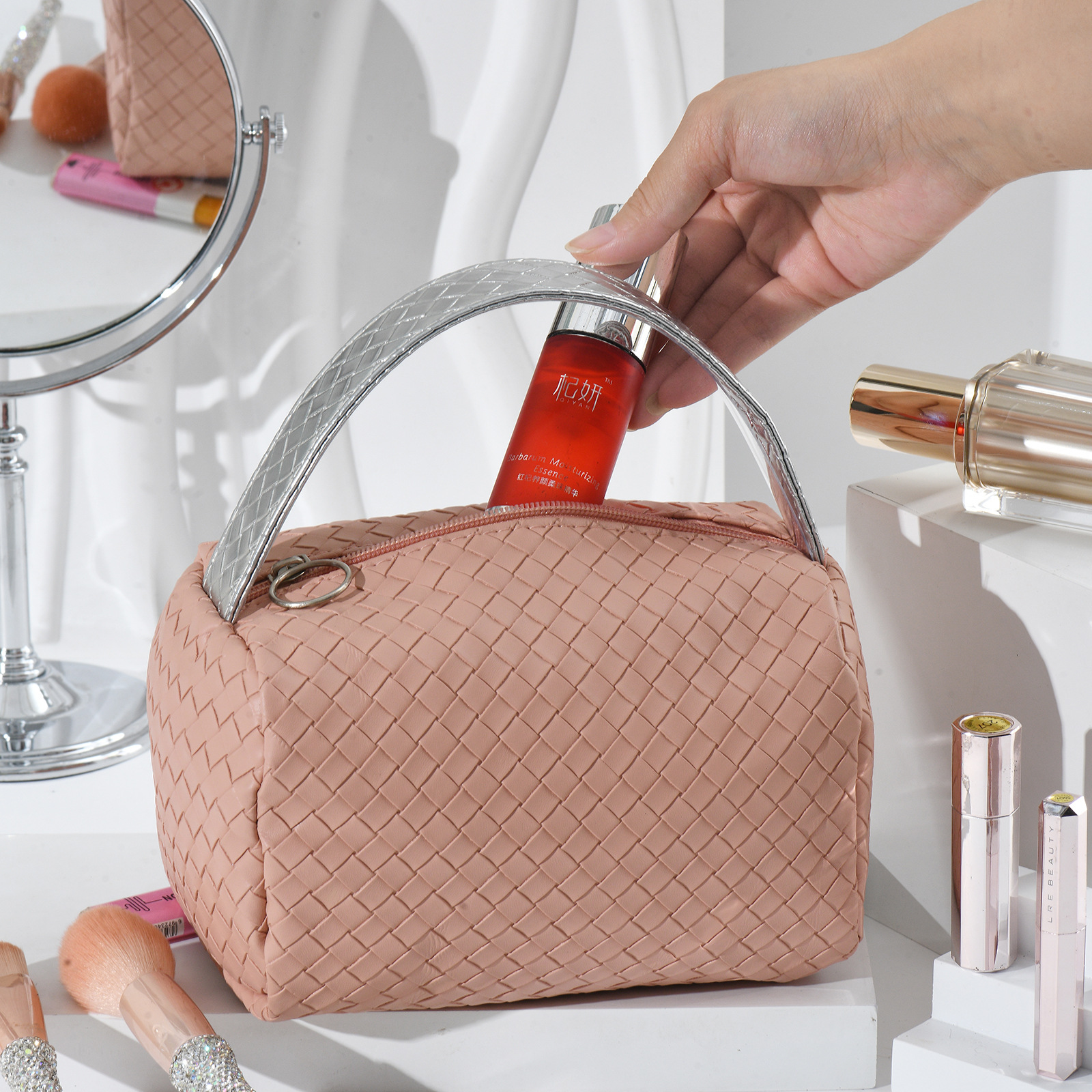 출장을위한 크리 에이 티브 핑크 짠 패턴 화장품 가방 여성을위한 대용량 pu 가죽 보관 가방을위한 여행 휴대용 세면 용품 가방