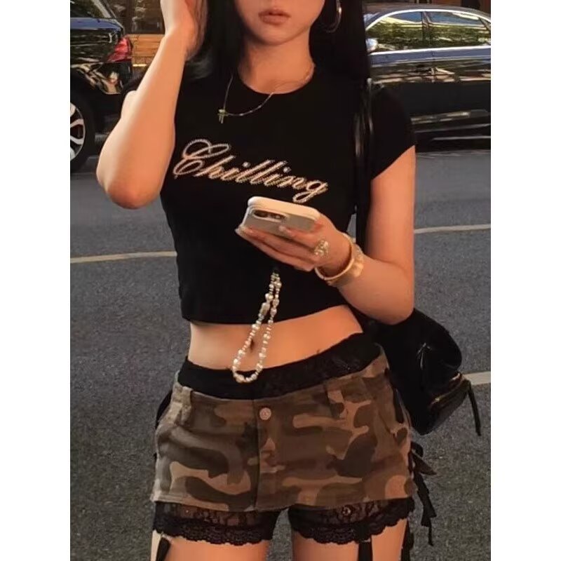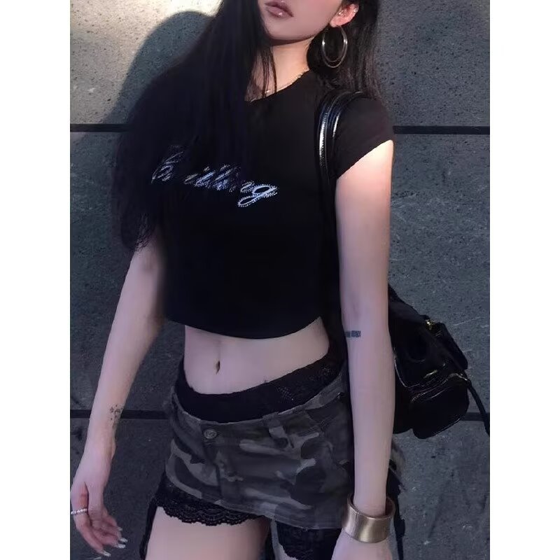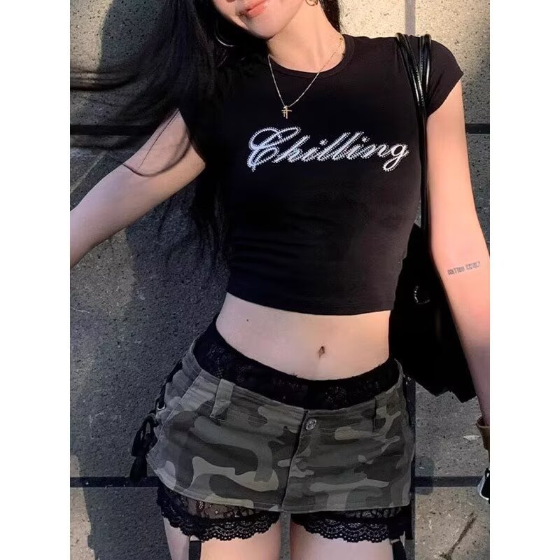2025 패션 핫 소녀 위장 미니 스커트 여성 하위 문화 복고풍 디자인 낮은 허리 섹시한 엉덩이 커버 스커트