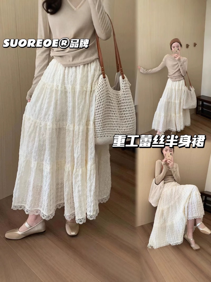【明星同款蕾丝裙】‼️干干净净的蕾丝拼接纯棉半身裙,无论什么季节看它一眼都会心动💓A字型的大裙摆蛋糕半裙,三段式不用绣花拼接,层次感足,花边点缀,增加裙身的灵动性!对梨形身材的姐妹们很友好,显高显瘦!上身妙变甜系girl