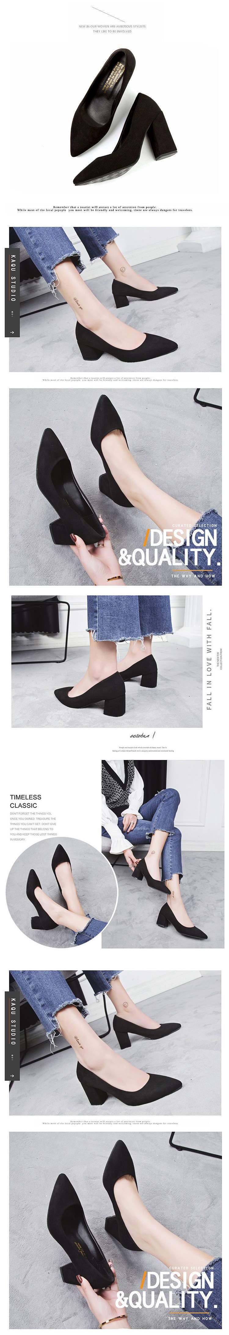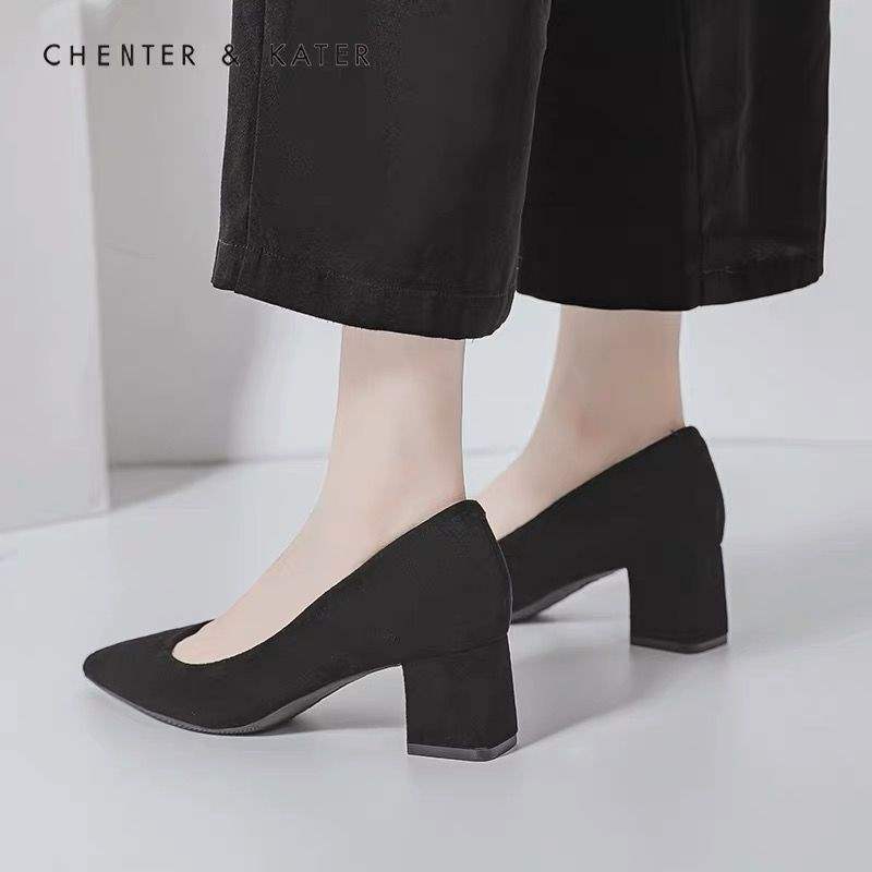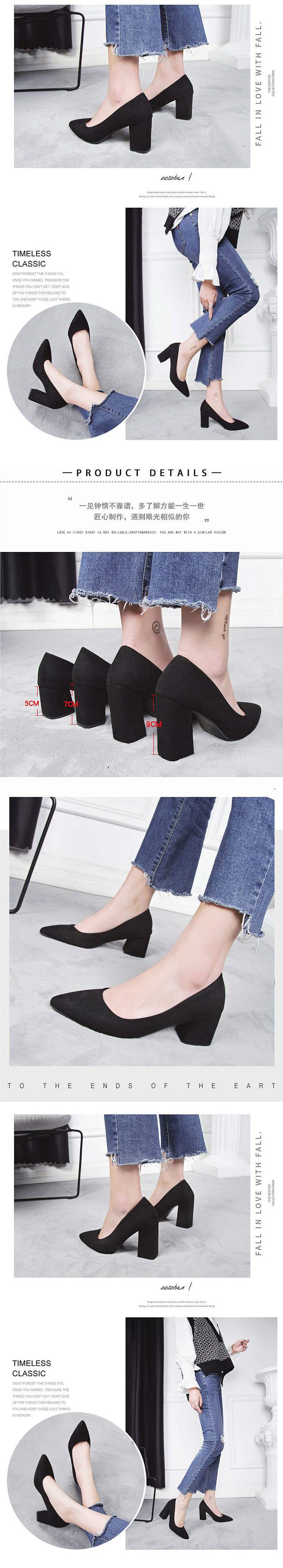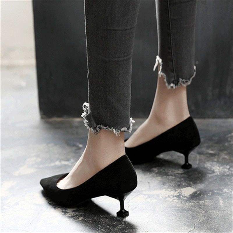 2025 봄과 가을 새로운 한국 스타일 뾰족한 발가락 얕은 입 스웨이드 신발 두꺼운 굽 하이힐 중간 굽 여성용 다용도 작업 신발스토어 가기