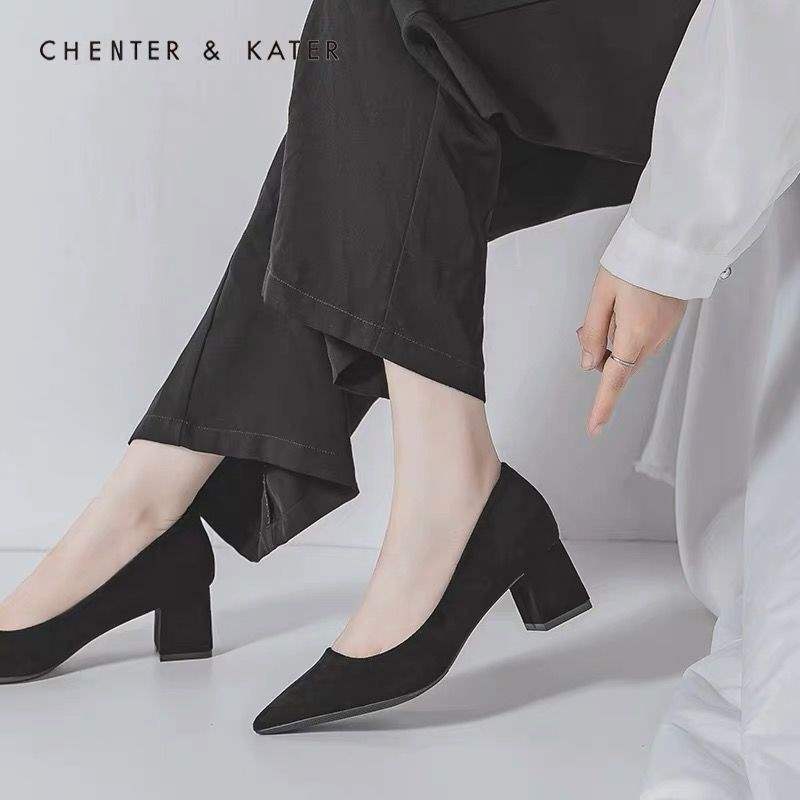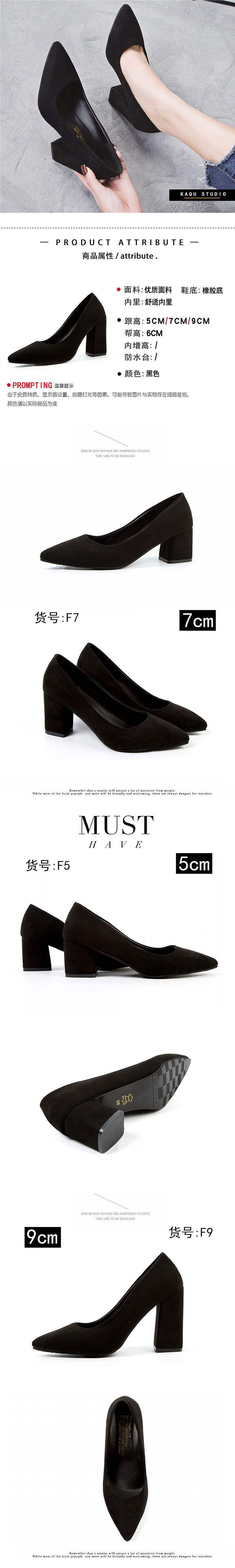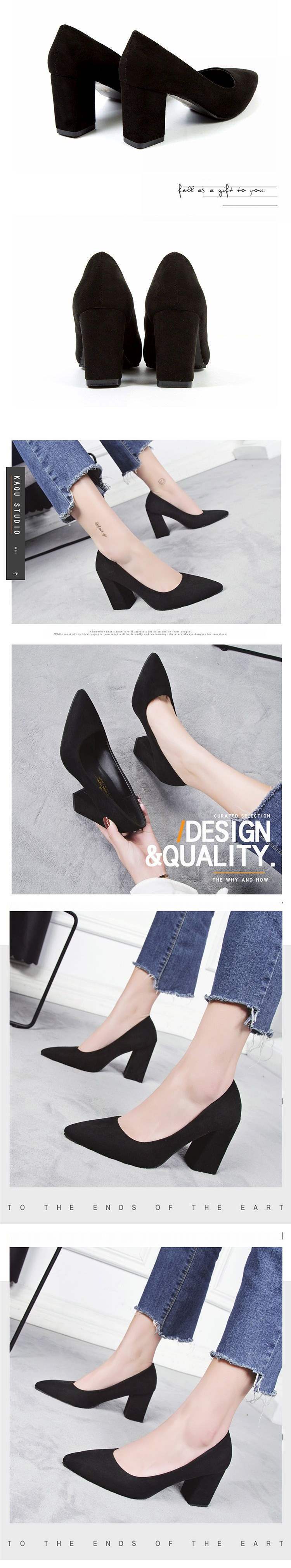 2025 봄과 가을 새로운 한국 스타일 뾰족한 발가락 얕은 입 스웨이드 신발 두꺼운 굽 하이힐 중간 굽 여성용 다용도 작업 신발스토어 가기