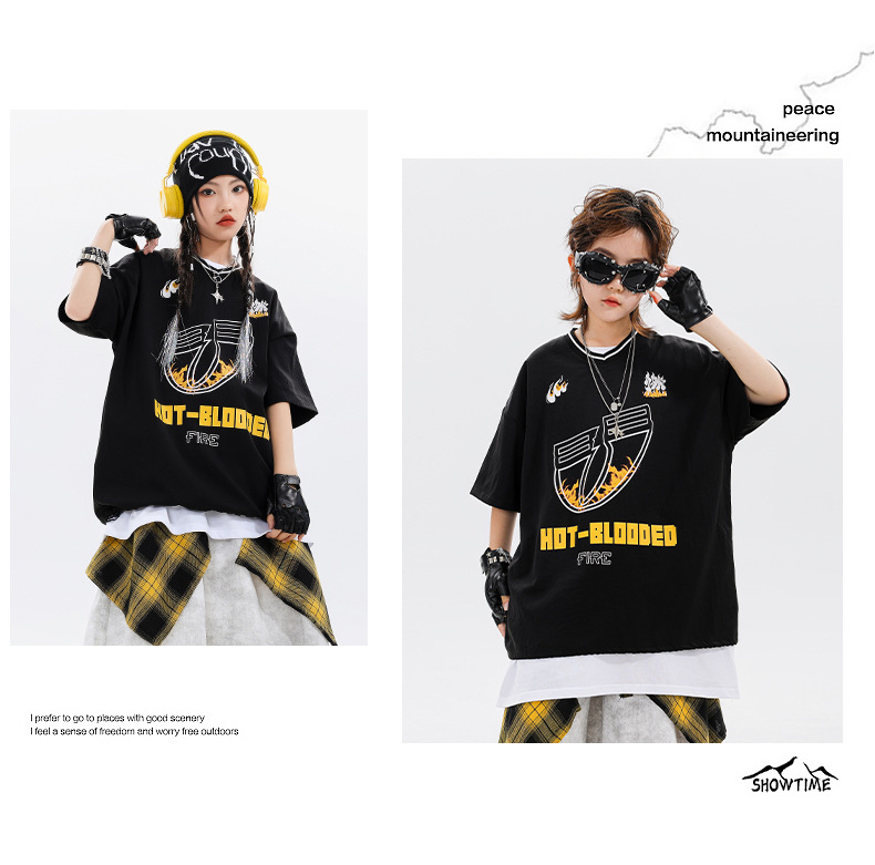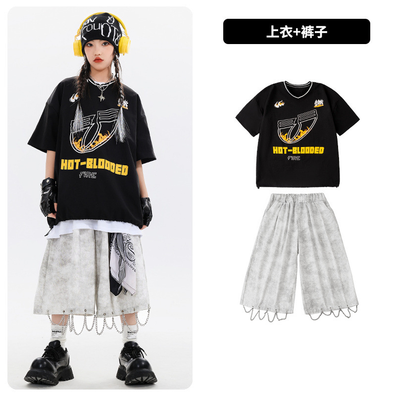 힙합 스트리트 댄스 아동복 힙합 트렌디 브랜드 소년 루즈 블랙 파이어 슈트 아동 트렌디 의류 소녀 퍼포먼스 의류스토어 가기