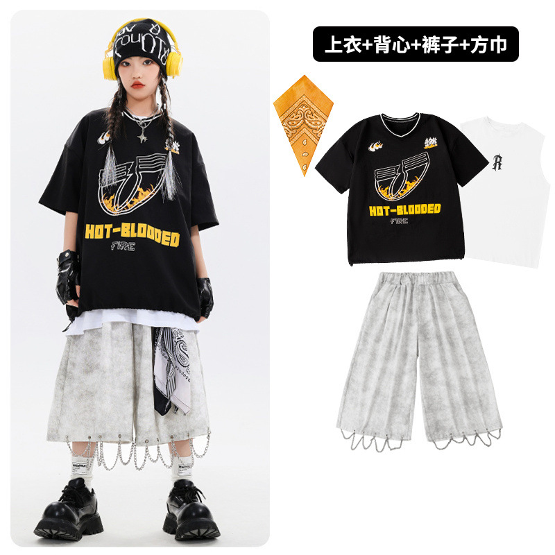 힙합 스트리트 댄스 아동복 힙합 트렌디 브랜드 소년 루즈 블랙 파이어 슈트 아동 트렌디 의류 소녀 퍼포먼스 의류