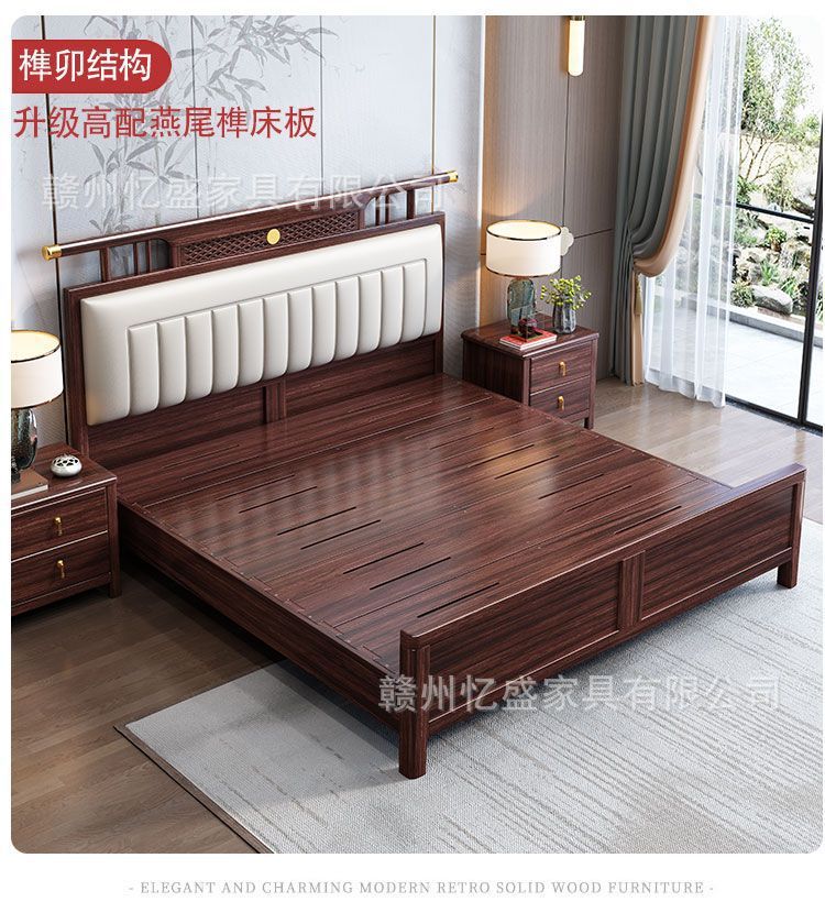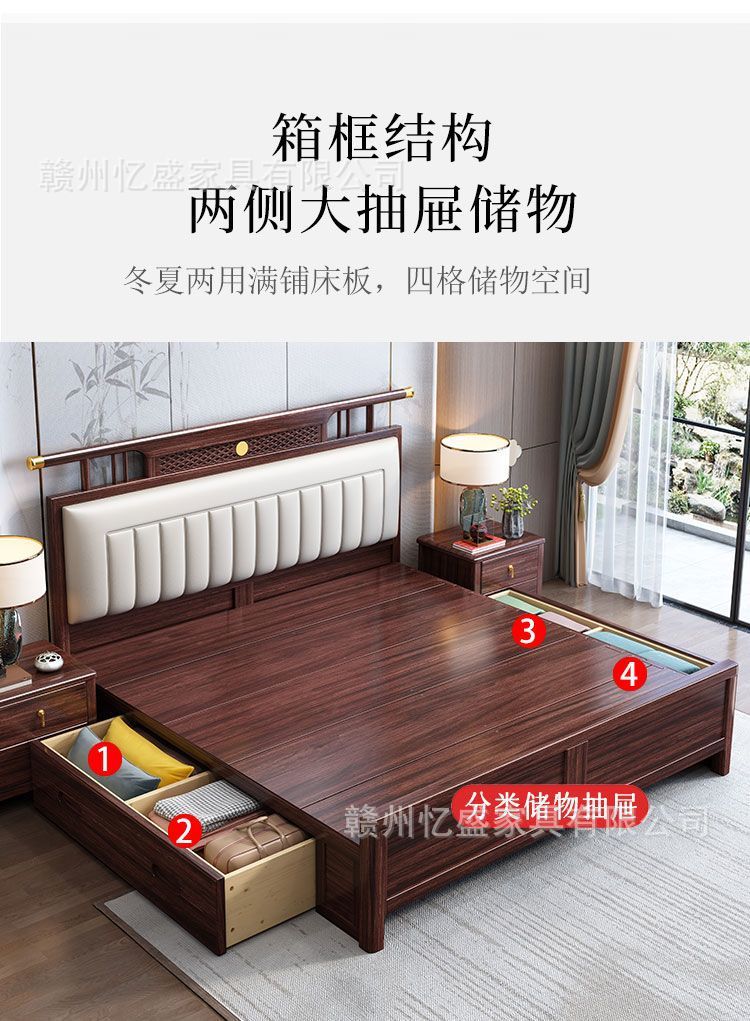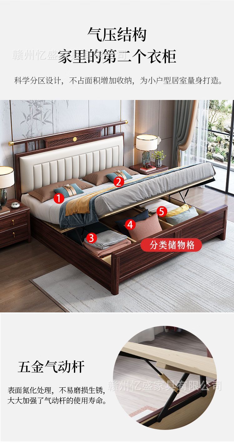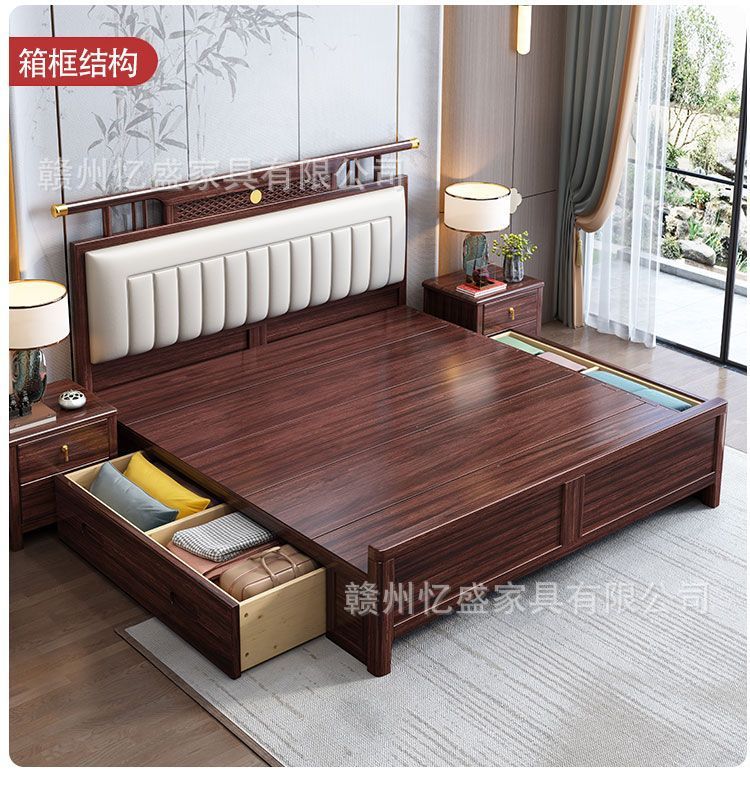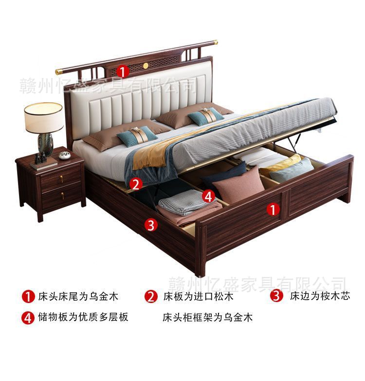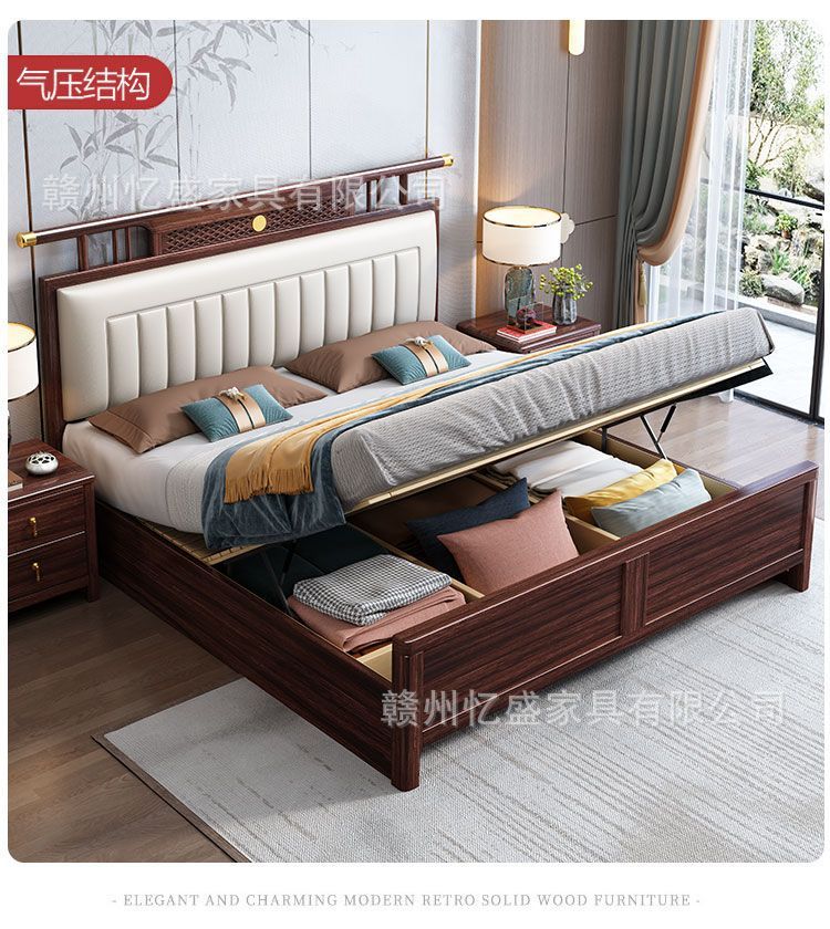 새로운 중국 스타일의 부드러운 단단한 나무 침대 마스터 침실 웨딩 침대 현대적인 단순하고 고급스러운 더블 중국 스타일의 검은 금색 나무 수납 침대