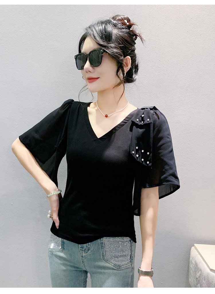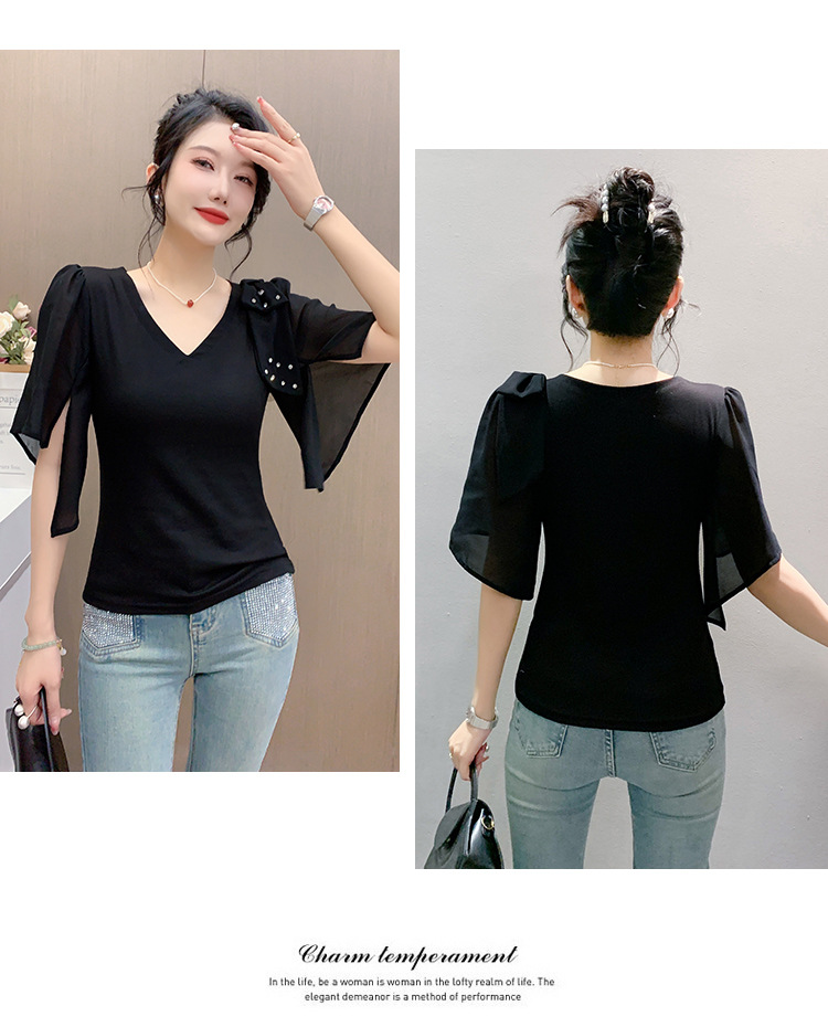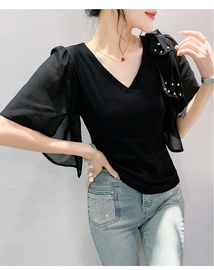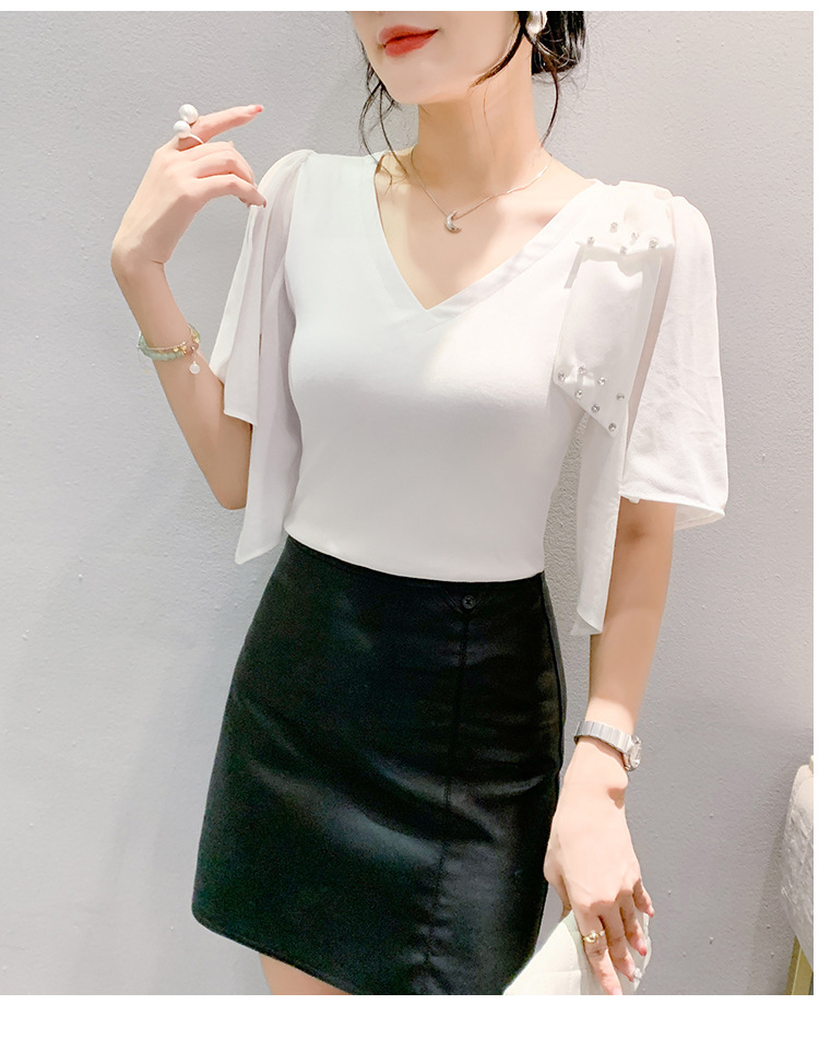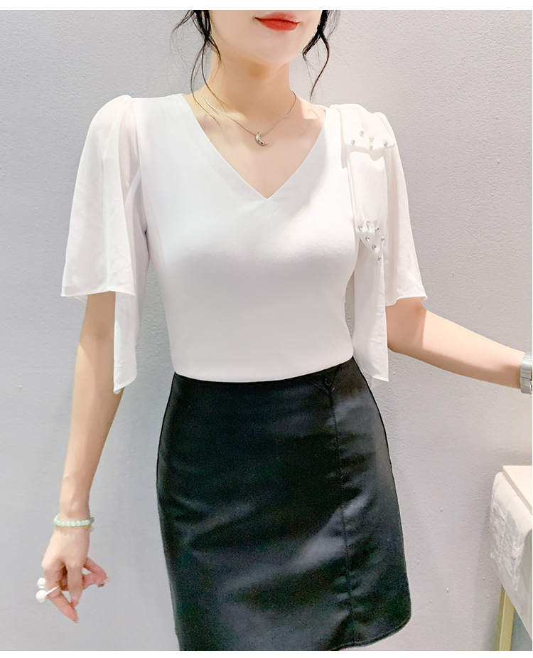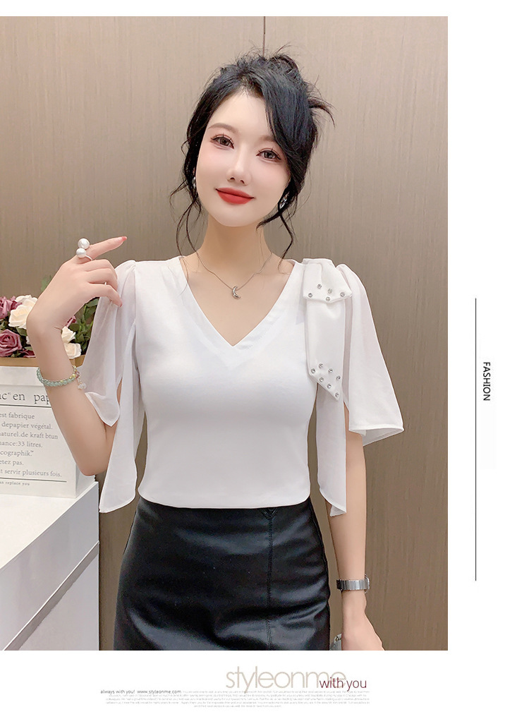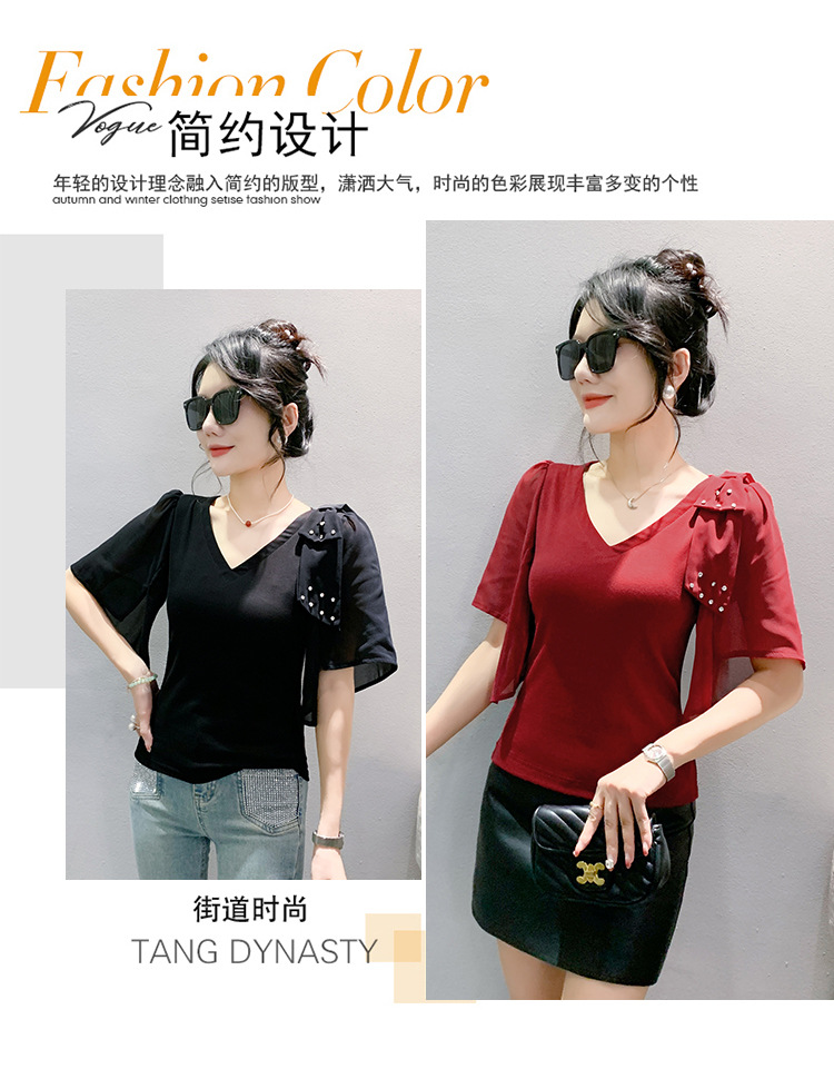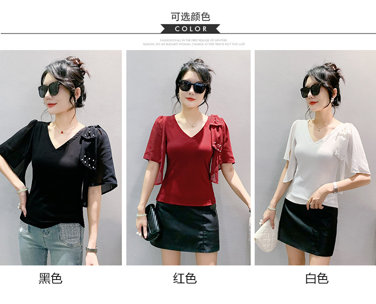 실제 촬영 여름 신작 오리지널 디자인 패셔너블하고 시크한 벨 슬리브 브이넥 여성용 다용도 티셔츠 탑 쉬폰 셔츠스토어 가기