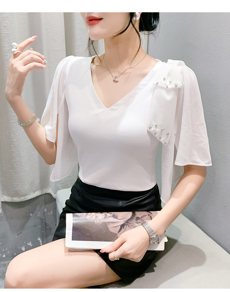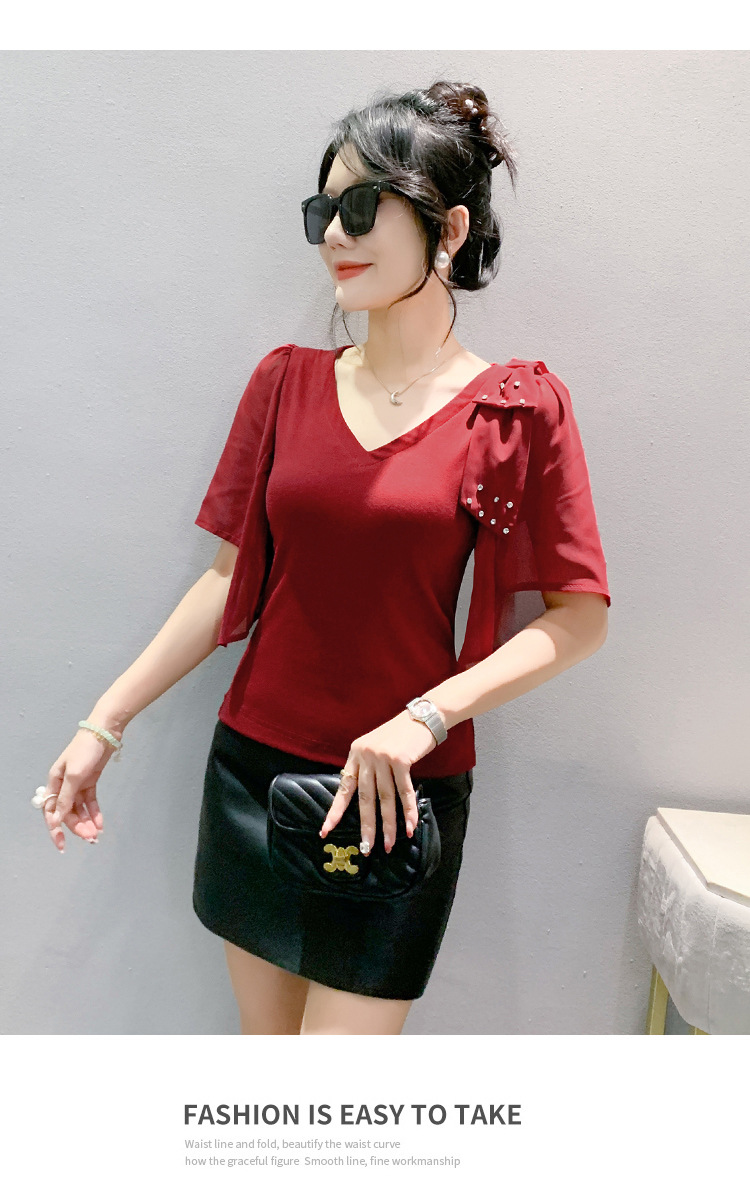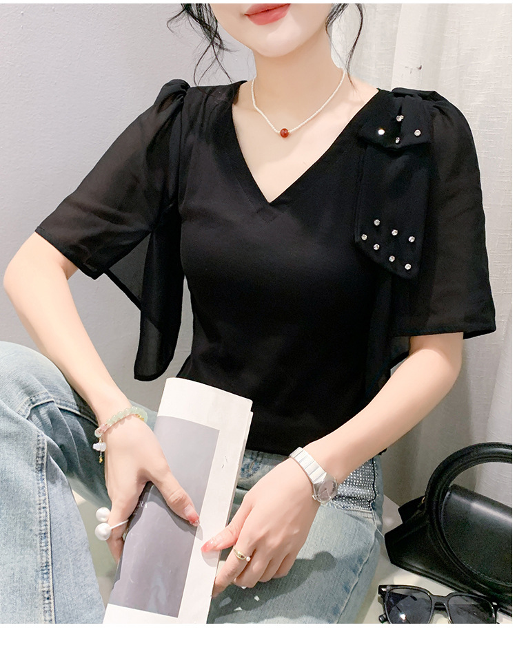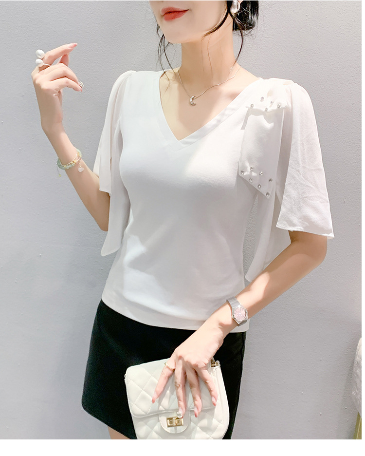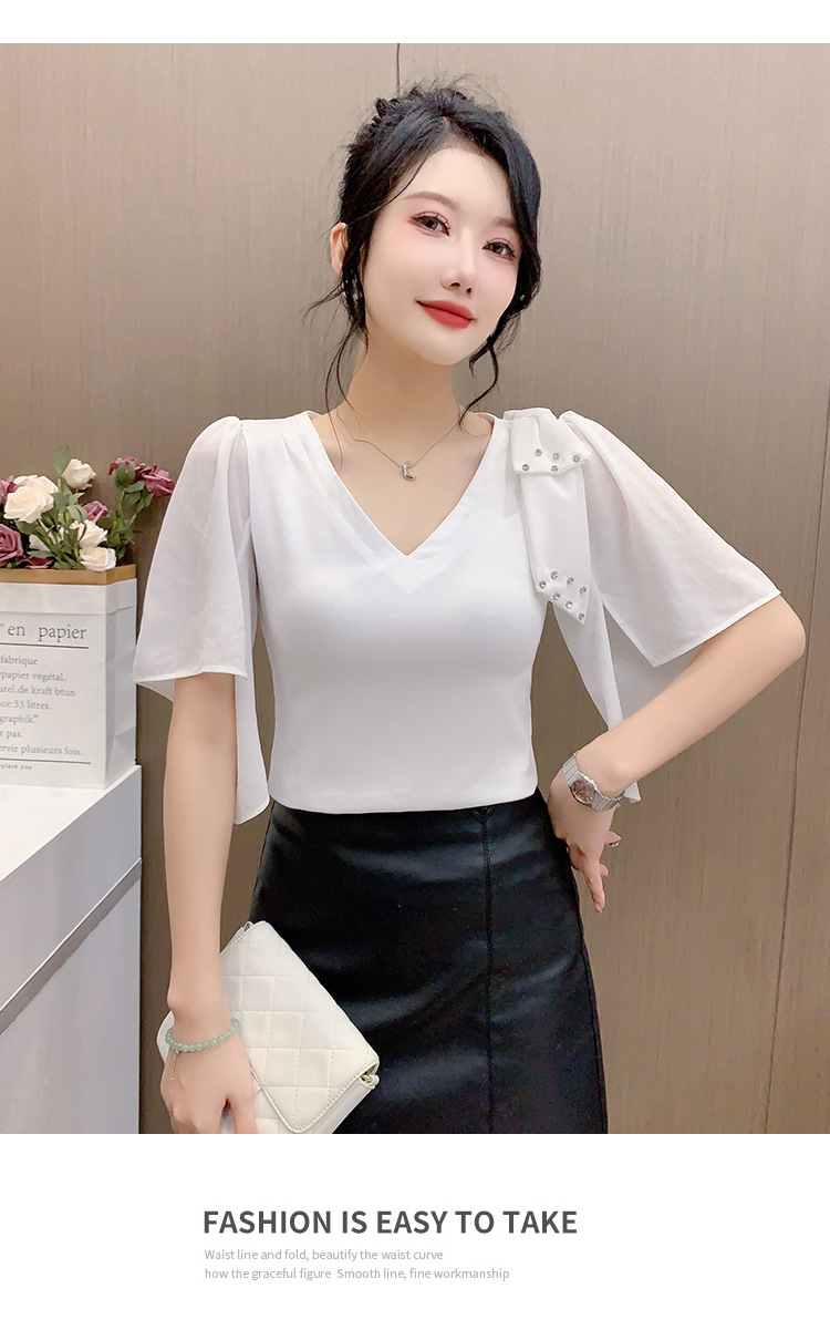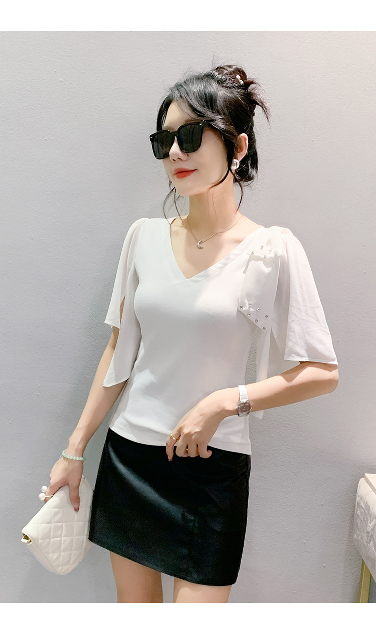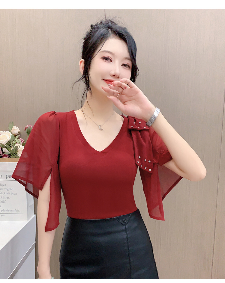 실제 촬영 여름 신작 오리지널 디자인 패셔너블하고 시크한 벨 슬리브 브이넥 여성용 다용도 티셔츠 탑 쉬폰 셔츠스토어 가기