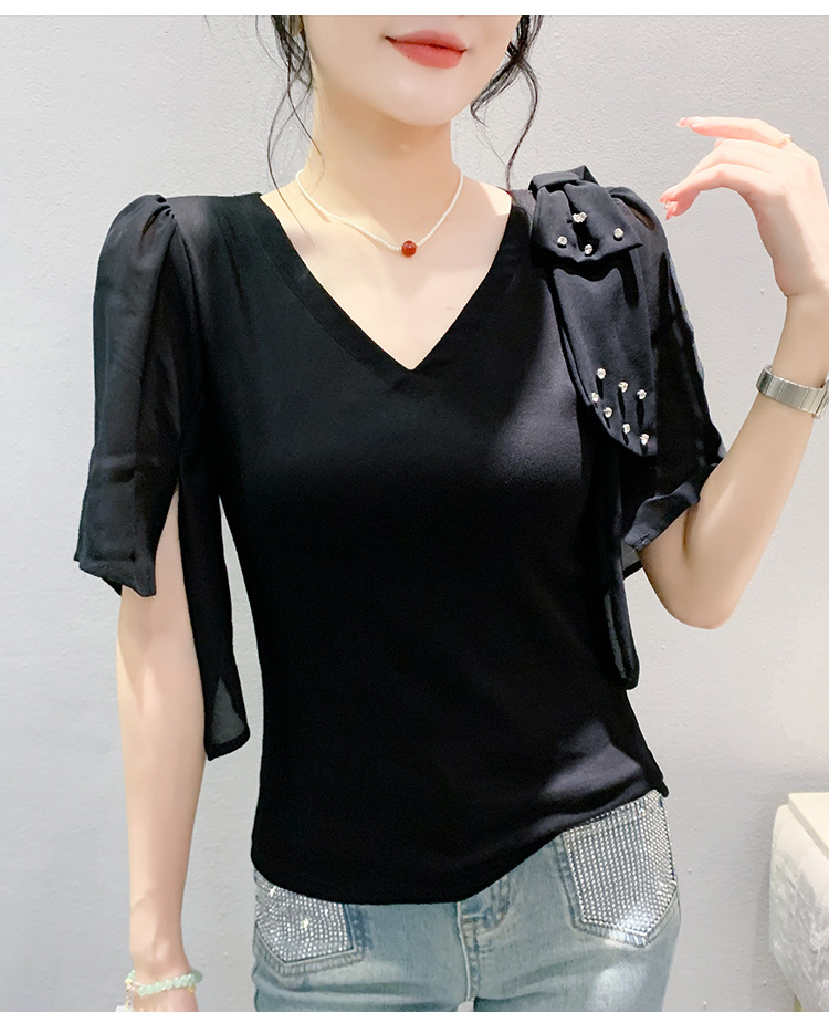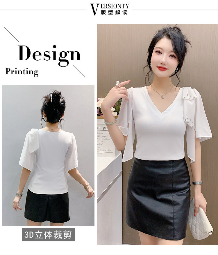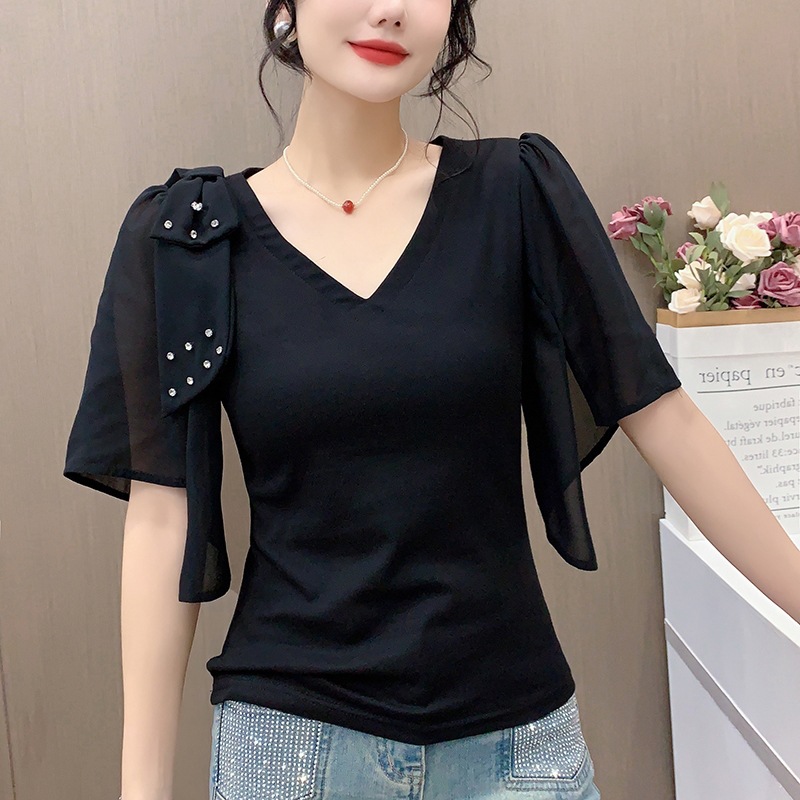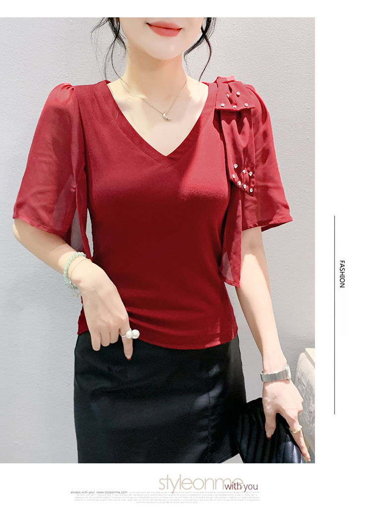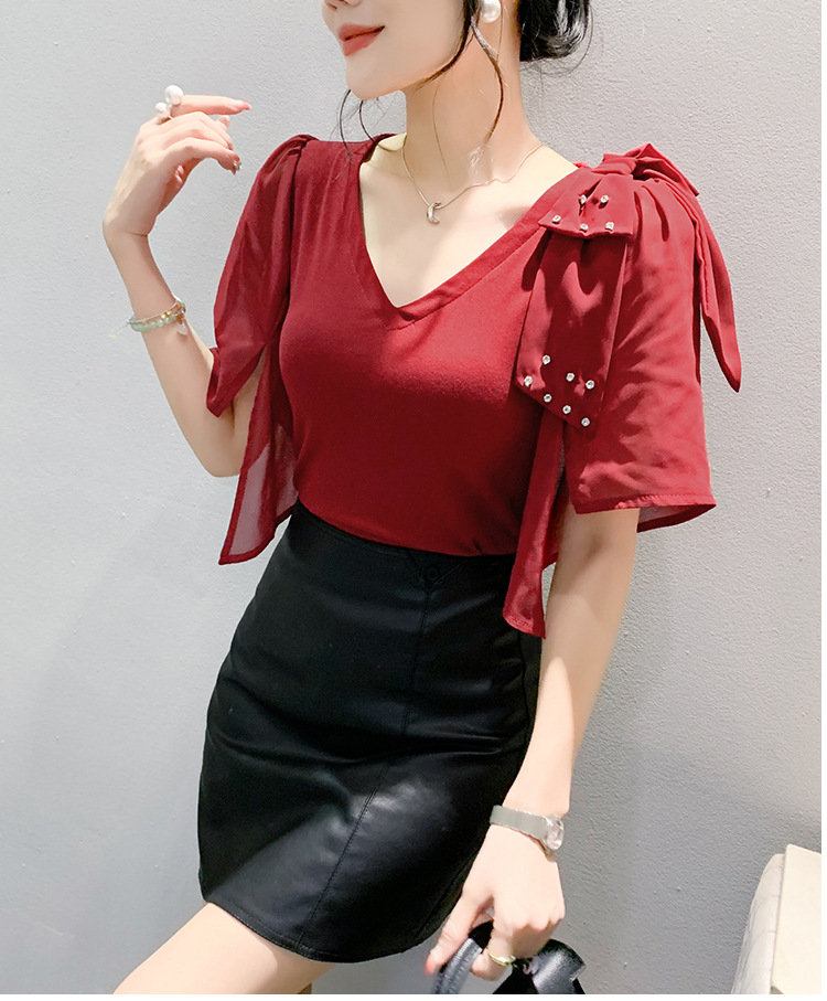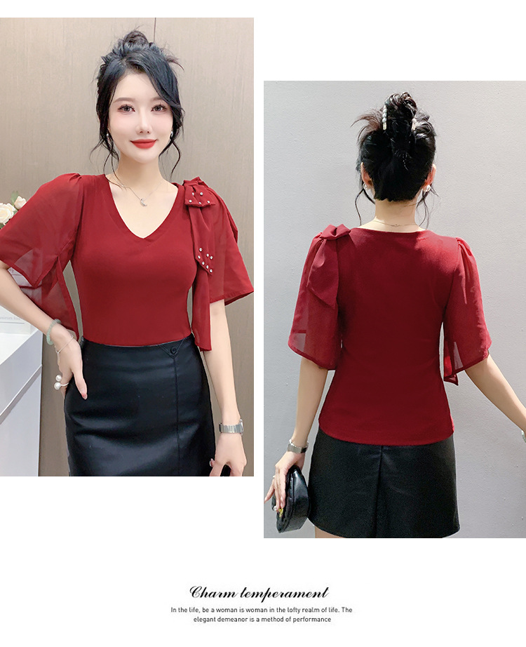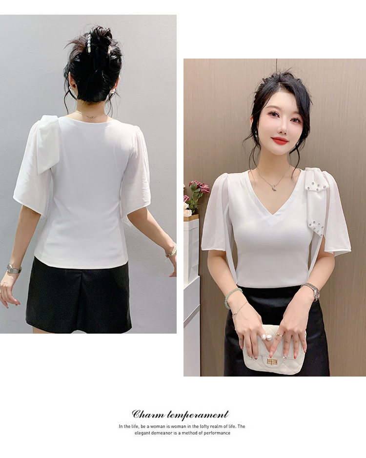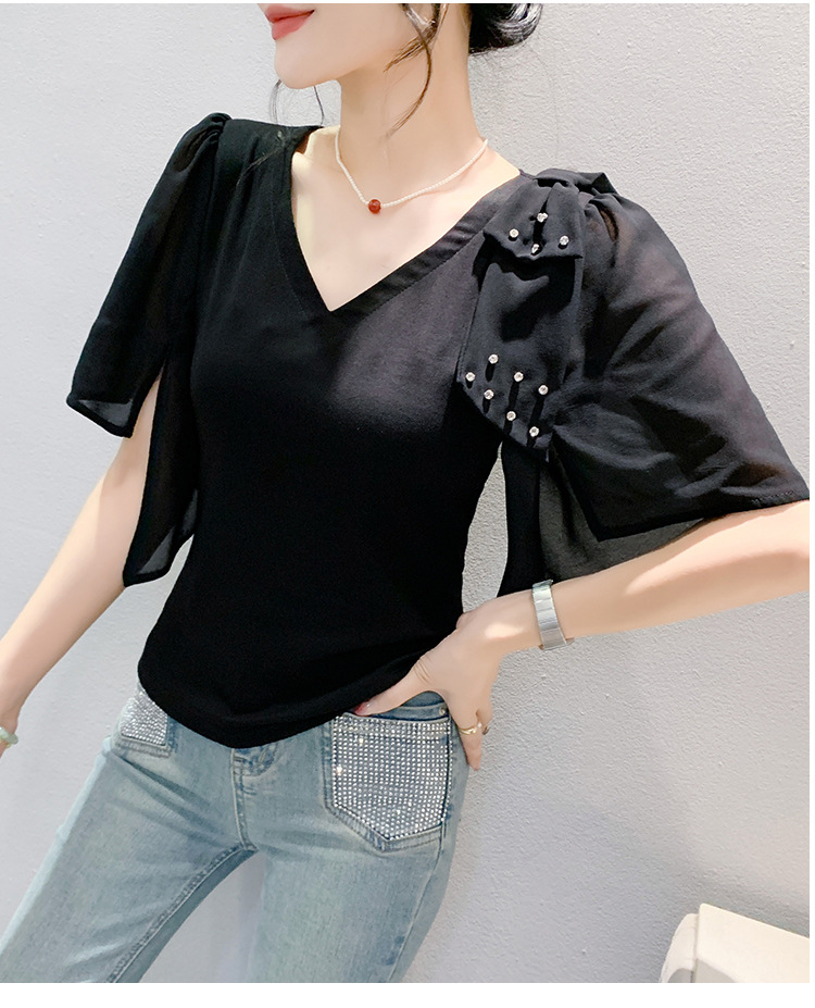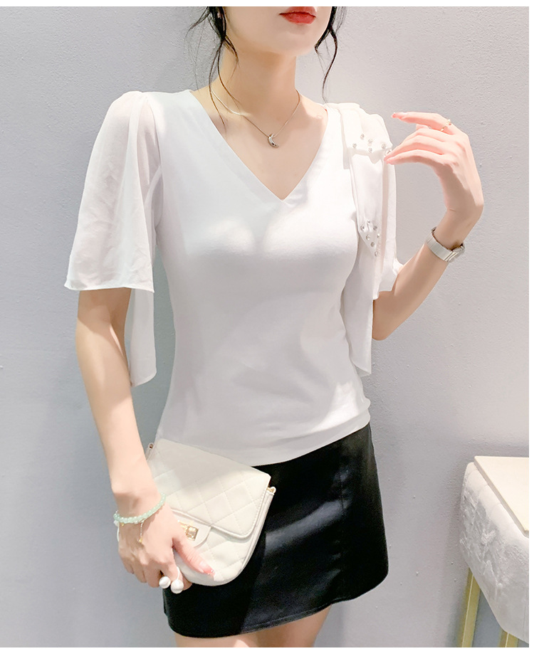 실제 촬영 여름 신작 오리지널 디자인 패셔너블하고 시크한 벨 슬리브 브이넥 여성용 다용도 티셔츠 탑 쉬폰 셔츠스토어 가기