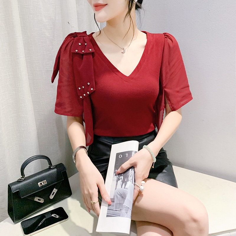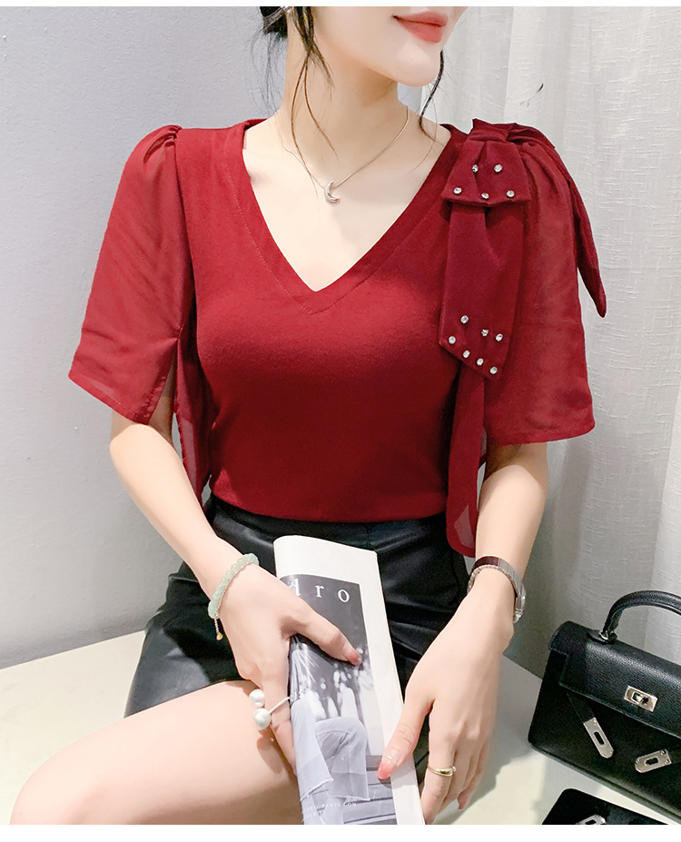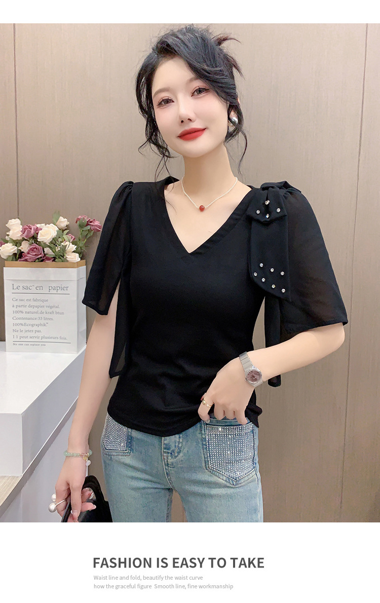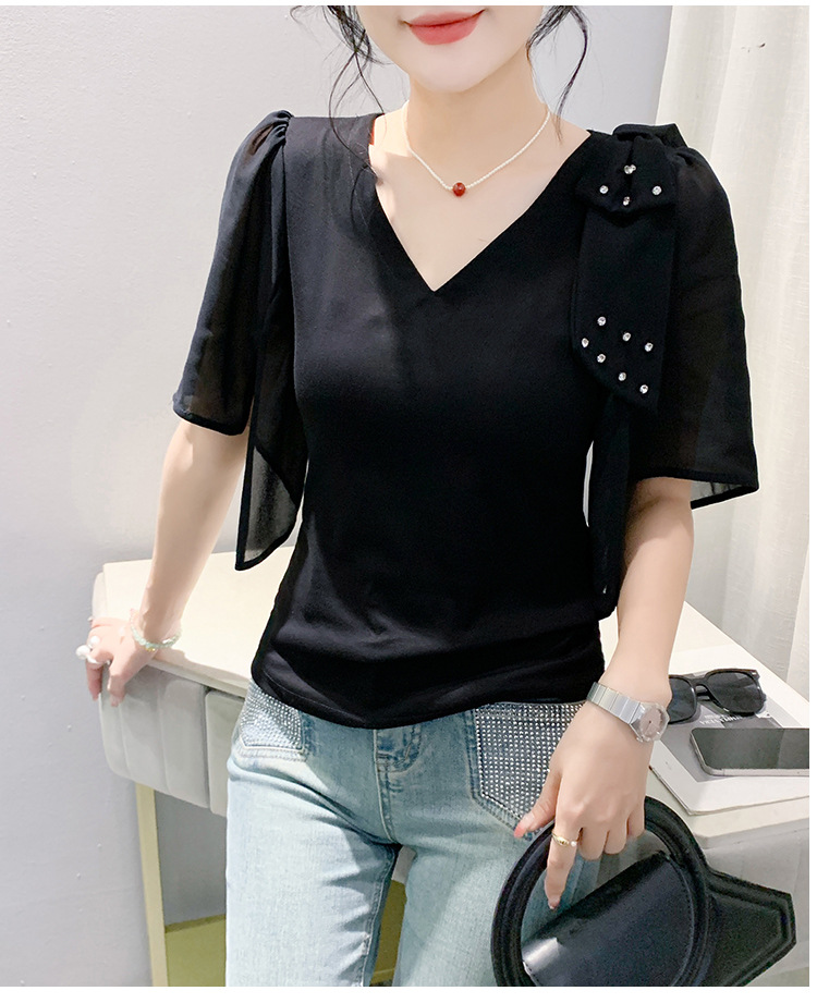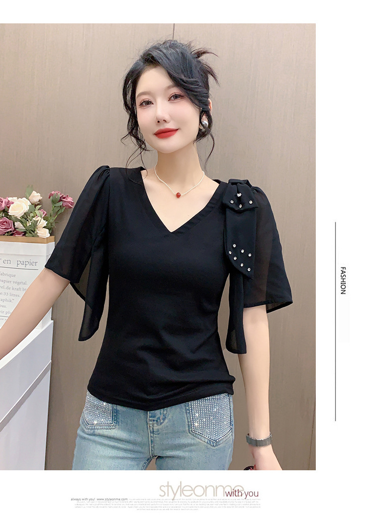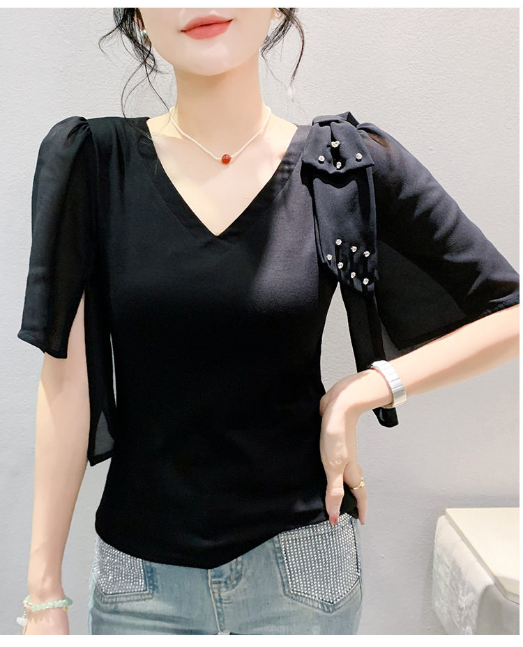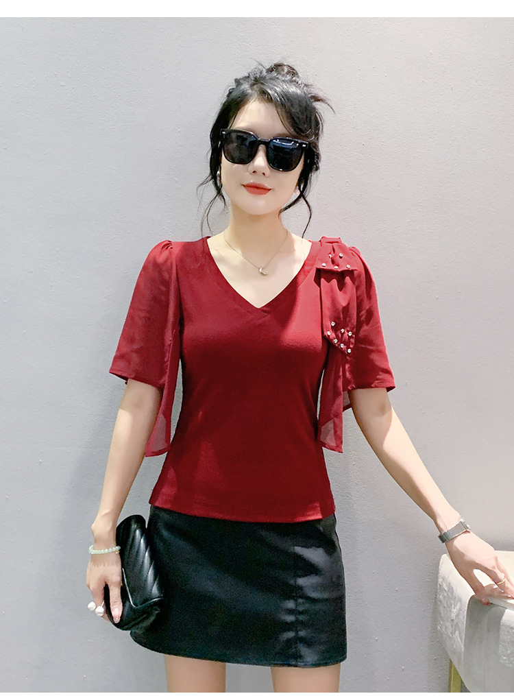 실제 촬영 여름 신작 오리지널 디자인 패셔너블하고 시크한 벨 슬리브 브이넥 여성용 다용도 티셔츠 탑 쉬폰 셔츠스토어 가기
