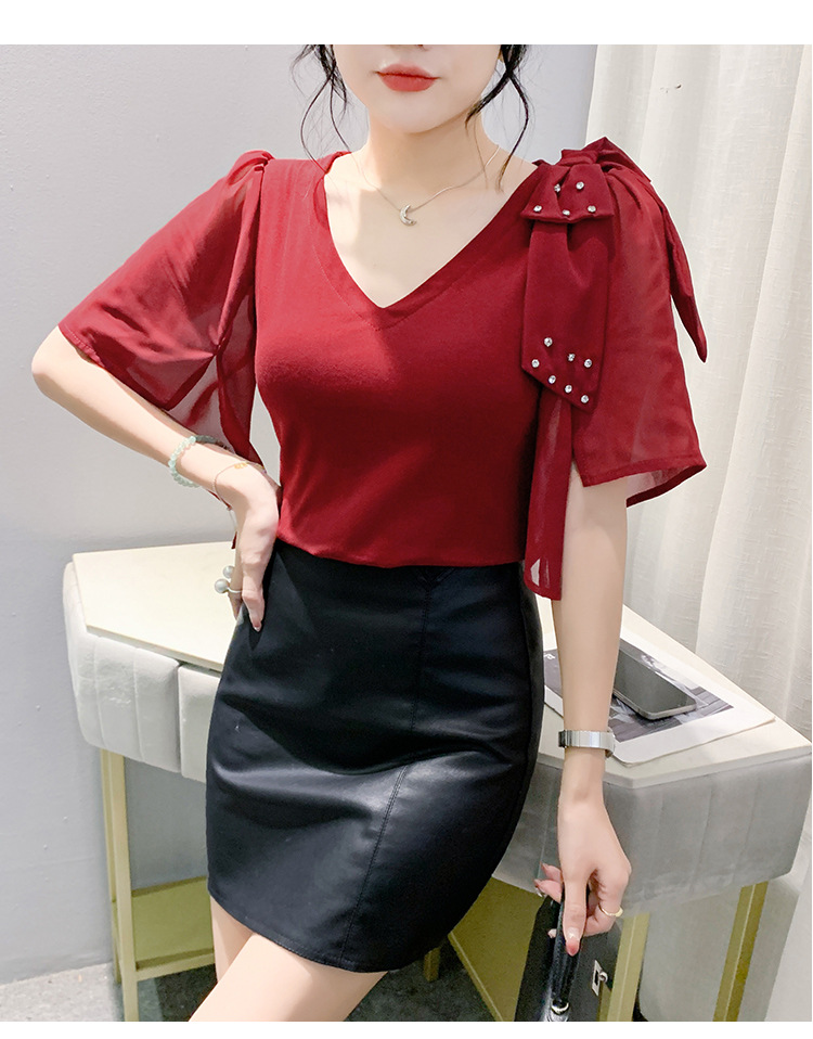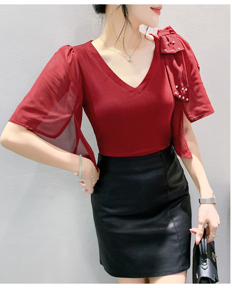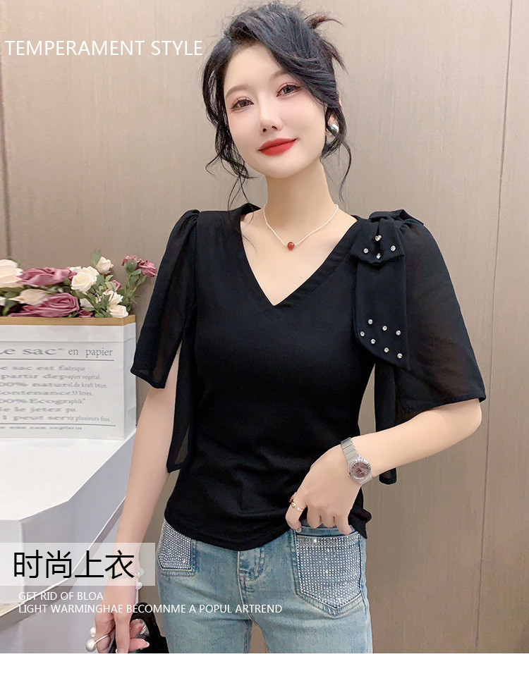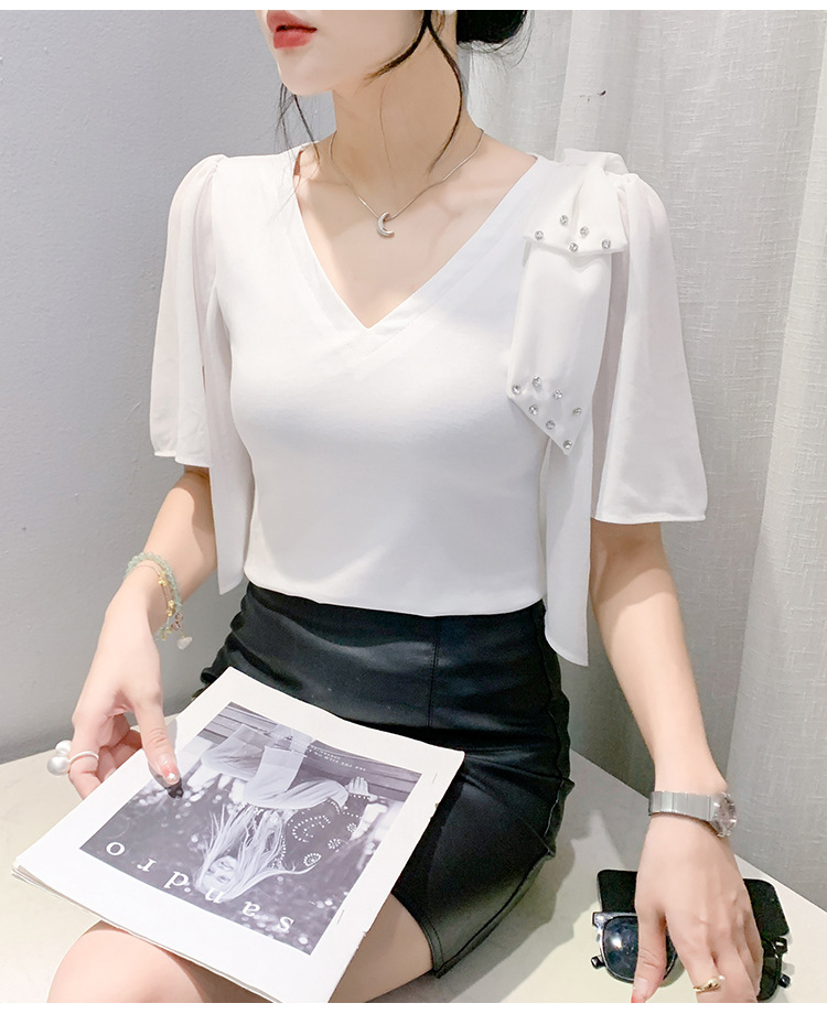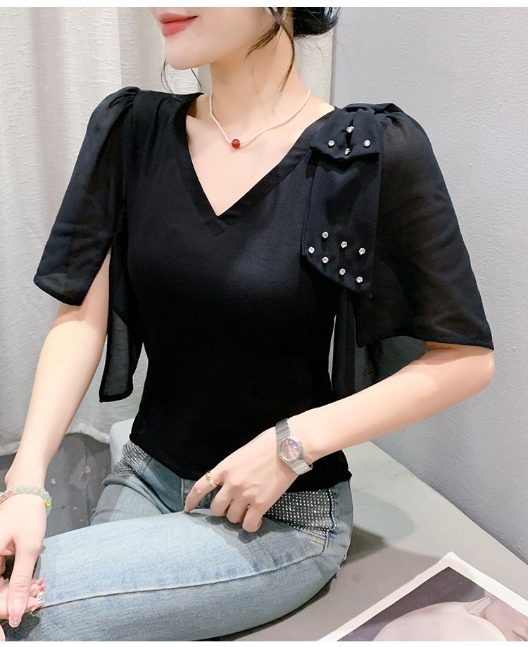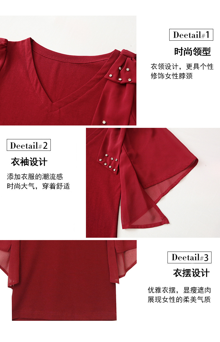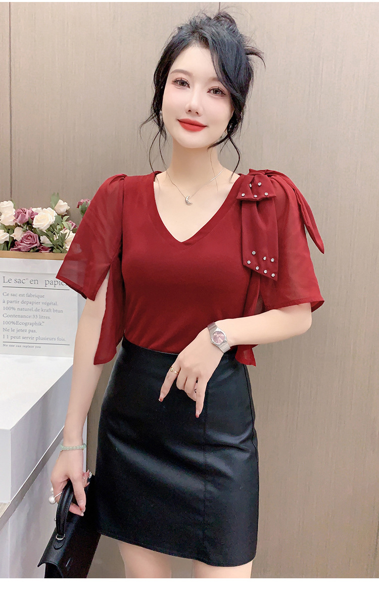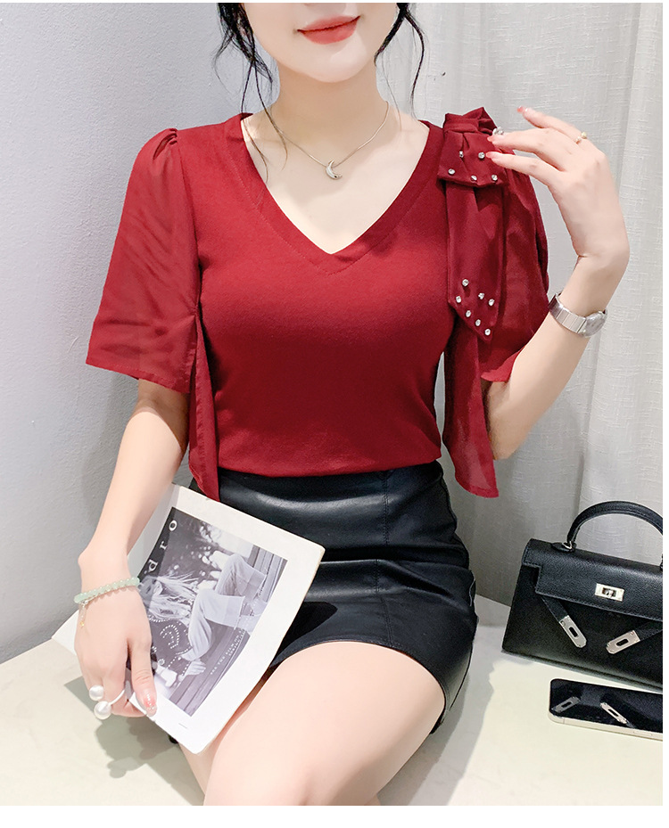 실제 촬영 여름 신작 오리지널 디자인 패셔너블하고 시크한 벨 슬리브 브이넥 여성용 다용도 티셔츠 탑 쉬폰 셔츠스토어 가기