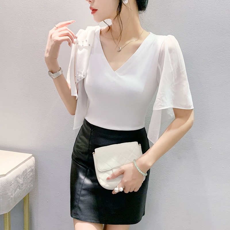 실제 촬영 여름 신작 오리지널 디자인 패셔너블하고 시크한 벨 슬리브 브이넥 여성용 다용도 티셔츠 탑 쉬폰 셔츠