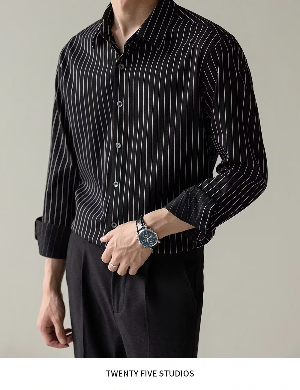 한국 데일리 통근 남성 캐주얼 셔츠, 가볍고 성숙한 루즈 라펠 스트라이프 셔츠, 봄, 가을 긴팔 기질스토어 가기