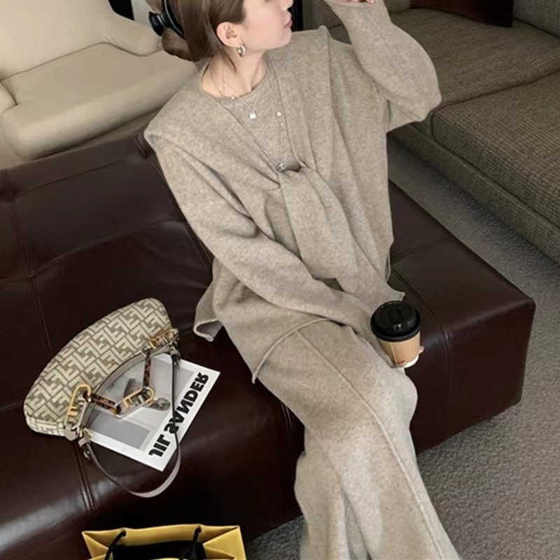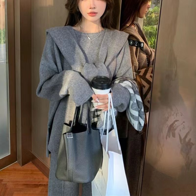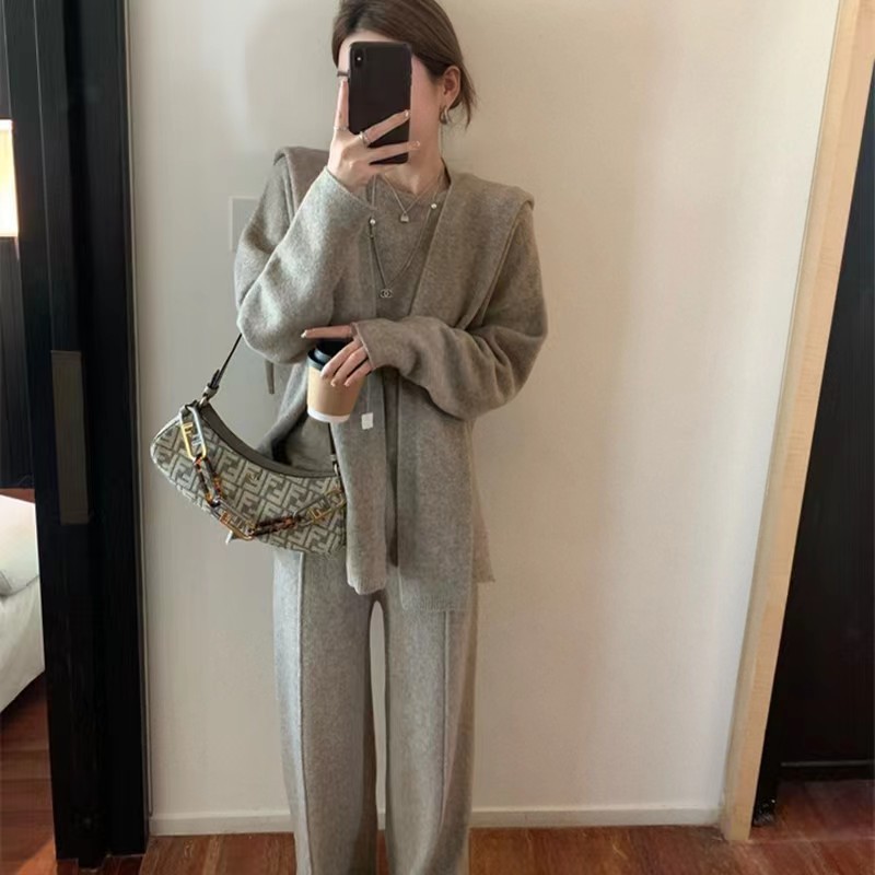 Xiaoxiangfeng 고급 드레스, 우아한 여성, 가벼운 럭셔리 한국 드라마 니트 스웨트 셔츠, 여성용 와이드 팬츠 3 피스 슈트, 가을 겨울