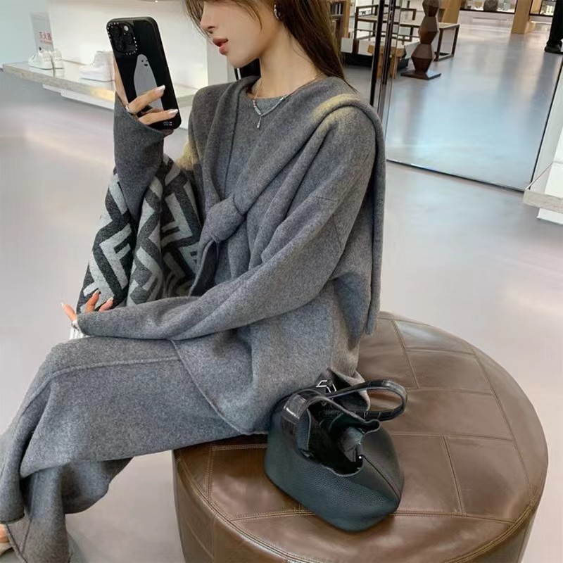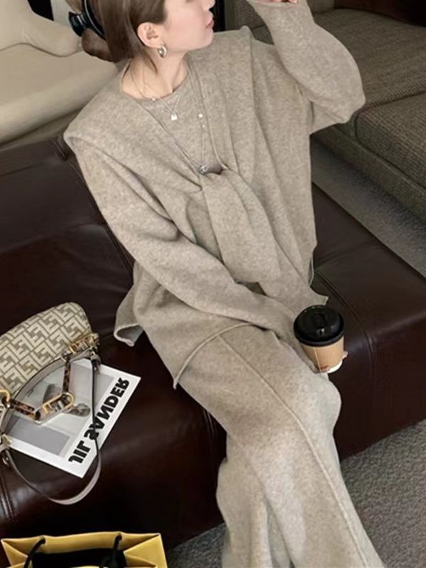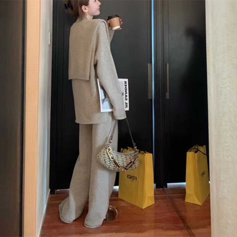 Xiaoxiangfeng 고급 드레스, 우아한 여성, 가벼운 럭셔리 한국 드라마 니트 스웨트 셔츠, 여성용 와이드 팬츠 3 피스 슈트, 가을 겨울스토어 가기
