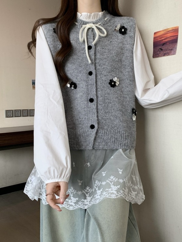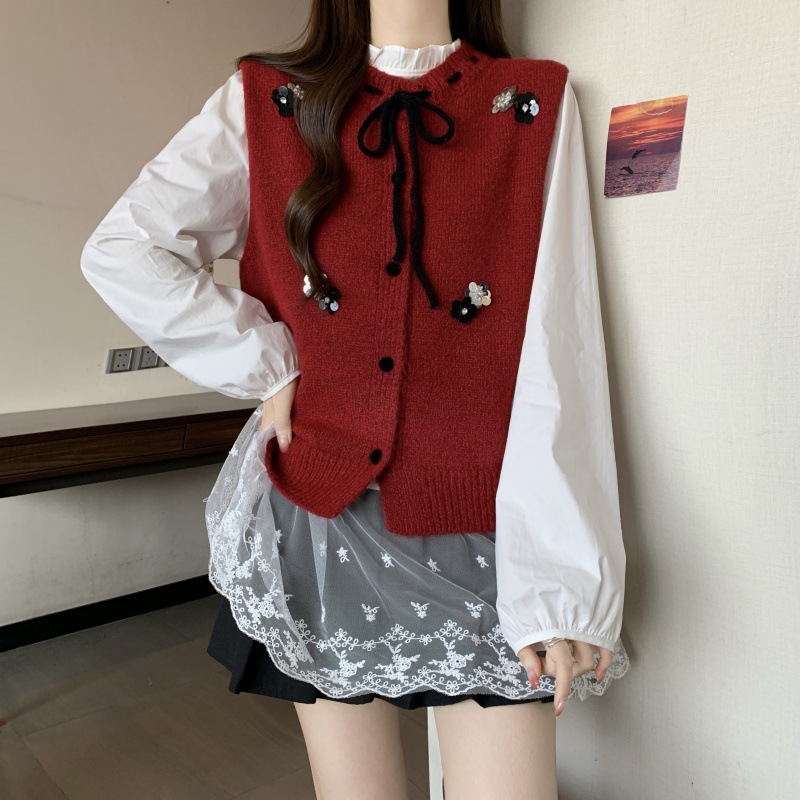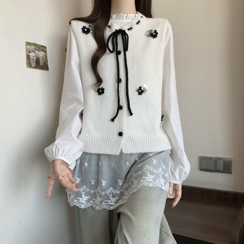 초가을 신상 니트 탑과 조끼, 레이스업 디자인, 여성용 자수 리본 외투 조끼스토어 가기