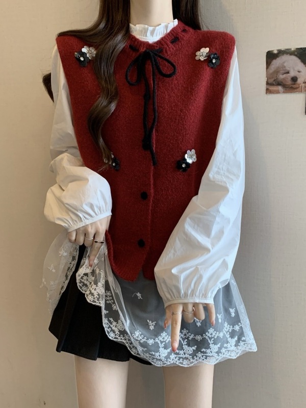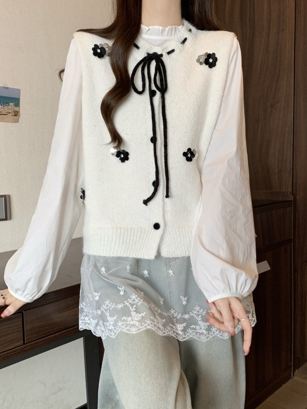 초가을 신상 니트 탑과 조끼, 레이스업 디자인, 여성용 자수 리본 외투 조끼