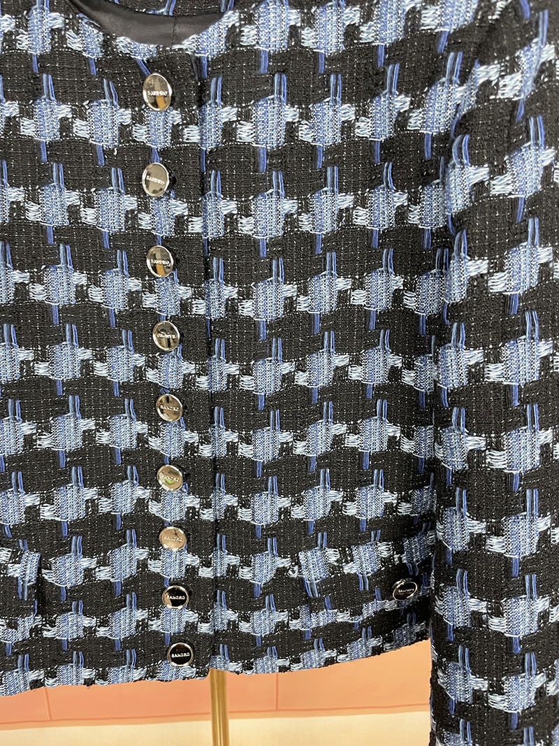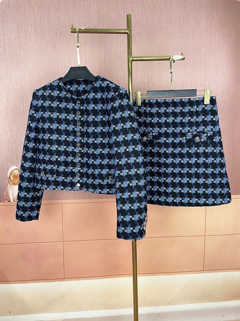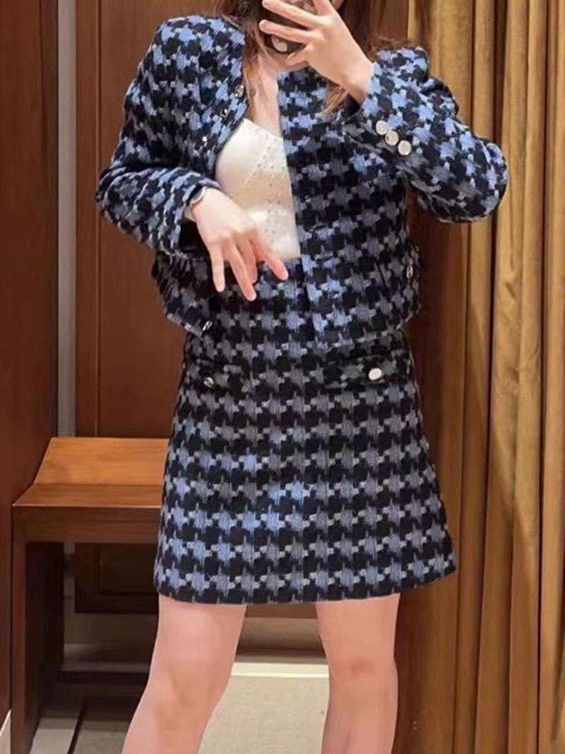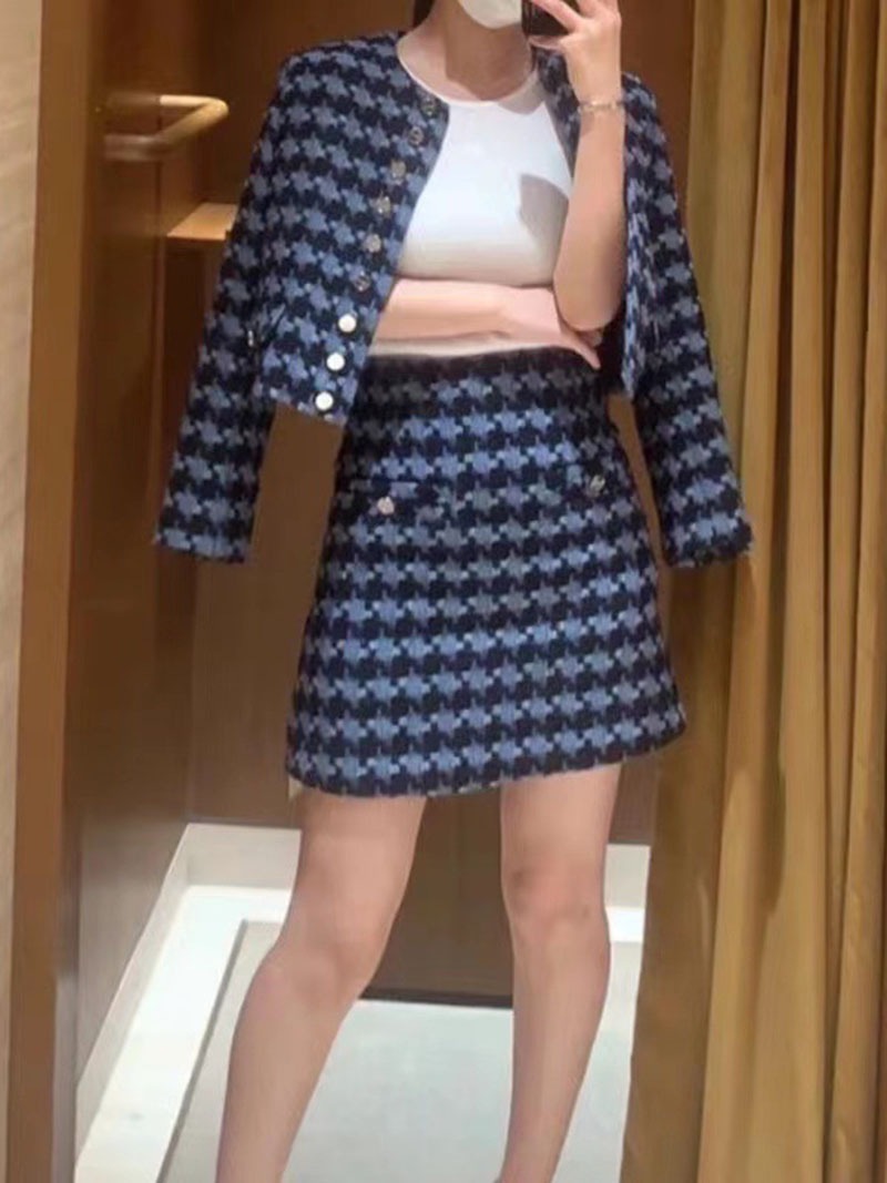 봄과 가을 새로운 여성의 우아한 라운드 넥 진한 파란색 트위드 격자 무늬 트위드 재킷과 하이 웨이스트 스커트스토어 가기