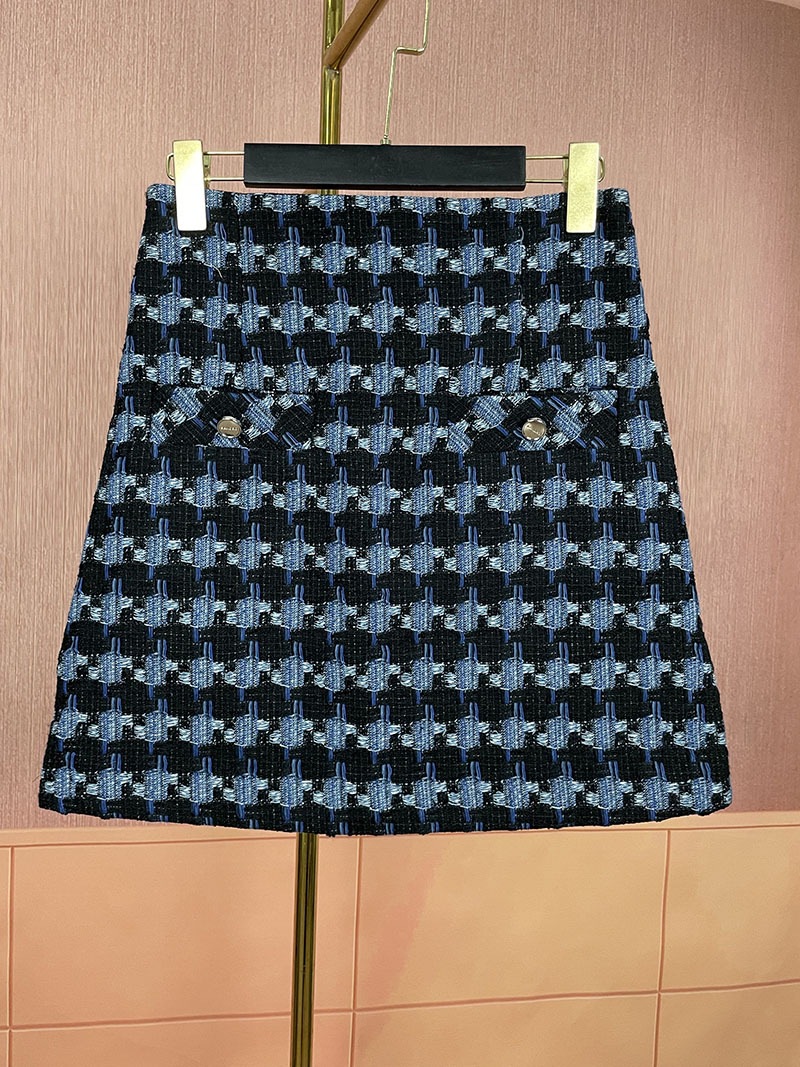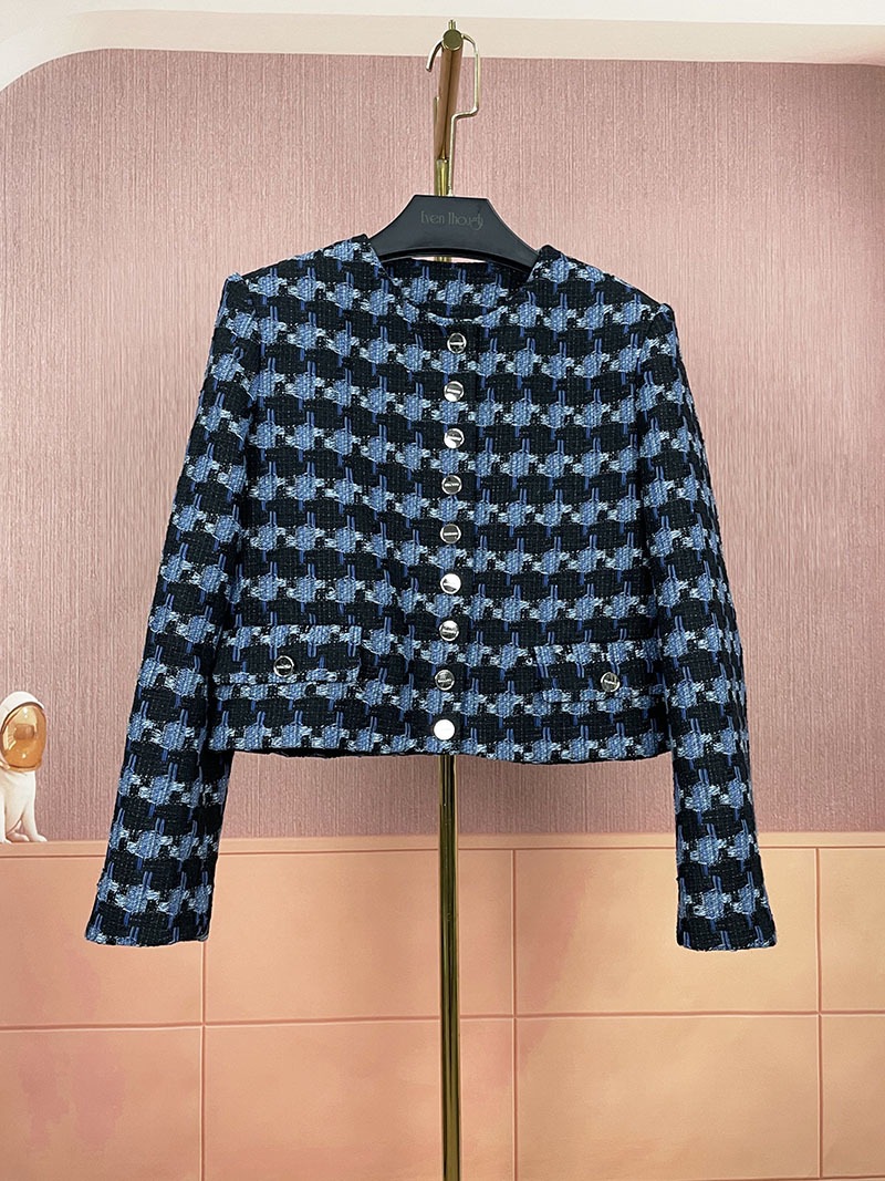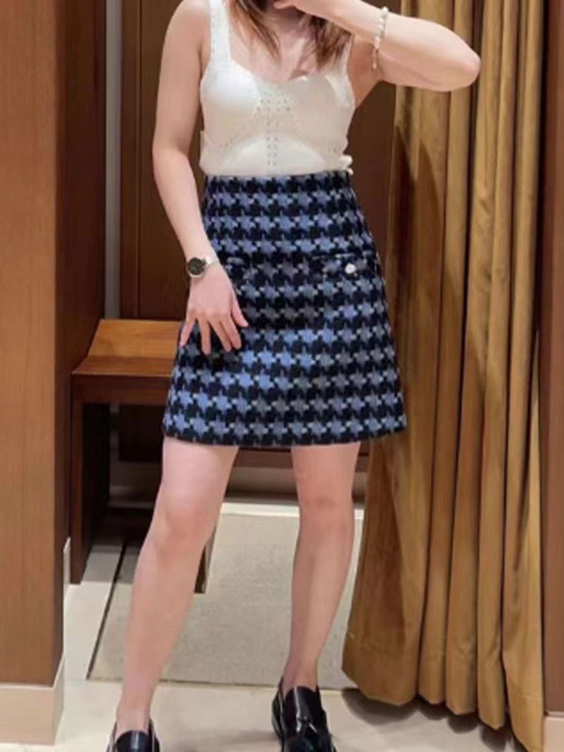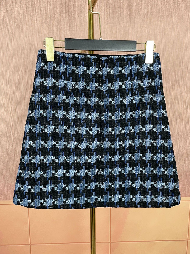 봄과 가을 새로운 여성의 우아한 라운드 넥 진한 파란색 트위드 격자 무늬 트위드 재킷과 하이 웨이스트 스커트스토어 가기