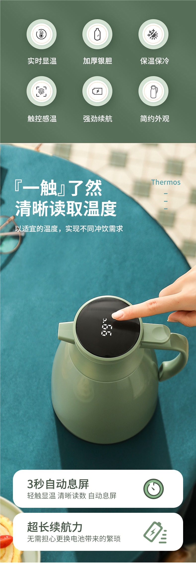 • 업그레이드 모델 [모란디 그린] 보온병 1.3L (두꺼운 은주머니 + 온도 표시 및 3년 배터리 수명 + 방진 주둥이)