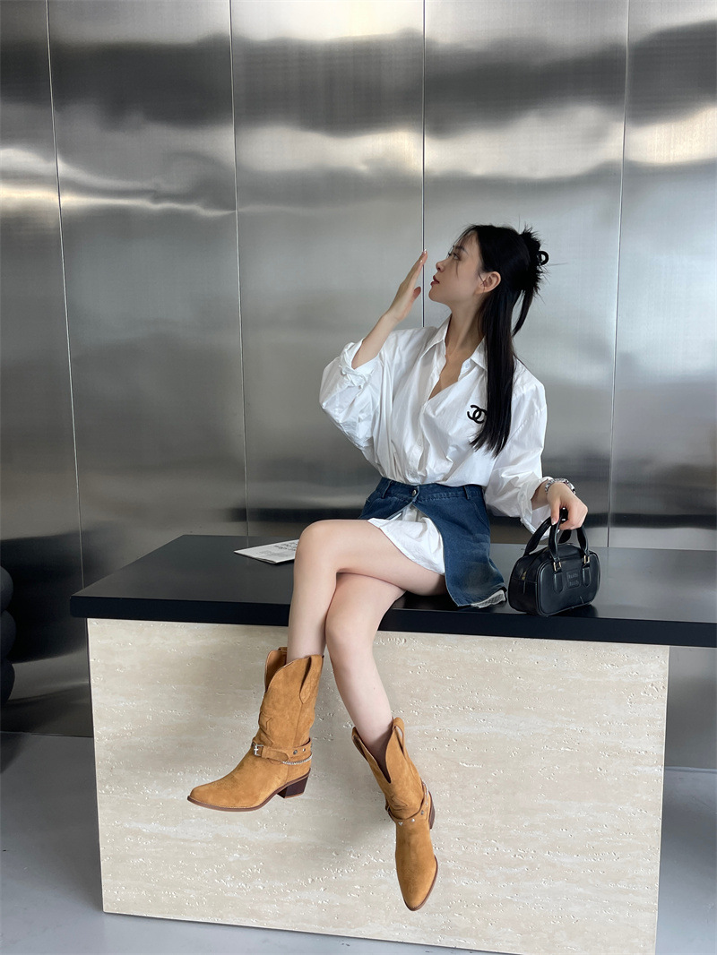 Yanni의 같은 스타일 복고풍 벨트 버클 유럽과 미국의 서양 카우보이 부츠 여성 2025 새로운 스타일 뾰족한 두꺼운 굽 중간 튜브 부츠스토어 가기