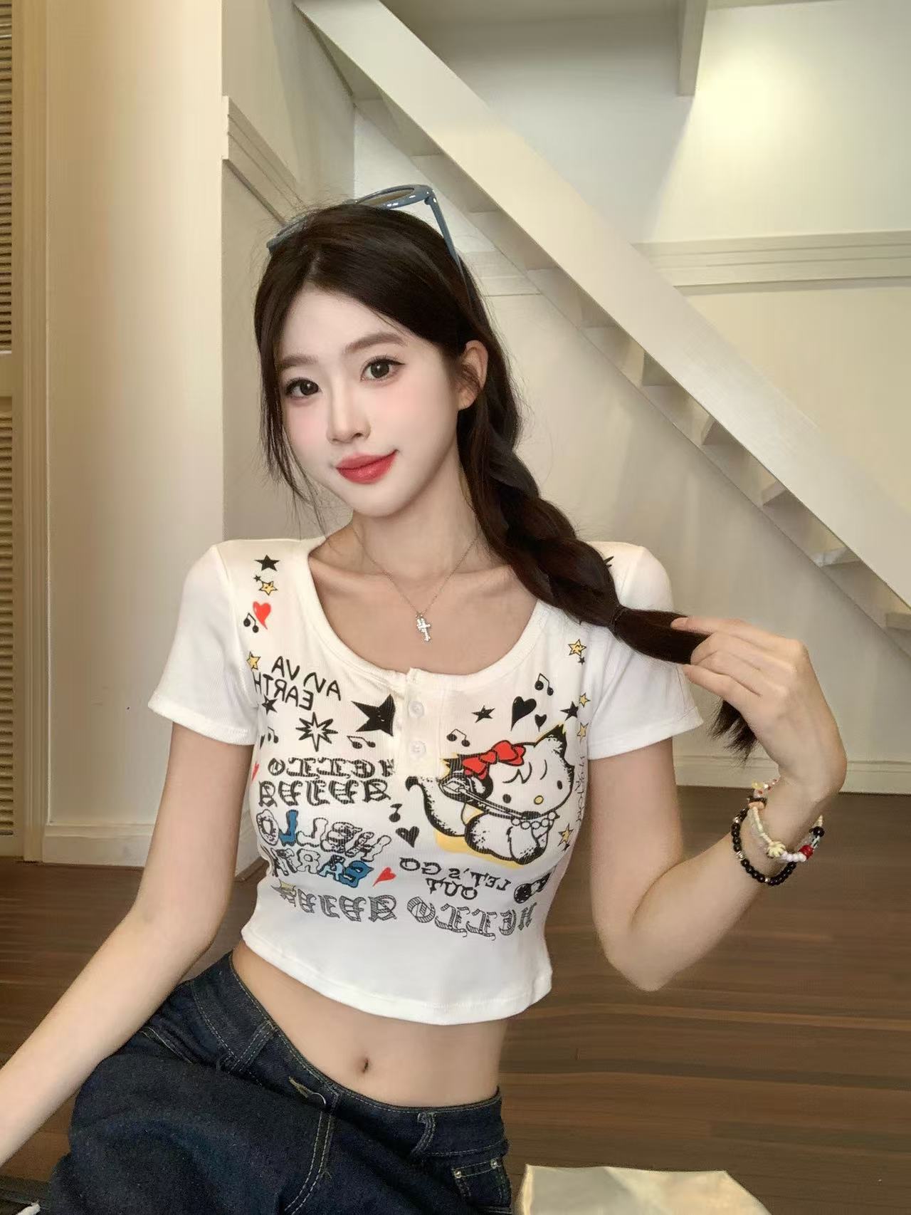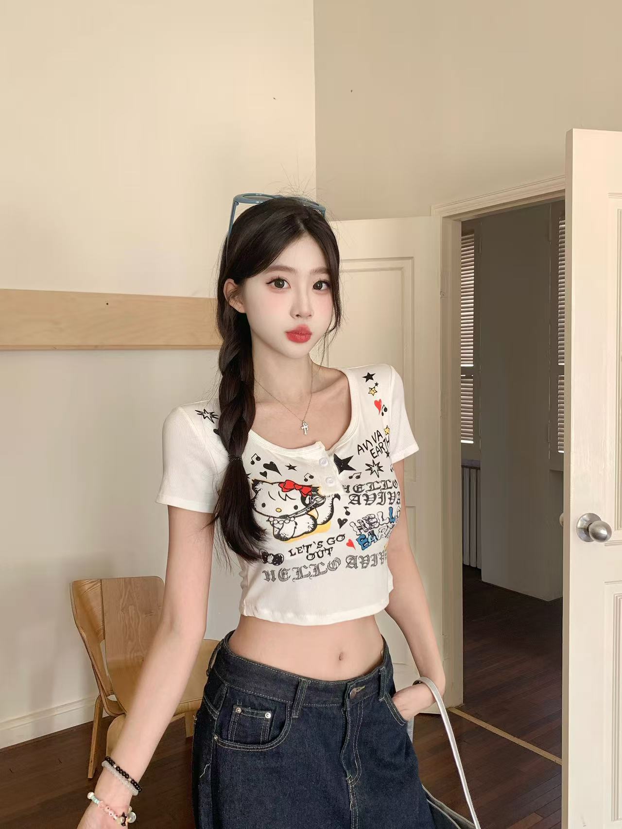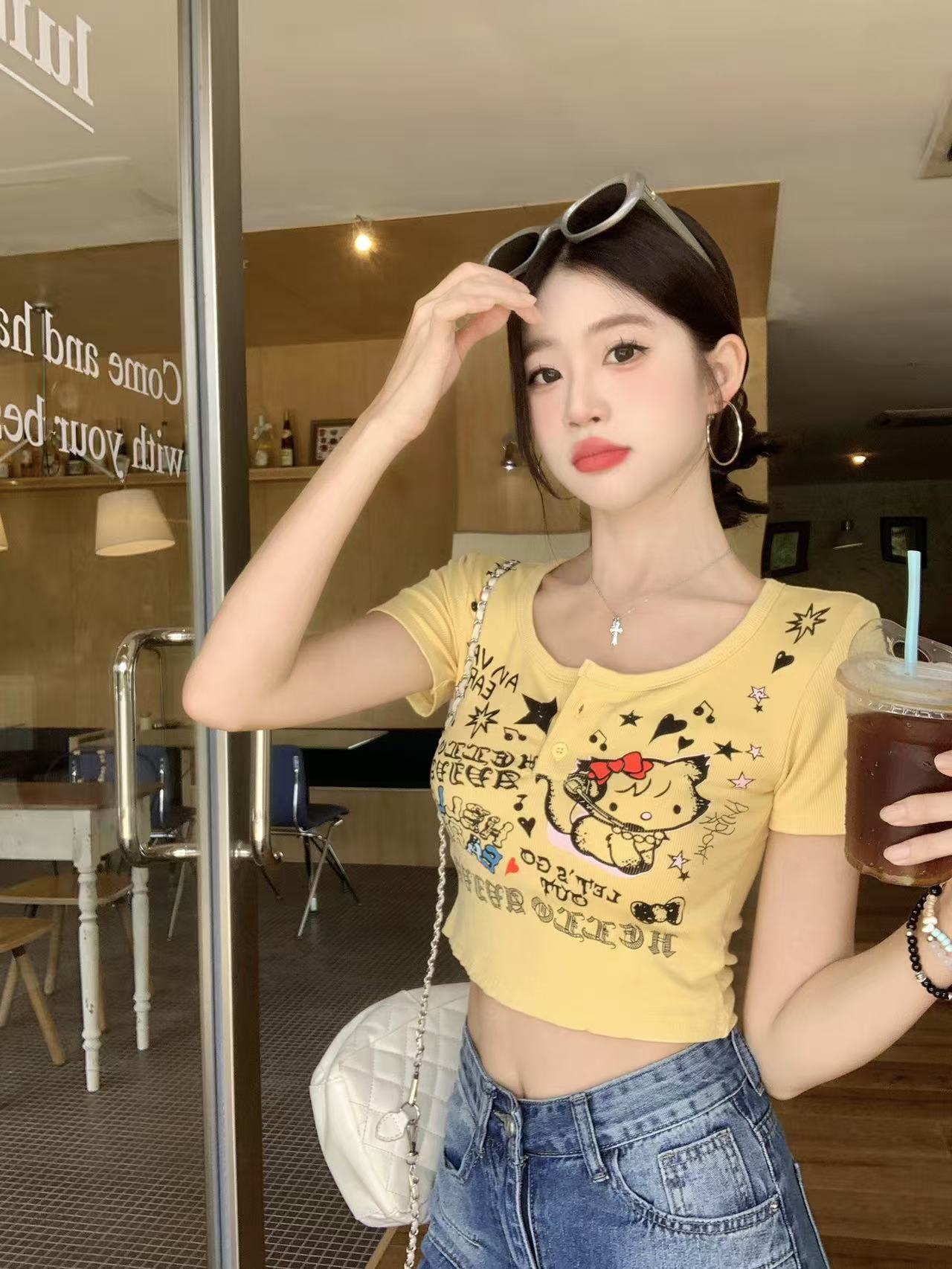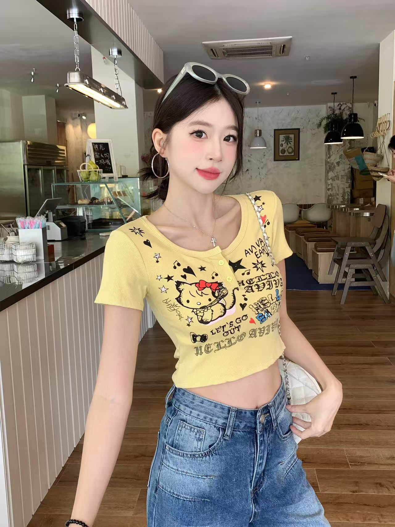 66005 # 도파민 소녀 풀 프린트 헬로 키티 캐미솔 여성 여름 스트리트 핫 소녀 짧은 크롭 탑