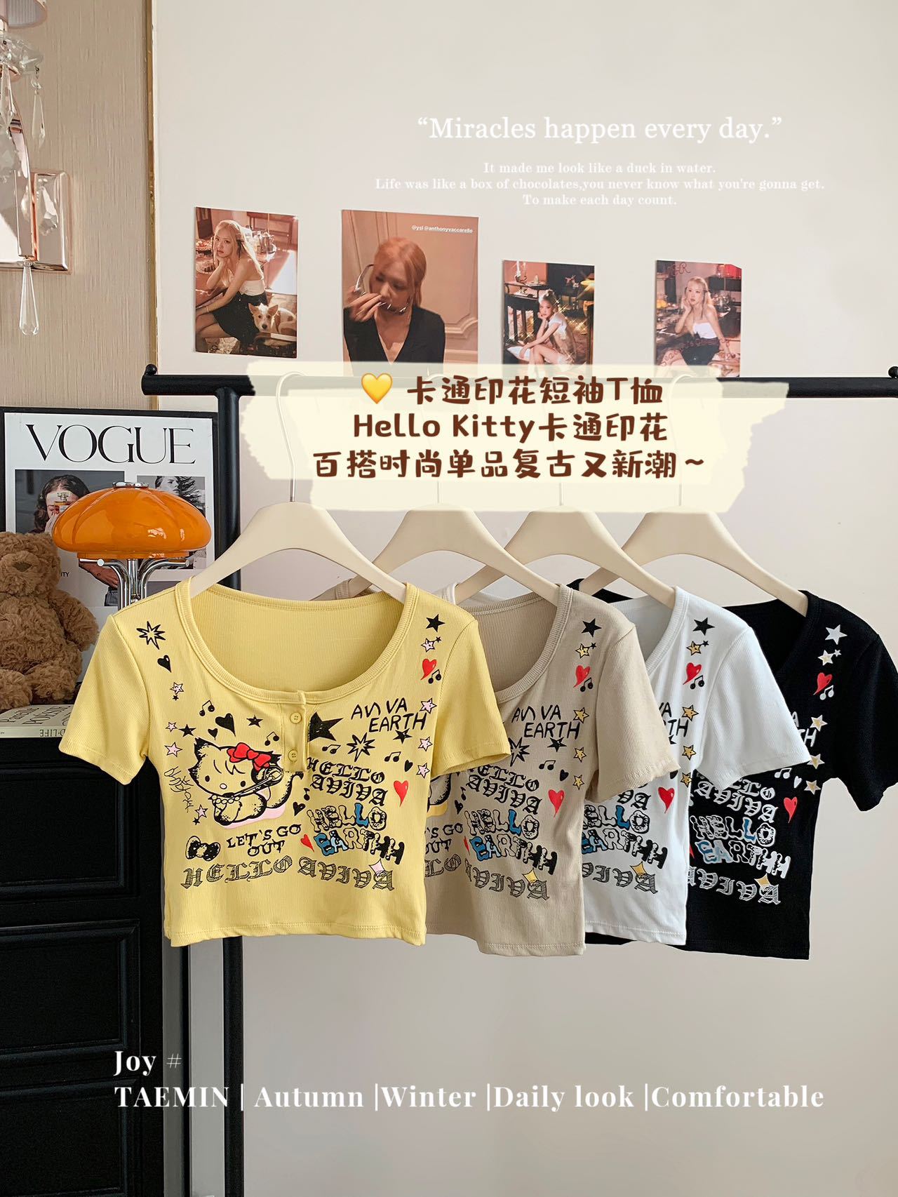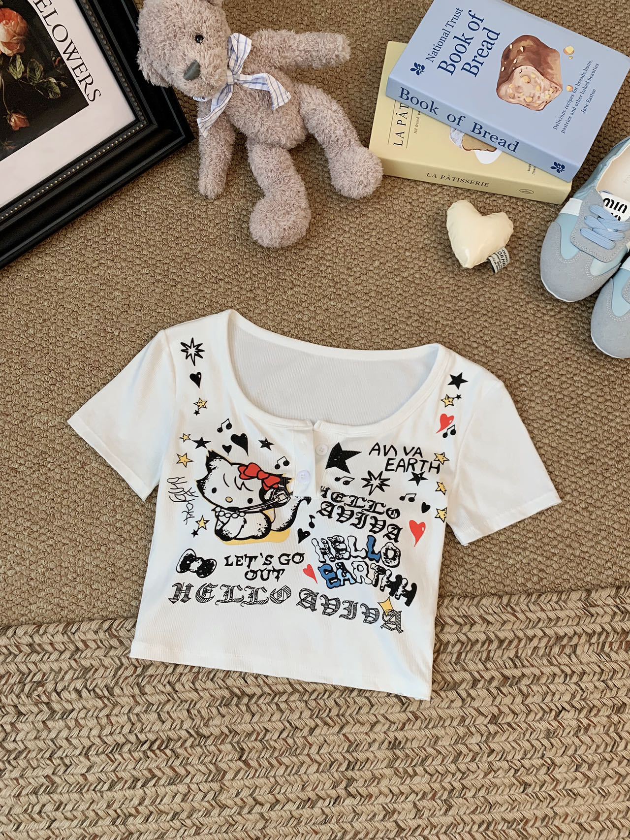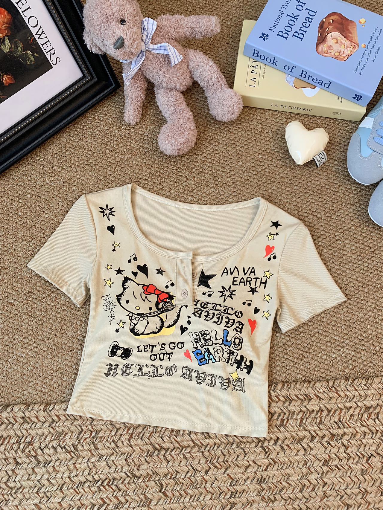 66005 # 도파민 소녀 풀 프린트 헬로 키티 캐미솔 여성 여름 스트리트 핫 소녀 짧은 크롭 탑스토어 가기