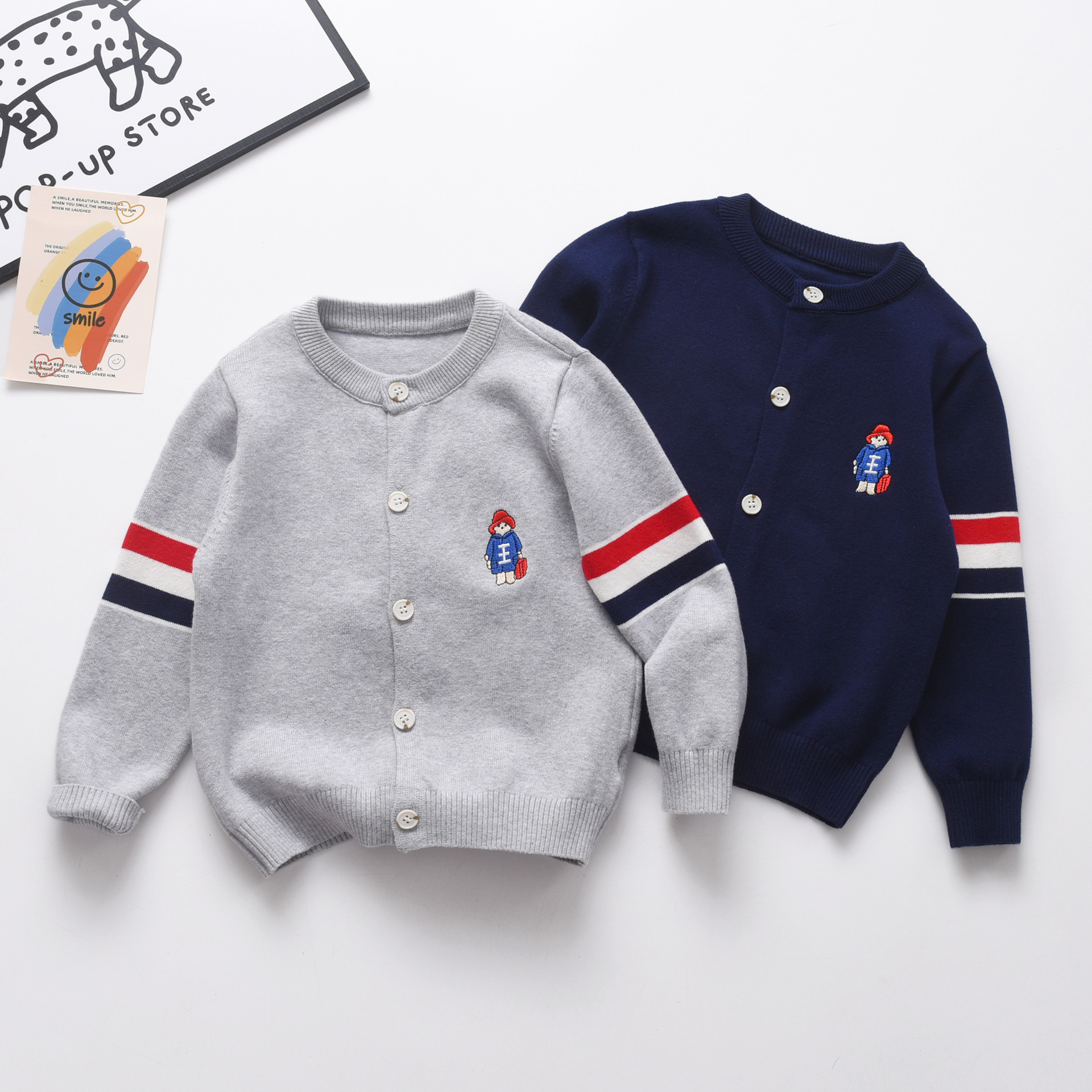 중대형 어린이를 위한 트렌디한 니트 가디건 2025 가을 신상 싱글 레이어 면 라운드 넥 자수 만화 스트라이프 탑스토어 가기
