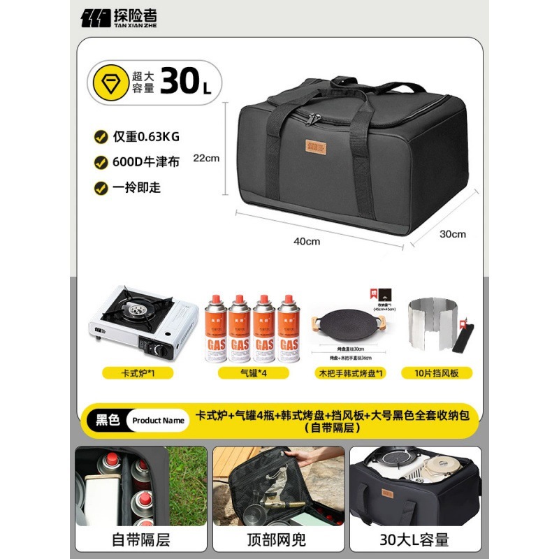 • 카세트 스토브 + 가스 탱크 4병 + 한국식 베이킹 팬 + 앞 유리 + 대형 검정색 전체 수납 가방(수납 공간 포함)