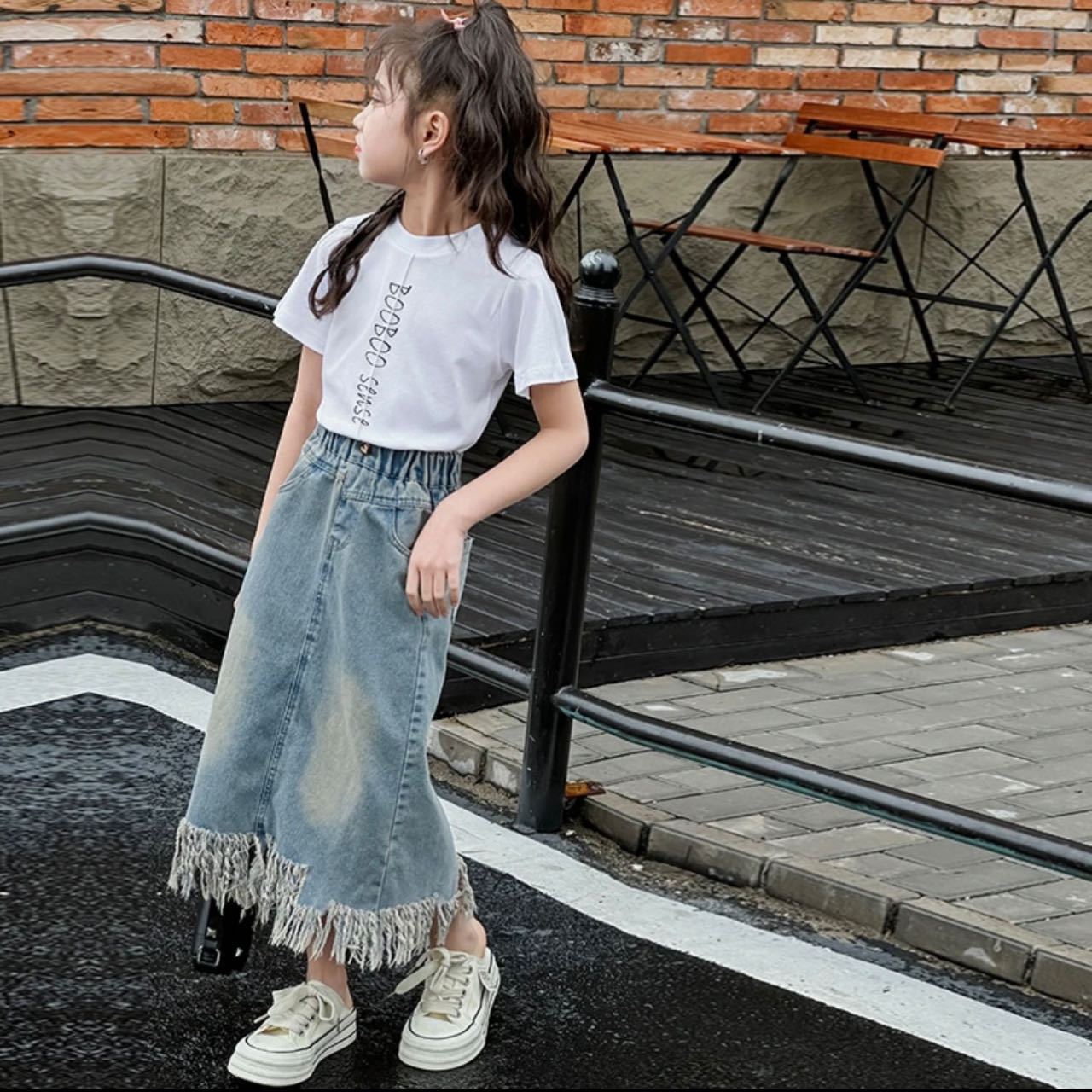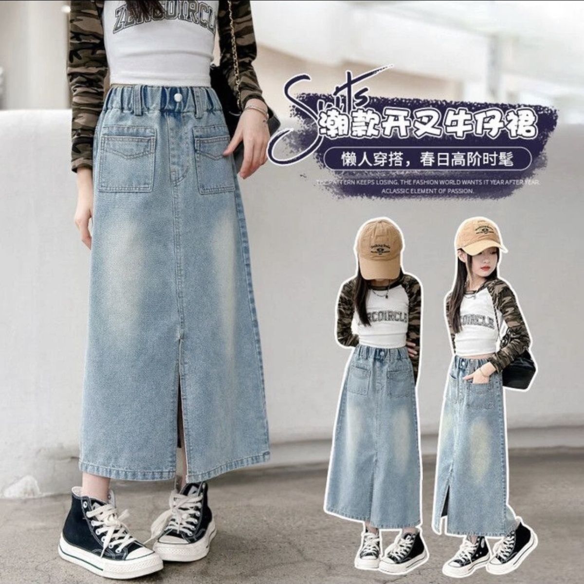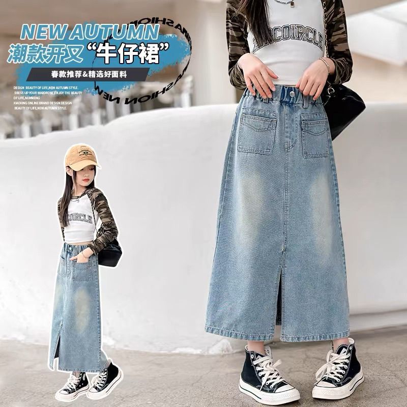 여아 데님 스커트 2025 봄 가을 신작 인터넷 연예인 스트리트 스타일 중대형 아동 여름 한국 슬릿 롱 스커트