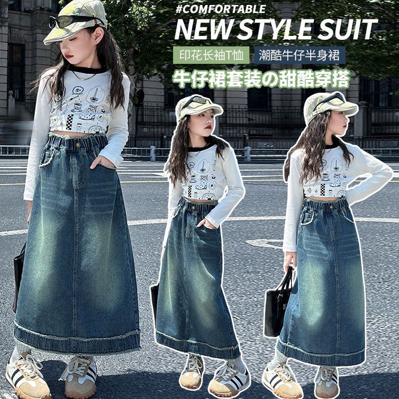 여아 데님 스커트 2025 봄 가을 신작 인터넷 연예인 스트리트 스타일 중대형 아동 여름 한국 슬릿 롱 스커트스토어 가기