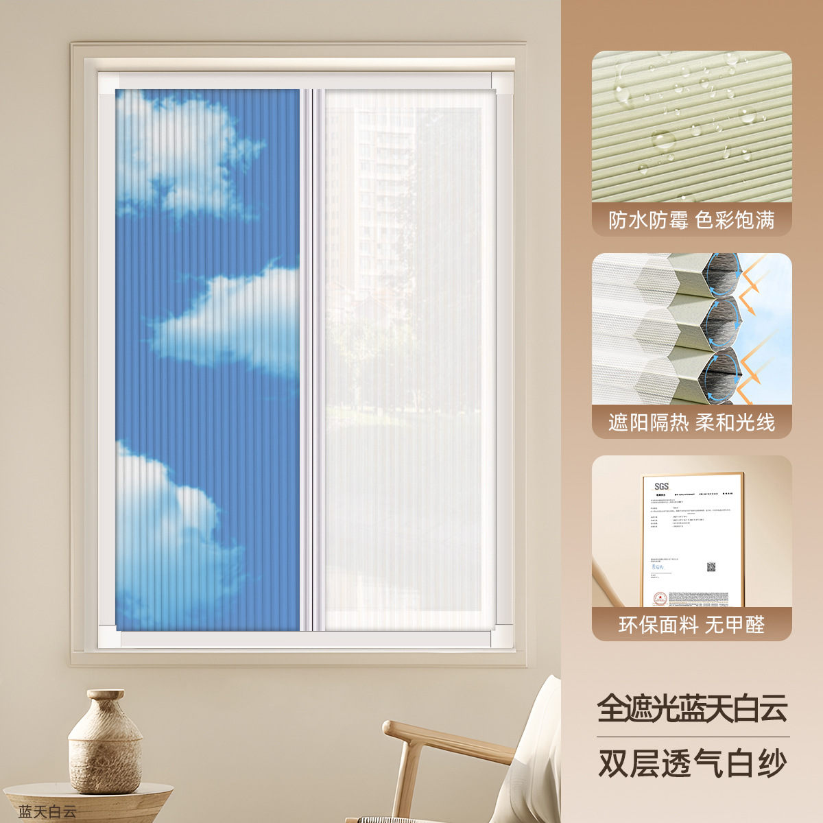 • [차양 및 단열] 푸른 하늘과 흰 구름으로 완전 암막 + 통기성이 뛰어난 이중 흰색 거즈