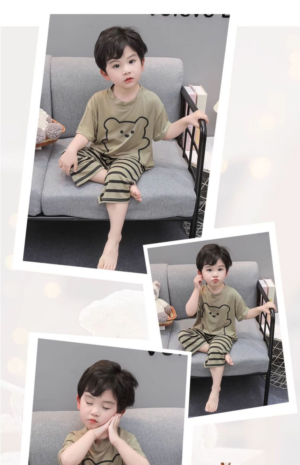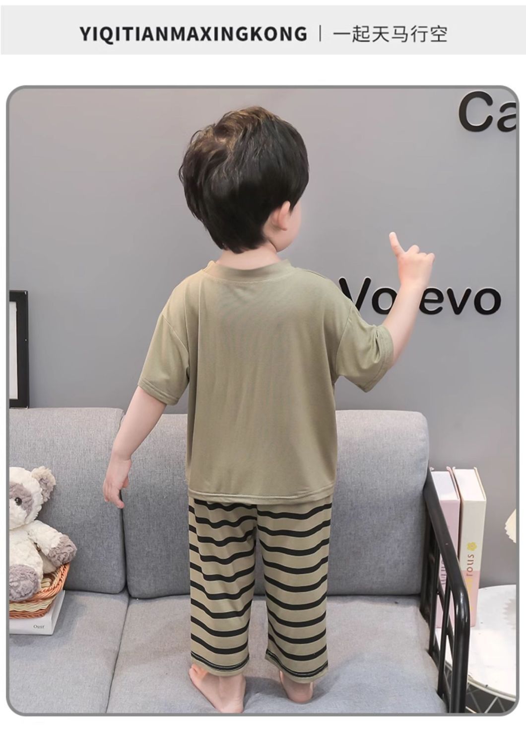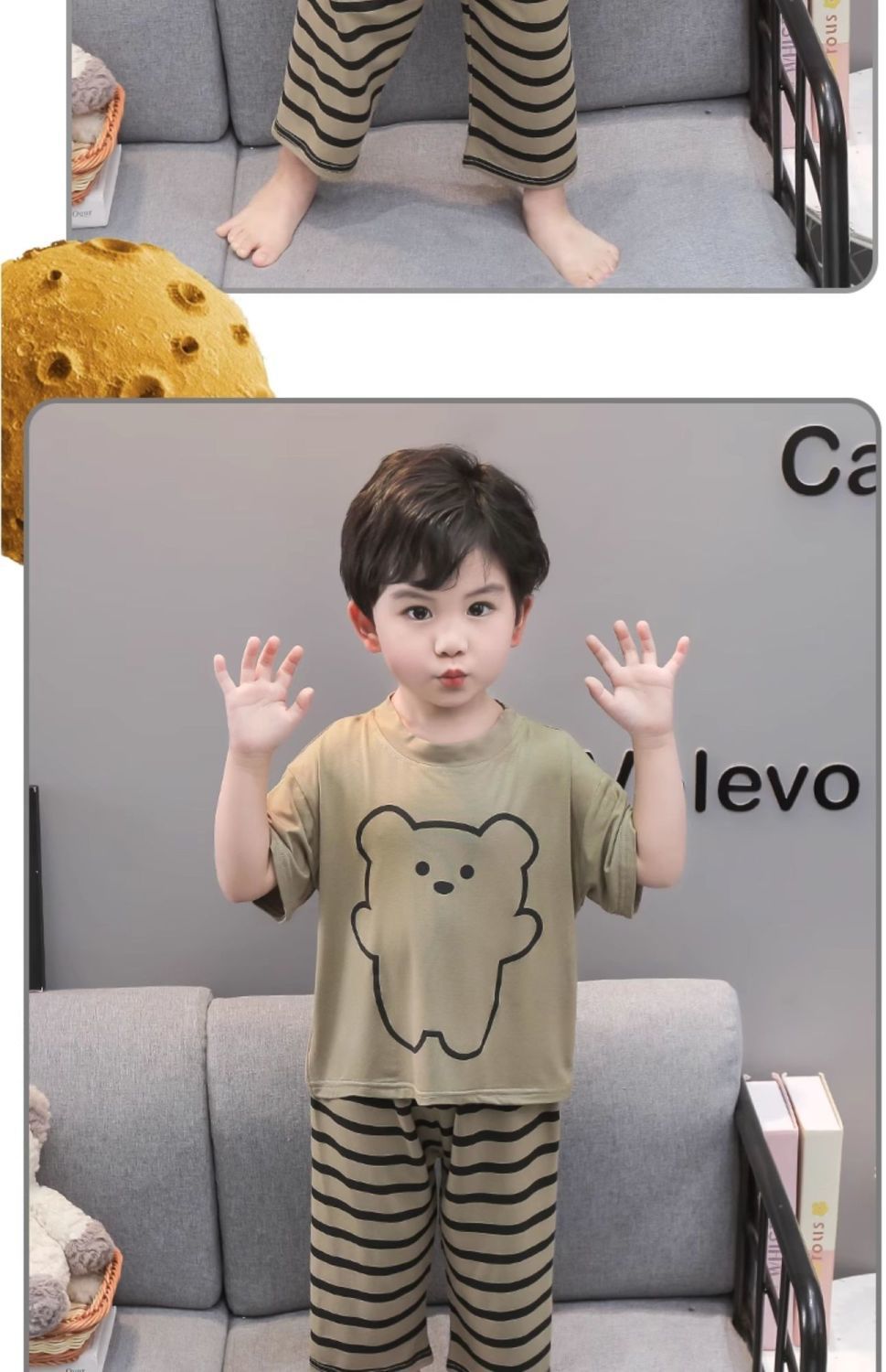 소년과 어린이 잠옷 세트 2025 새로운 스타일 아기 모달 반팔 줄무늬 바지 아기 가정 의류 투피스 세트스토어 가기