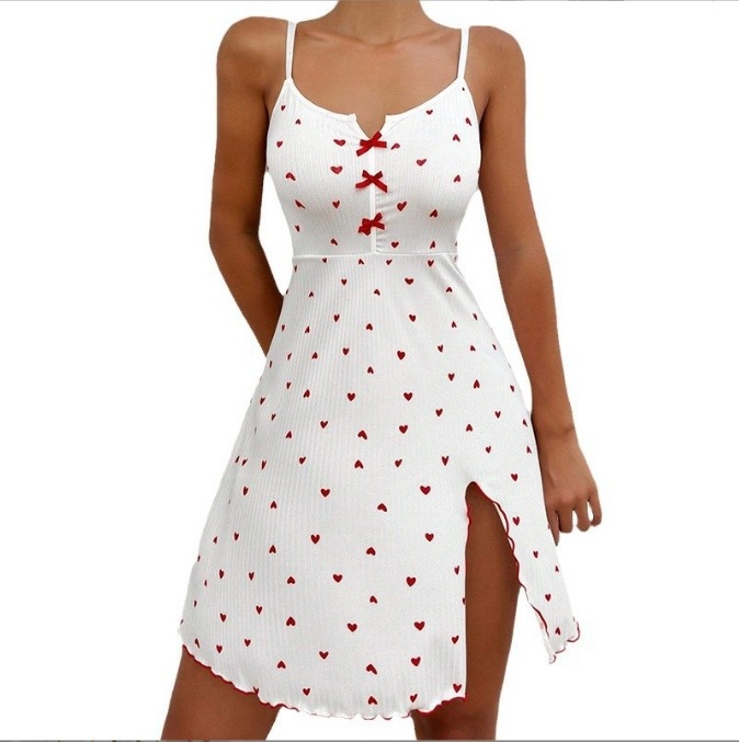크로스보더 아마존 러브 프린트 스레드 프론트 슬릿 딥 V 서스펜더 스커트 나이트가운 파자마 홈웨어 아우터웨어