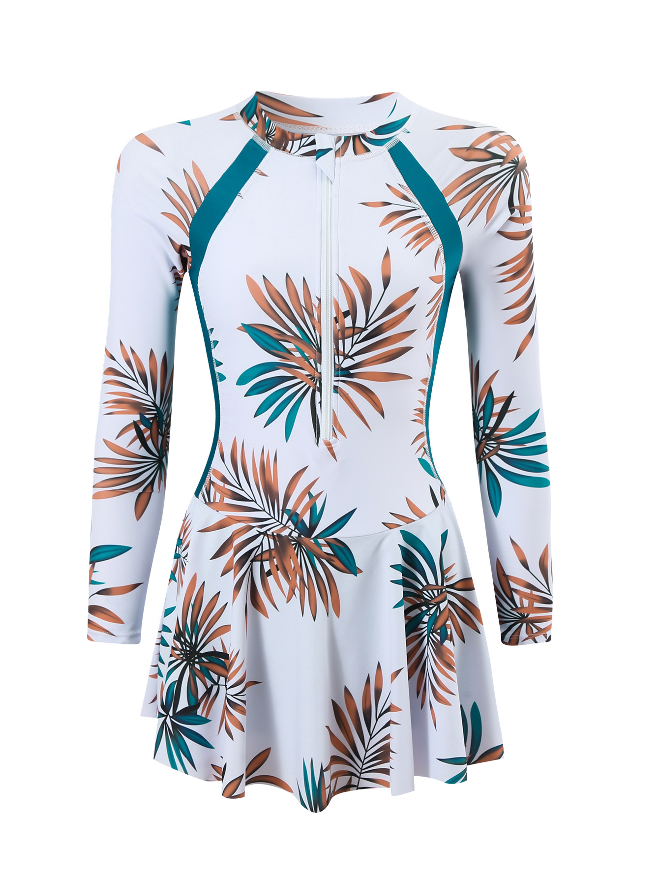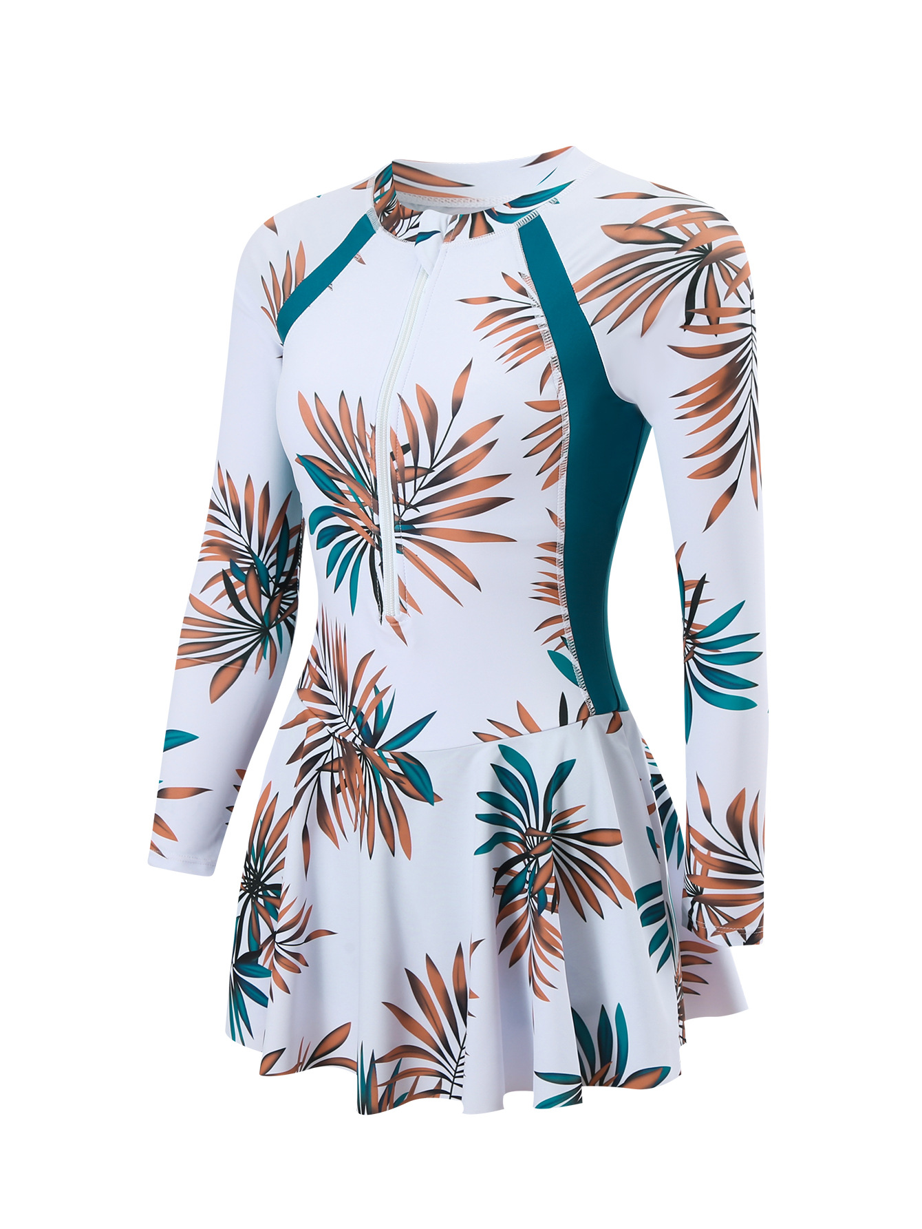 국경 간 새로운 유럽과 미국의 지퍼 디지털 인쇄 식물 인쇄 긴팔 원피스 스커트 수영복 도매