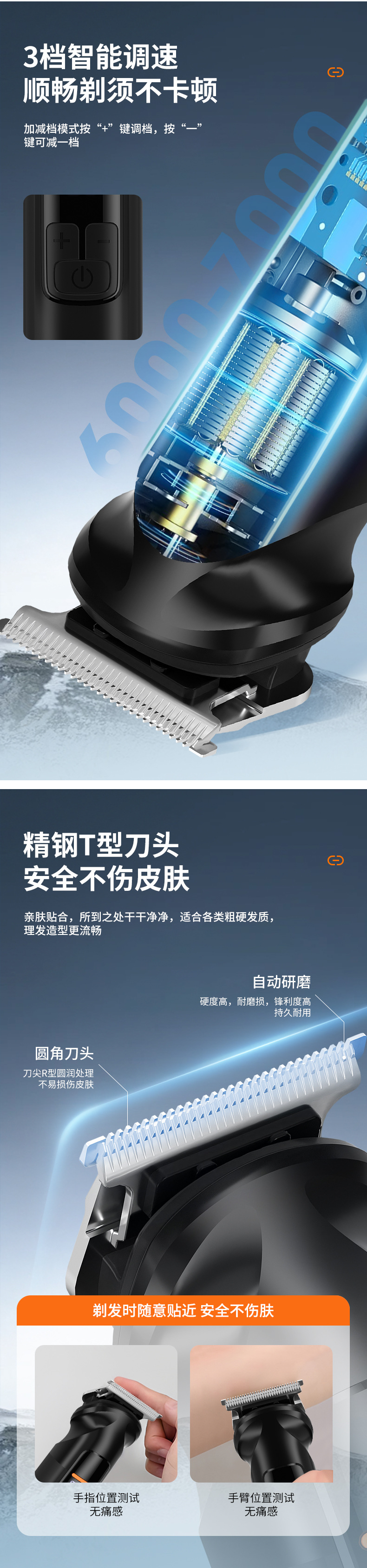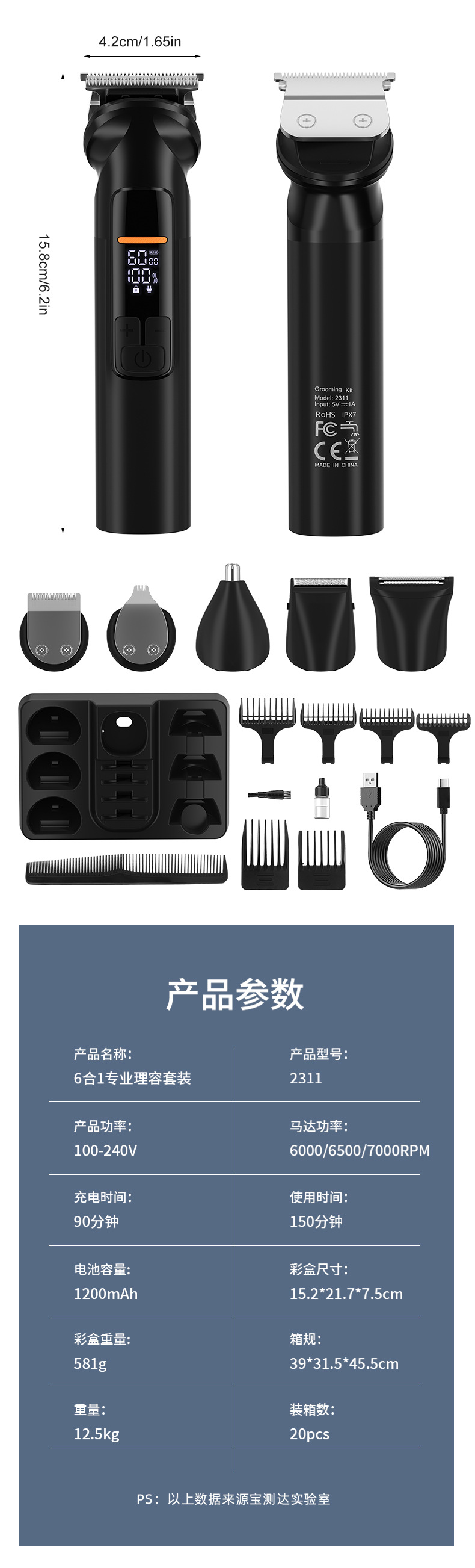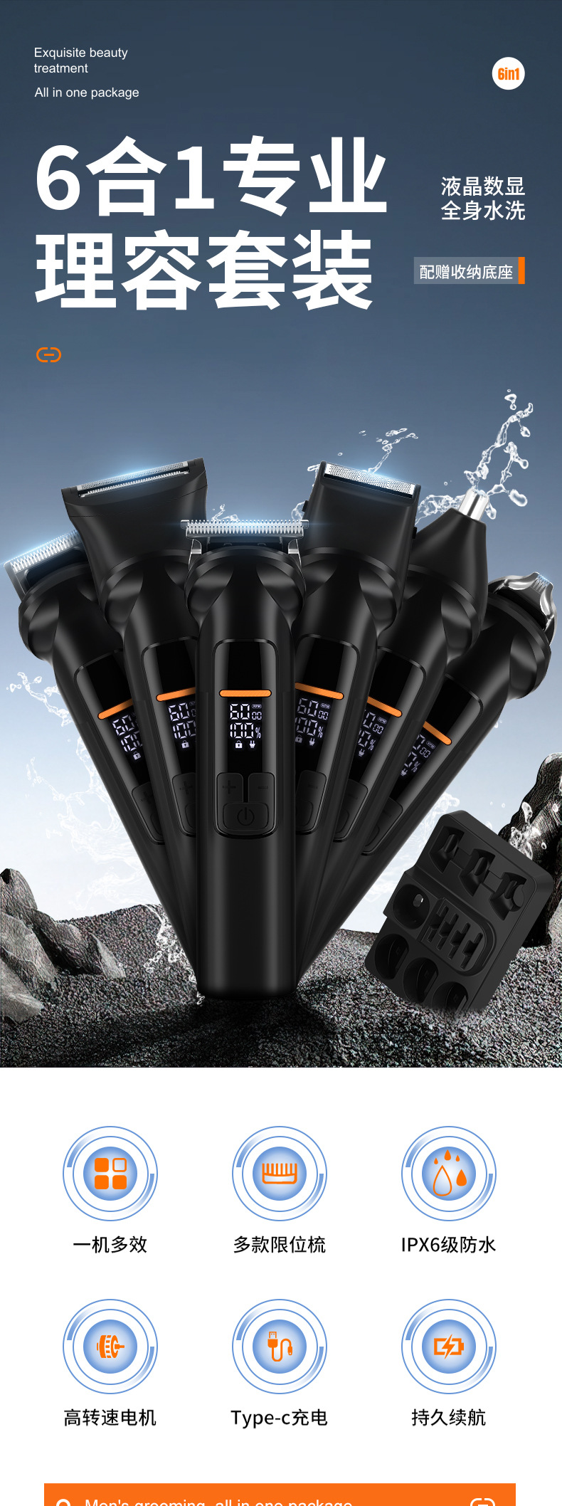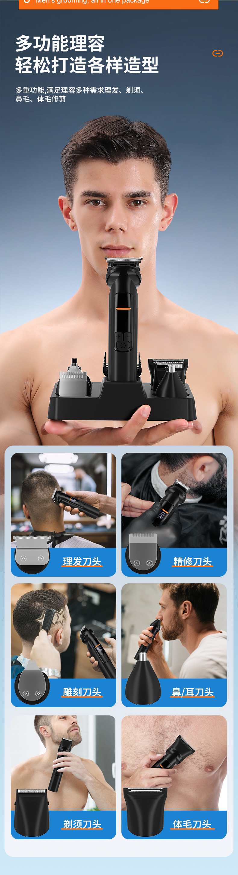 产品配件:主机+理发刀头+雕刻刀头+鼻毛修剪器+鬓角刀头+刮胡刀头+英文说明书+TYPE-C充电线+调节梳*6+清洁刷+油瓶+底座+梳子