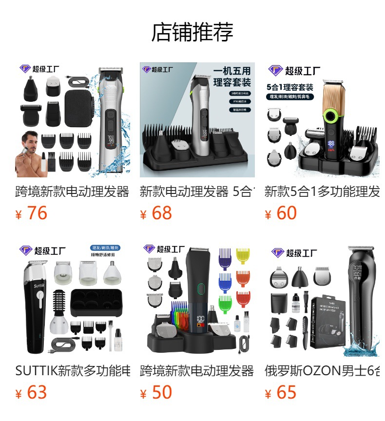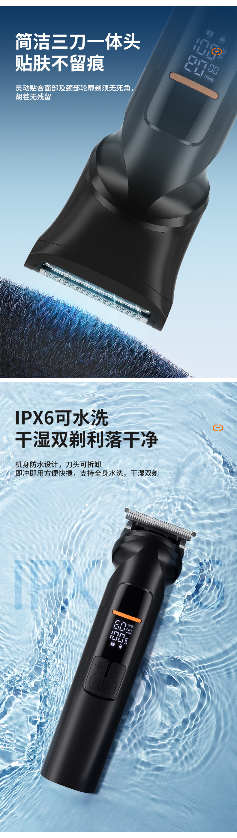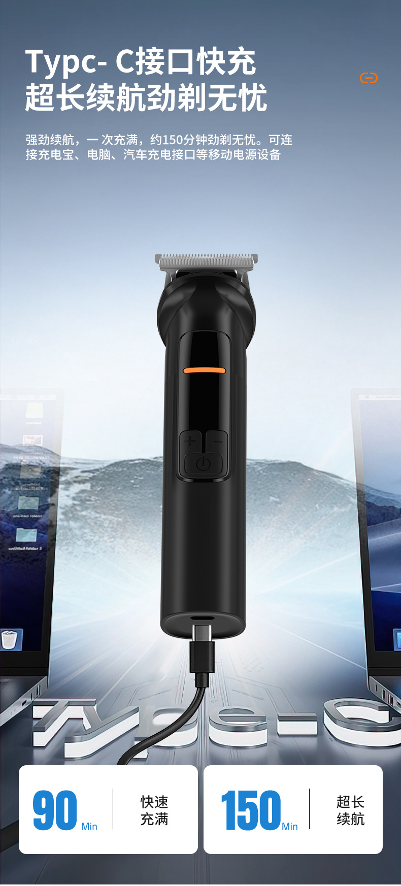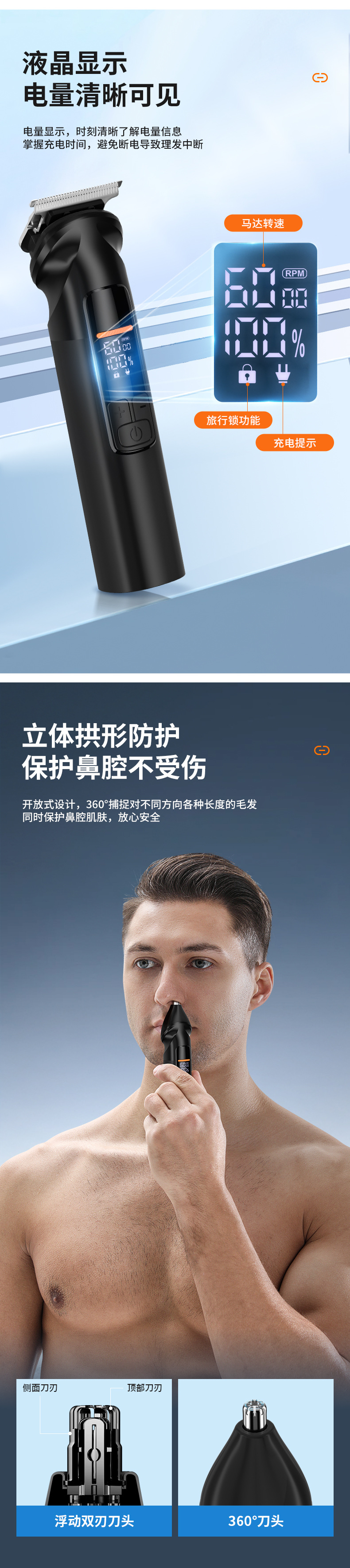 产品配件:主机+理发刀头+雕刻刀头+鼻毛修剪器+鬓角刀头+刮胡刀头+英文说明书+TYPE-C充电线+调节梳*6+清洁刷+油瓶+底座+梳子